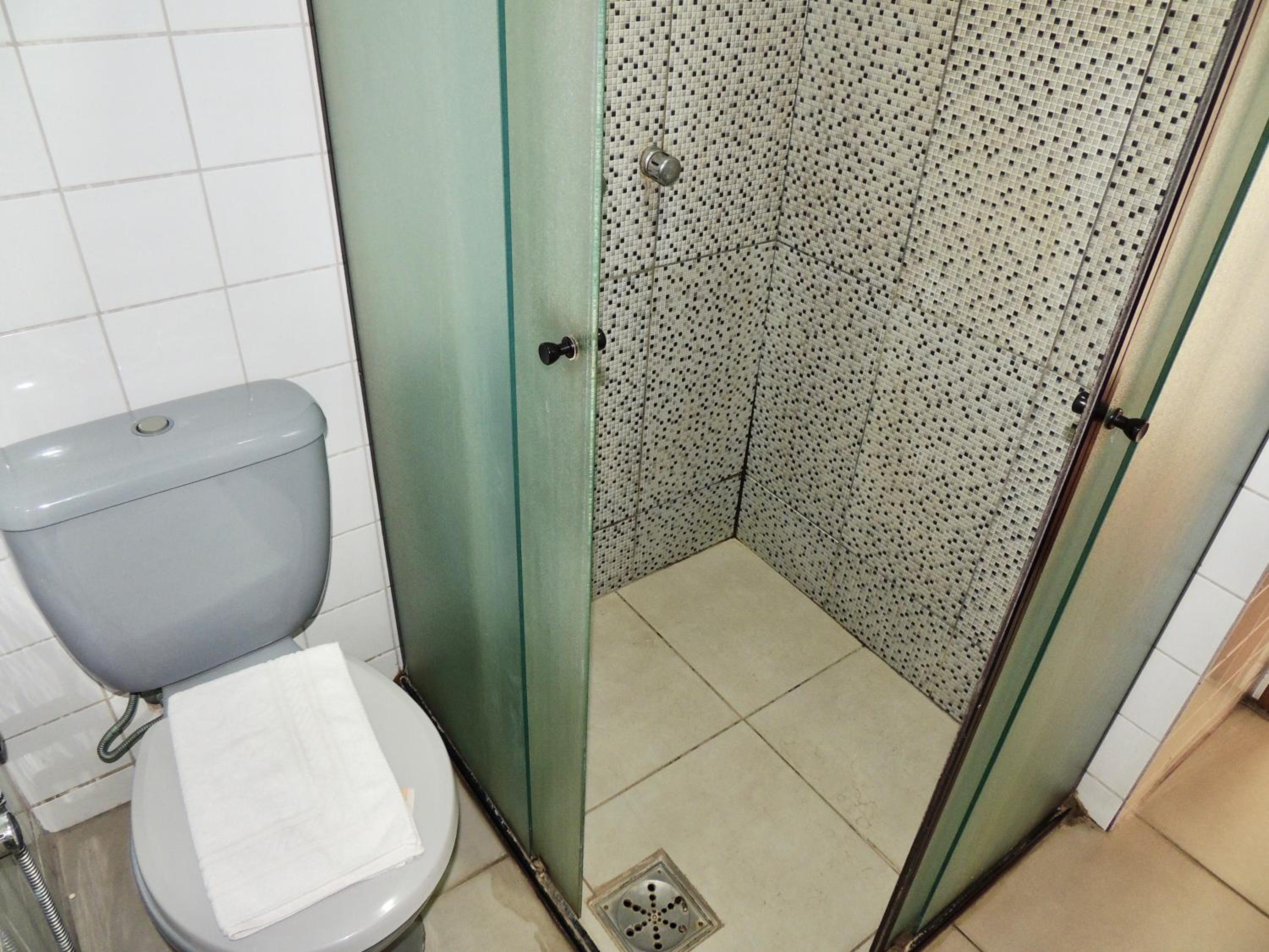 Hotel antigo, banheiro com box sem vedação, quando toma banho molha todo o banheiro
