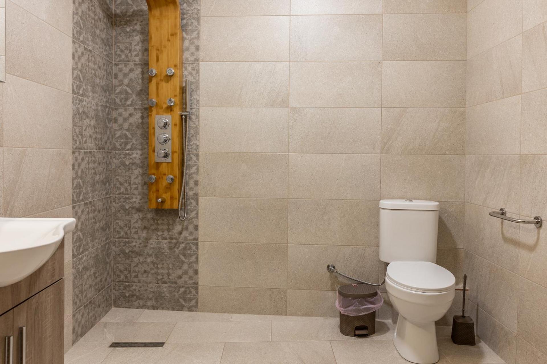 We arrived at night and the sign above the entrance is not lit. It took us a lot of time to find the place, because the street is not lit. So while searching we have found ourself in front the cemetery of Litochoro. which is located across from the accommodation. . the bathroom was too simple, and the shower was without a frame seperating it. there was no furniture to put the luggages on it, even not a table.
