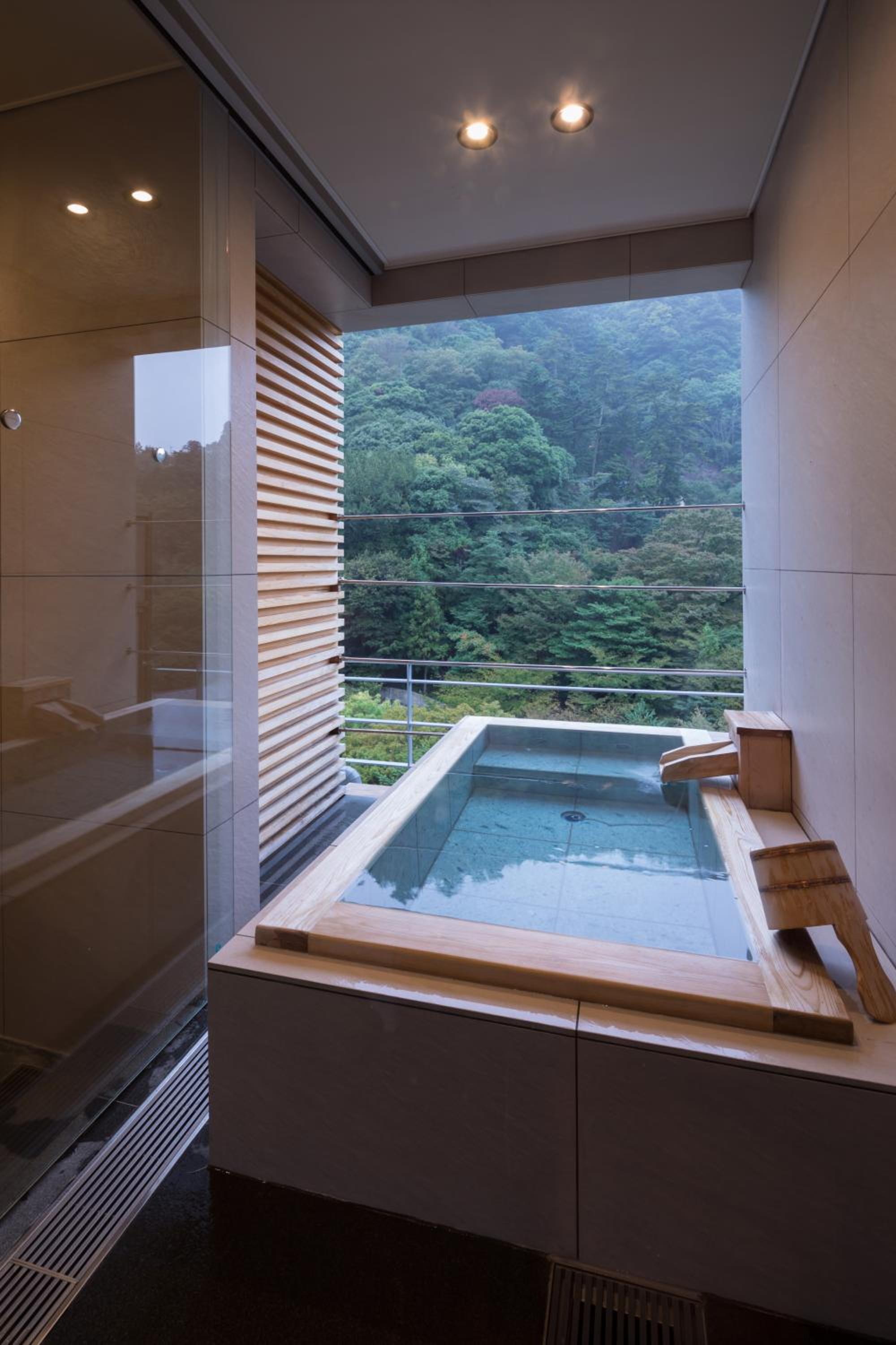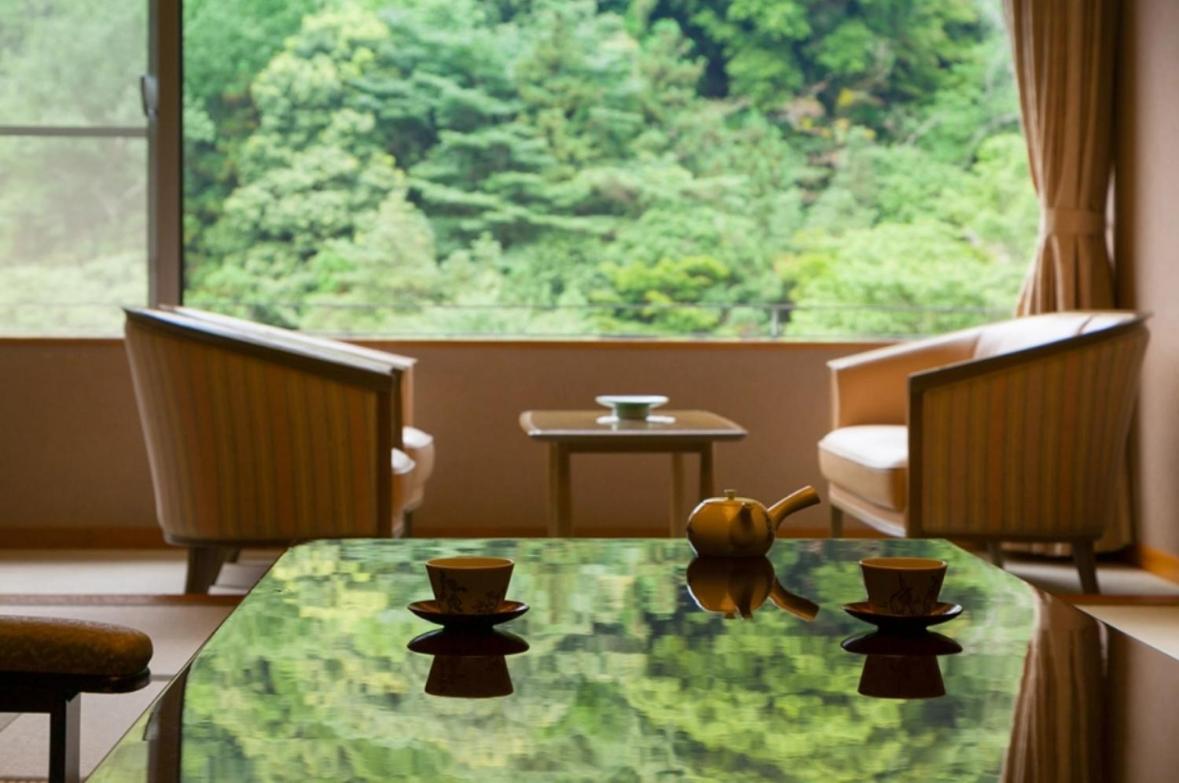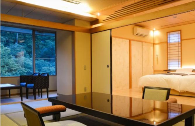 Просторный номер в японском стиле, все красиво оформлено. Очень красивый вид из окна, недалеко от станции. Ужин и завтрак в японском стиле сервируются в номере и это было интересным опытом. Нам понравилось, было вкусно. Также в отеле отличный онсен: красиво оформлено, 2 бассейна с разным типом воды: один в помещении, второй на открытом воздухе с красивым видом. Также в онсене есть сауна, а снаружи в комнате отдыха массажные платформы для ног и чай. В номере есть юкаты , тапочки и носки, чтобы ходить по отелю.
