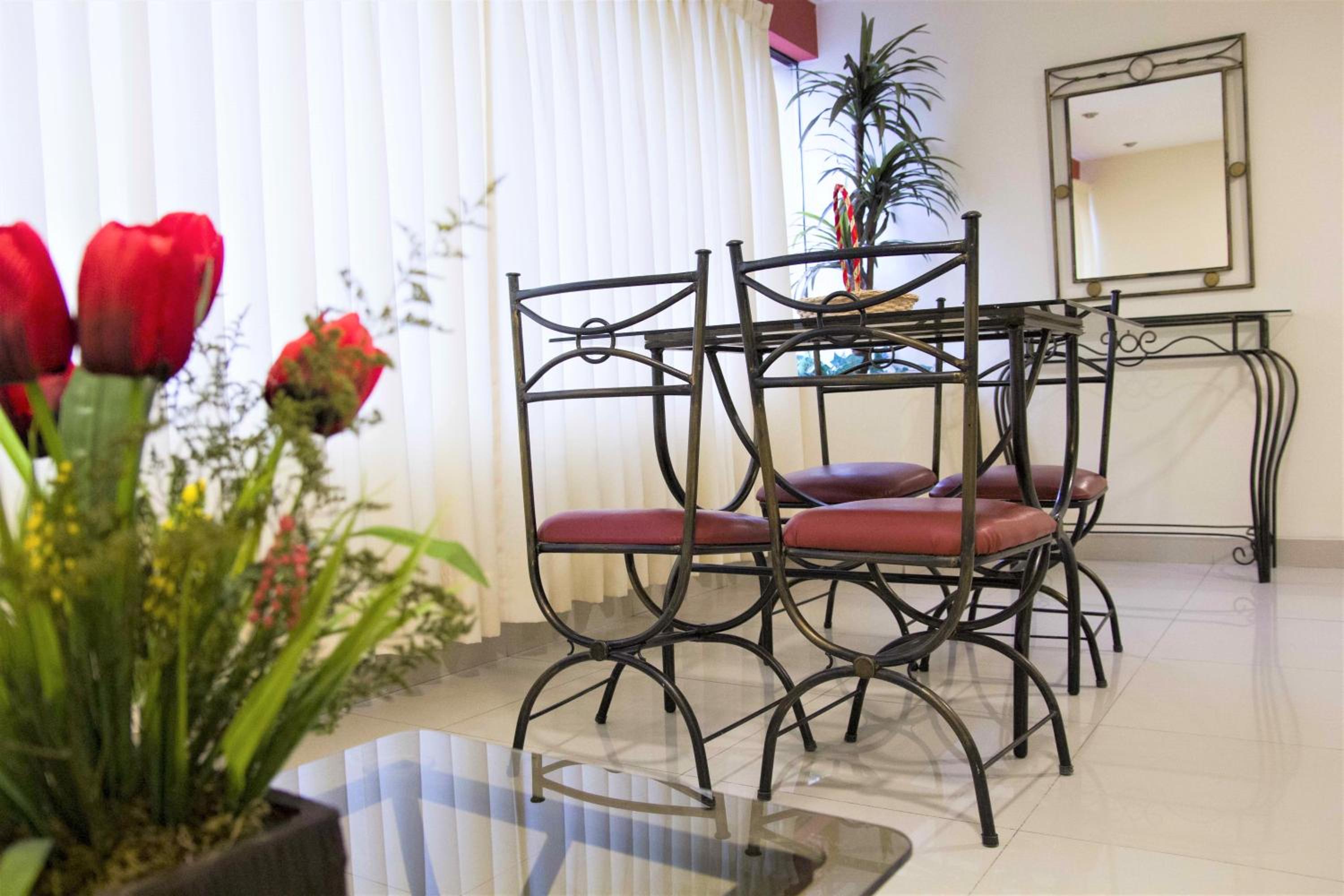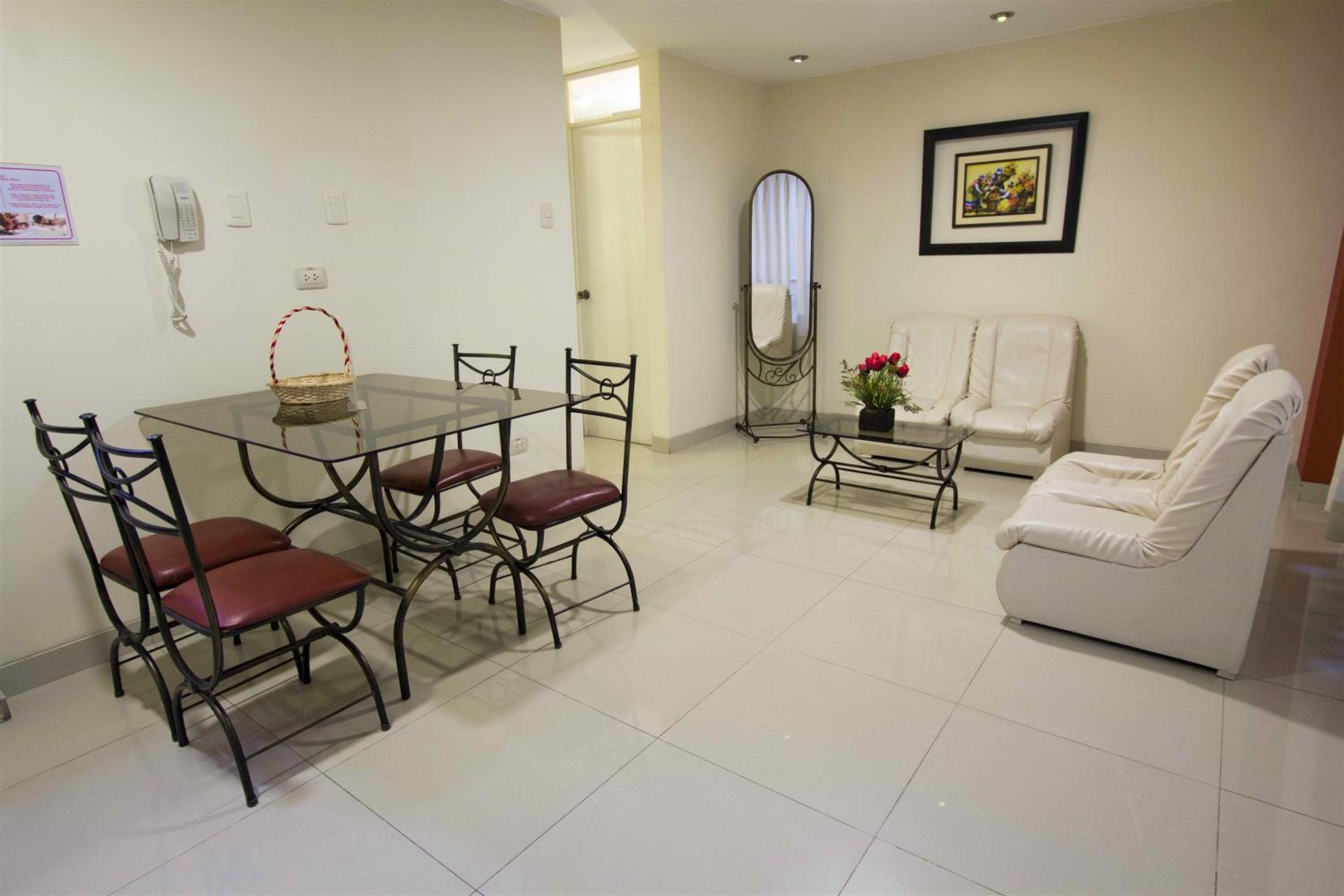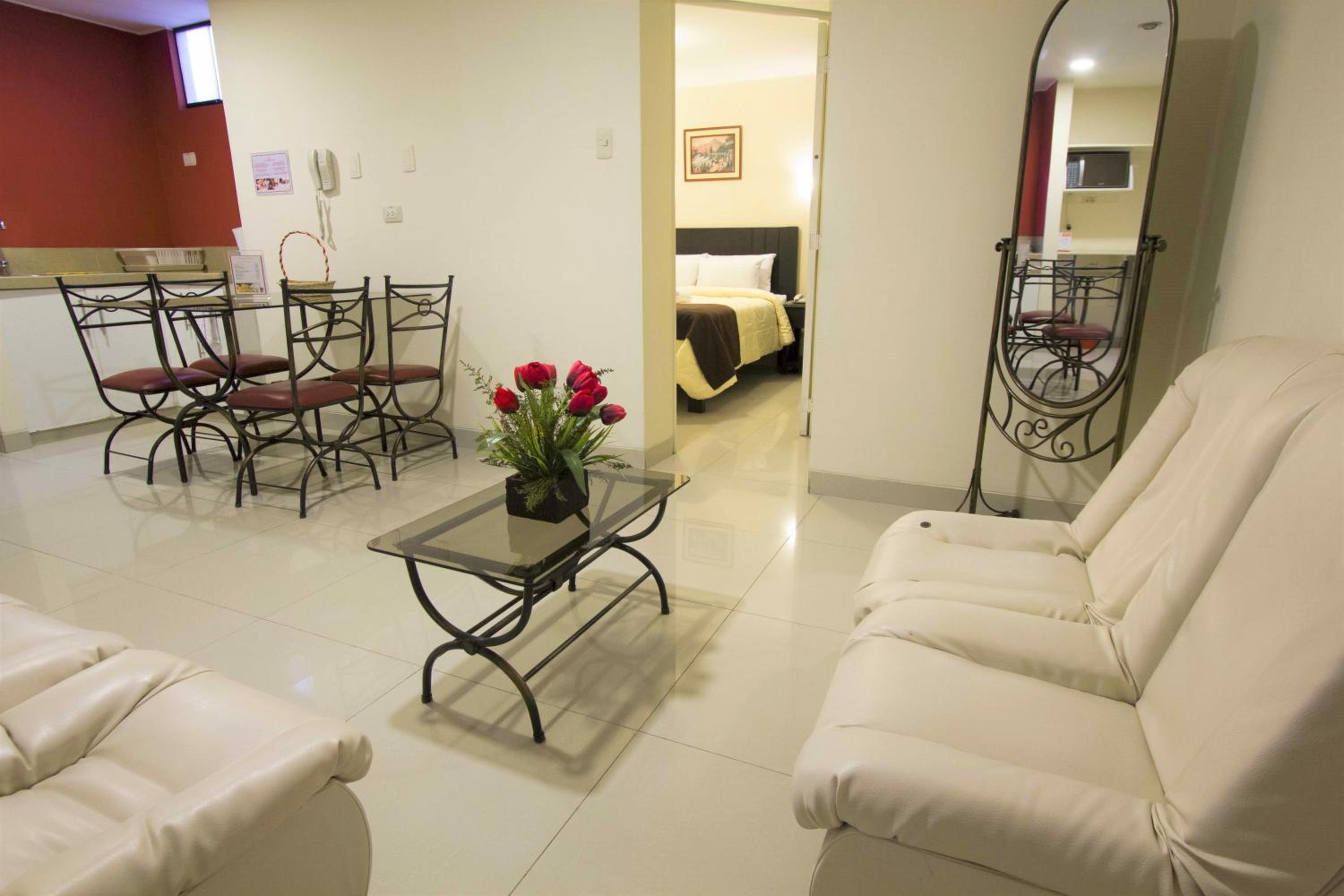 Experience a homely stay in our well-appointed apartments featuring large windows, dining areas, and kitchenettes equipped with modern amenities such as a microwave and coffee maker. Relax in the spacious seating areas while enjoying entertainment on the flat-screen TV.
