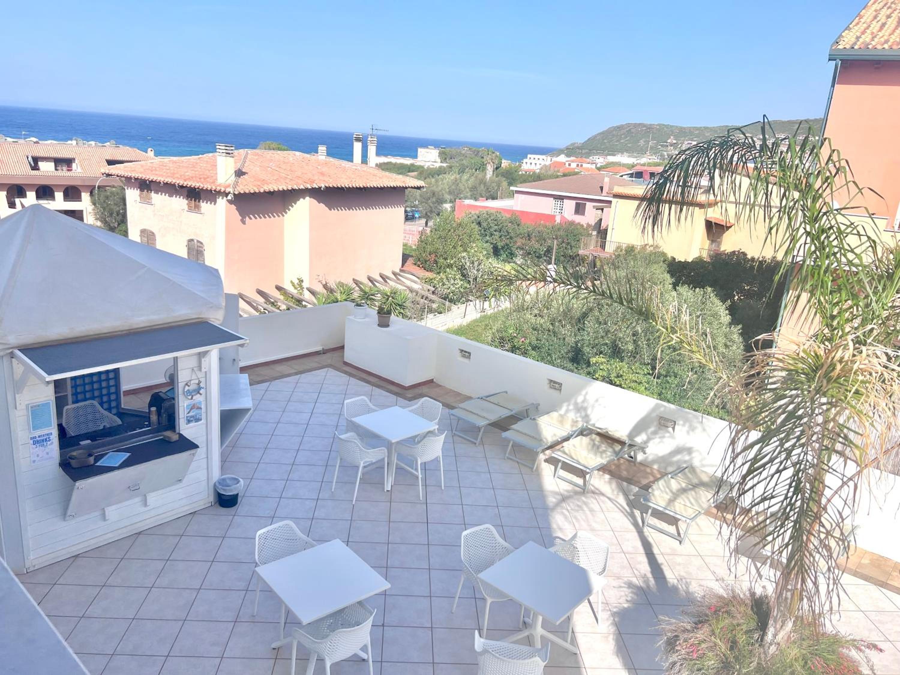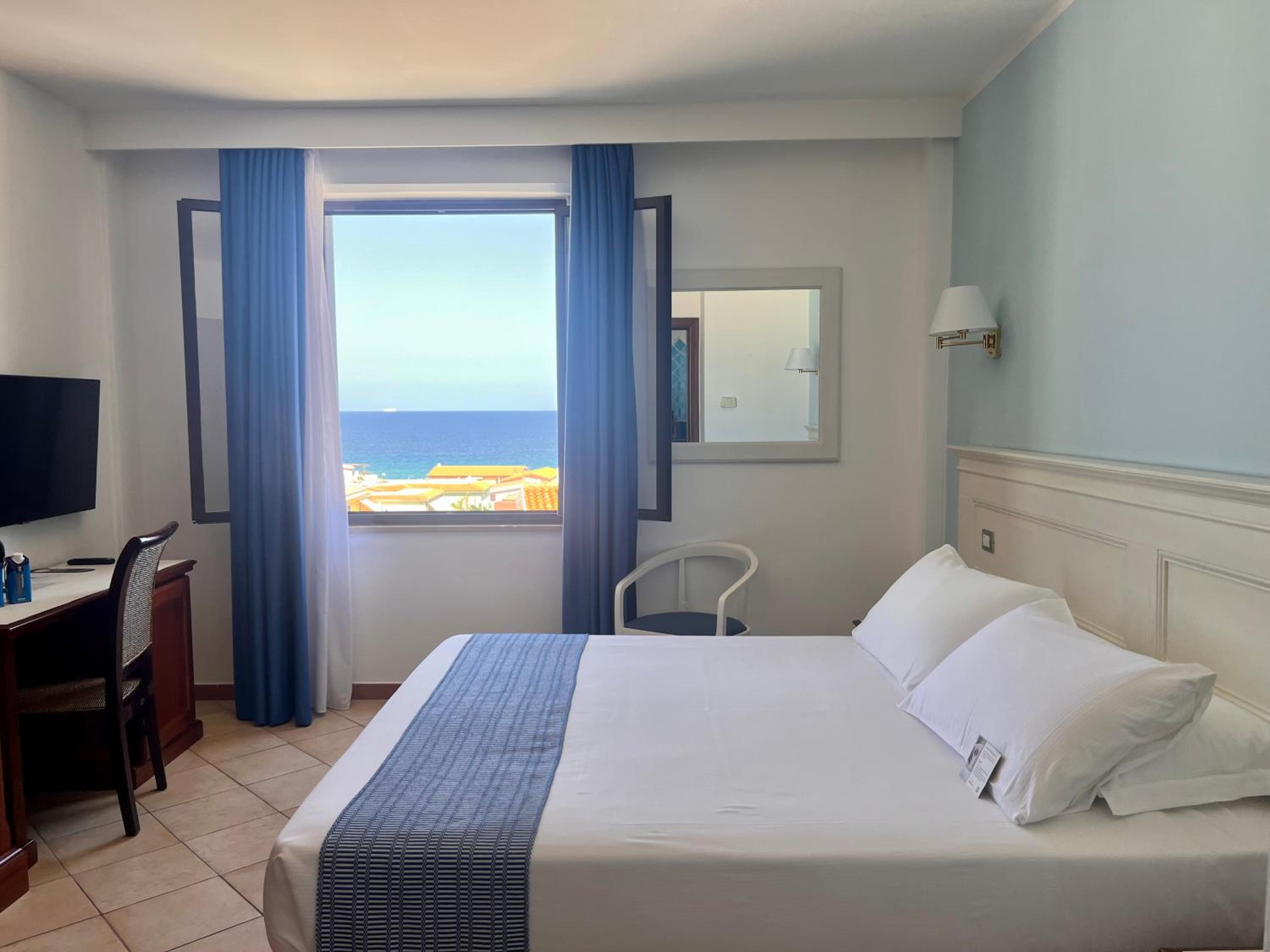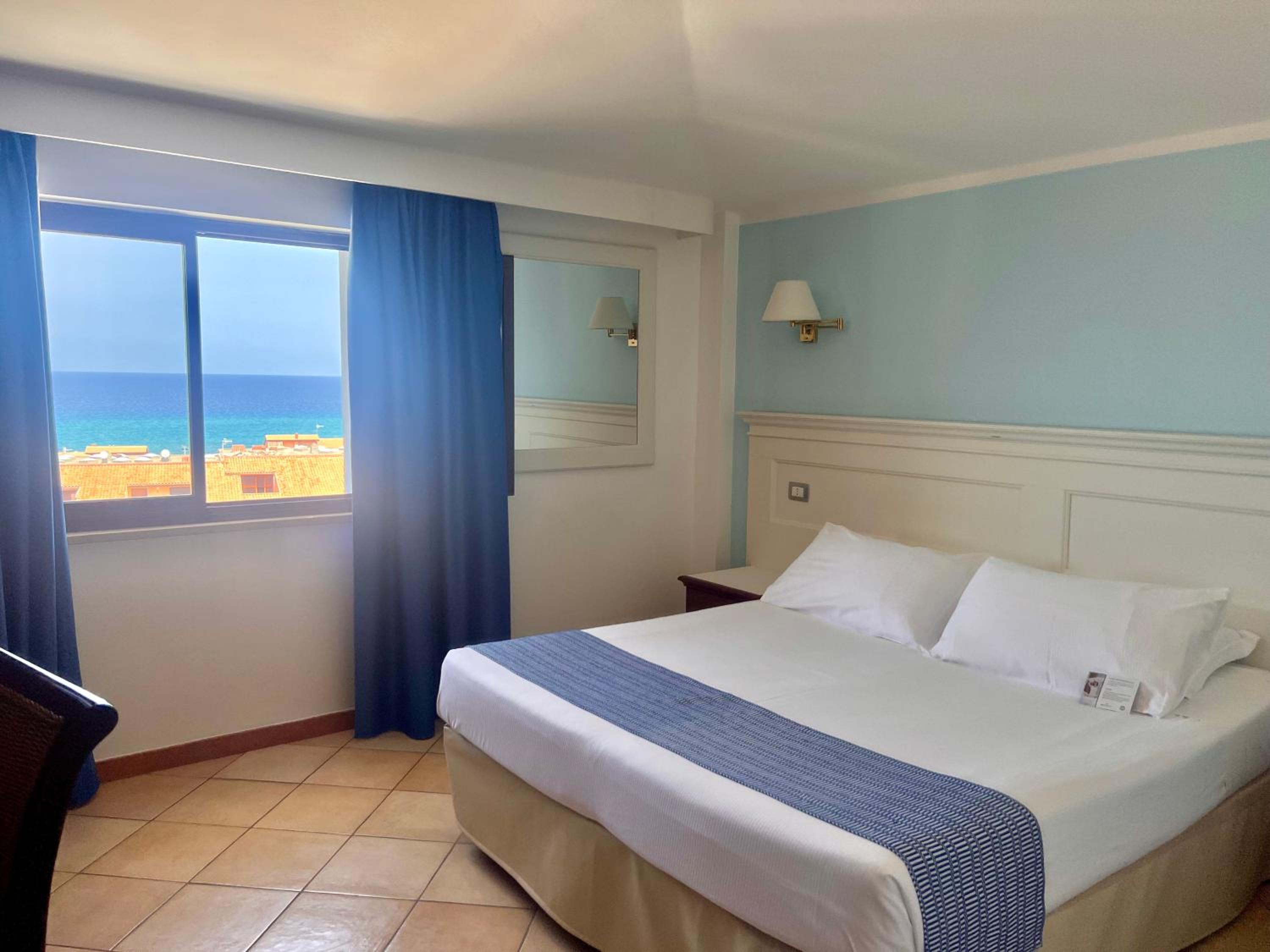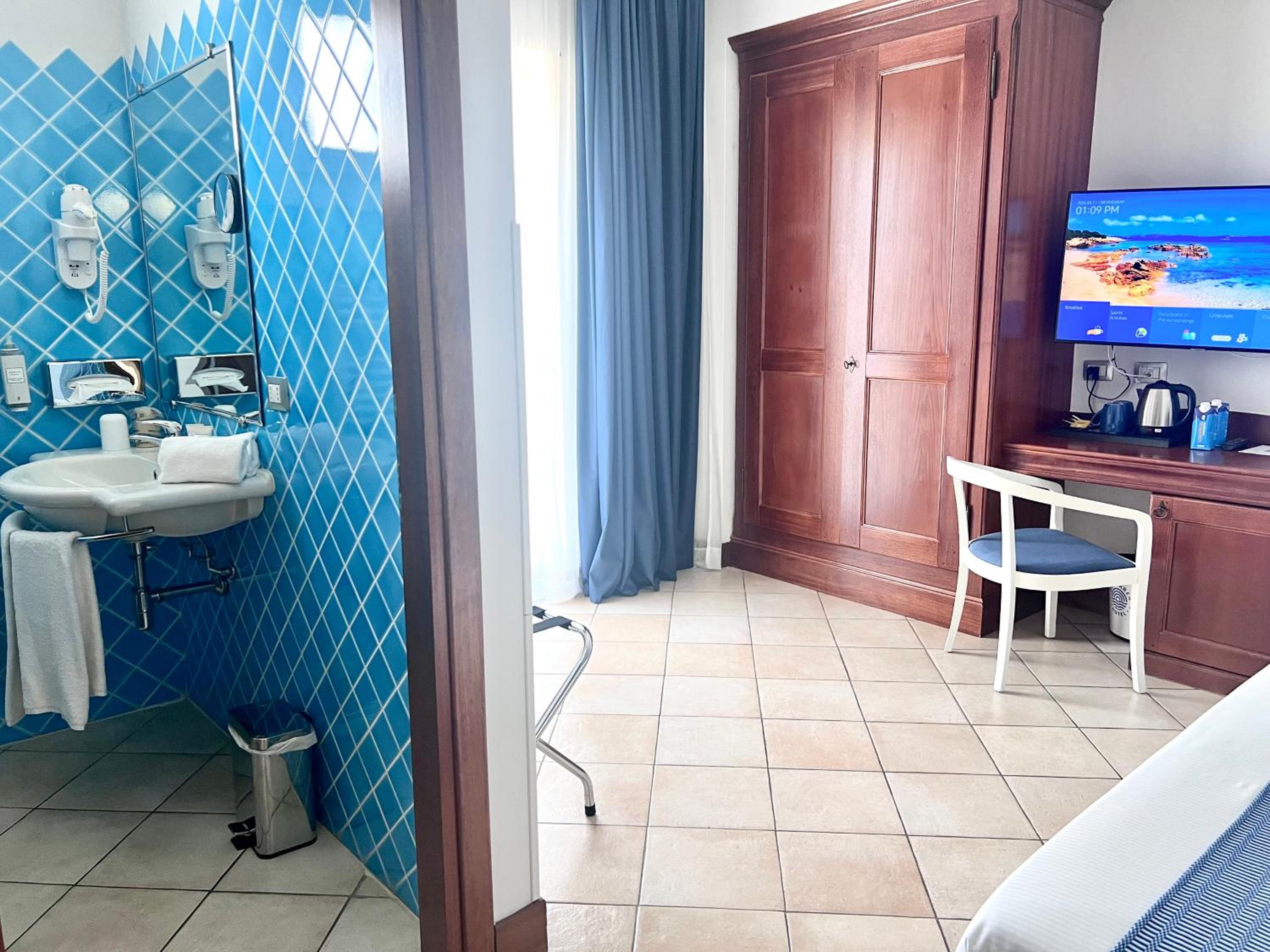 Indulge in the comfort of our air-conditioned rooms featuring satellite TV, a minibar, and a private bathroom. Upgrade to a room with a balcony for breathtaking views of the Sardinian Sea.