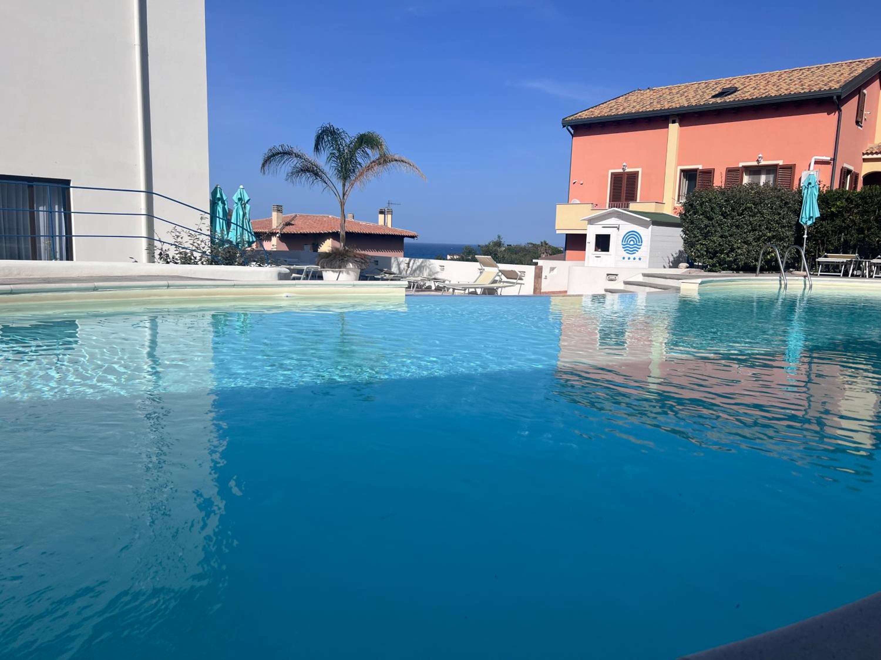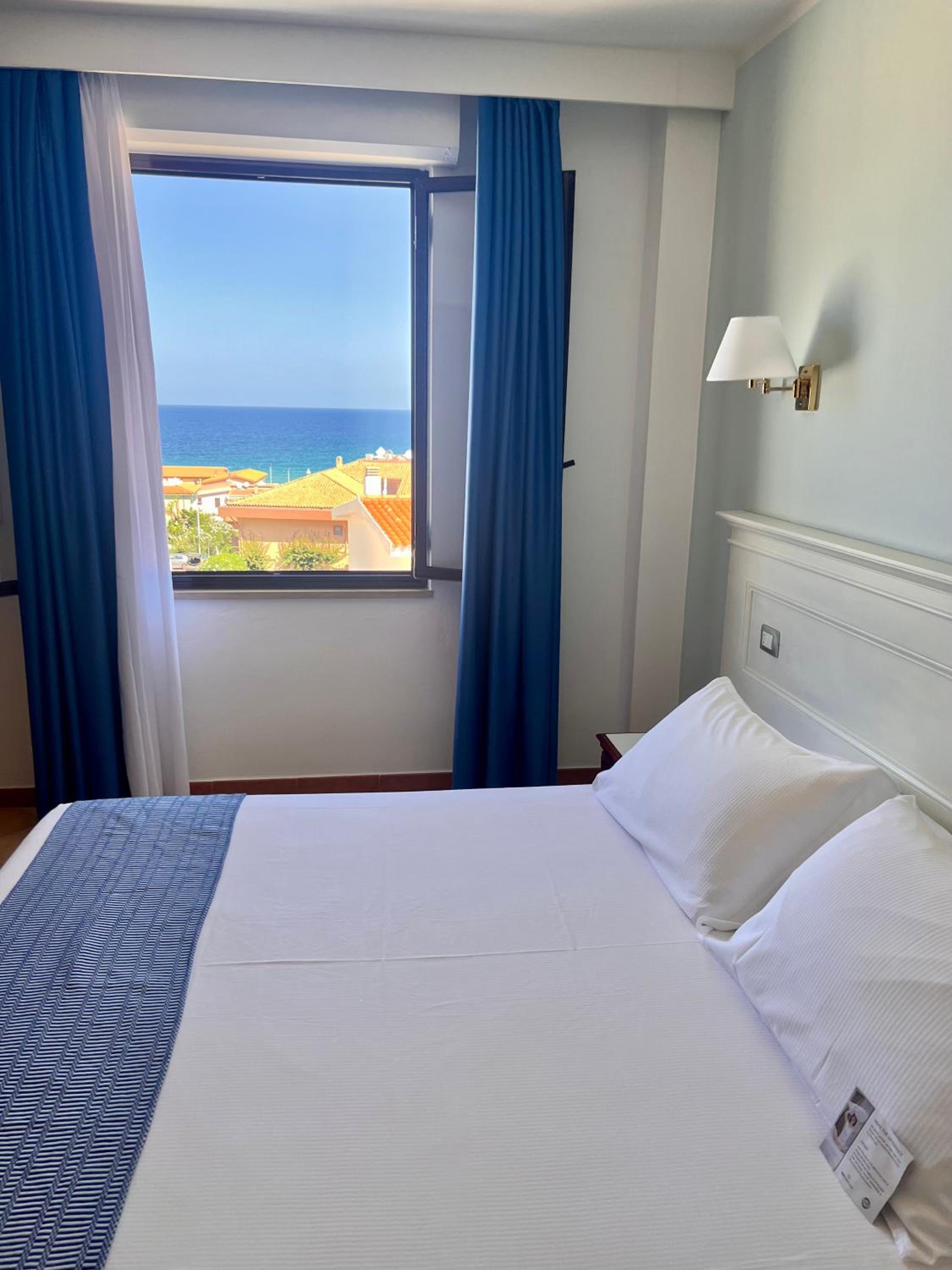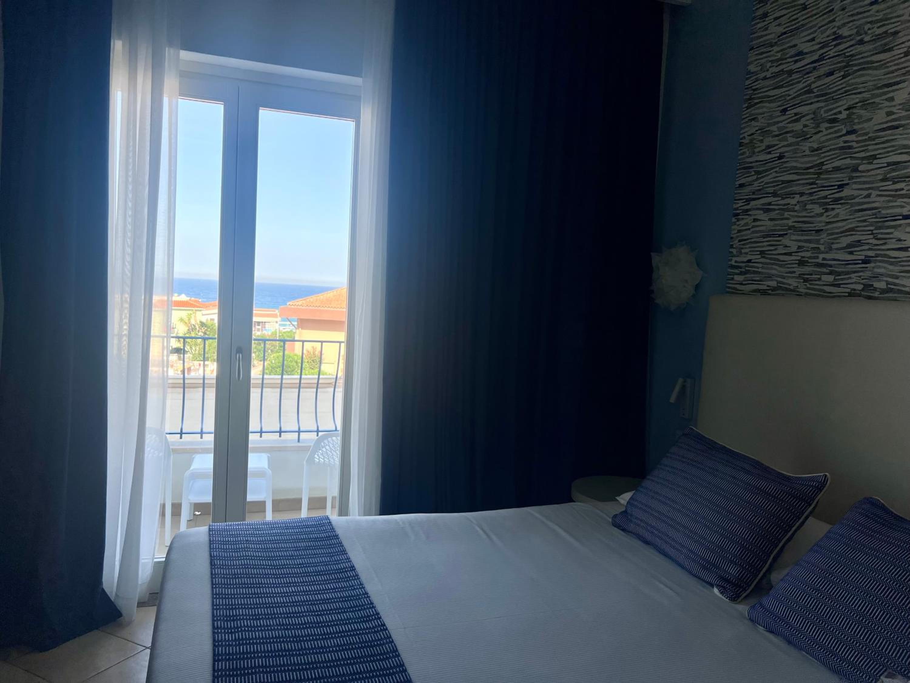 Il comfort della camera con vista mare, la piscina, lo staff alla reception