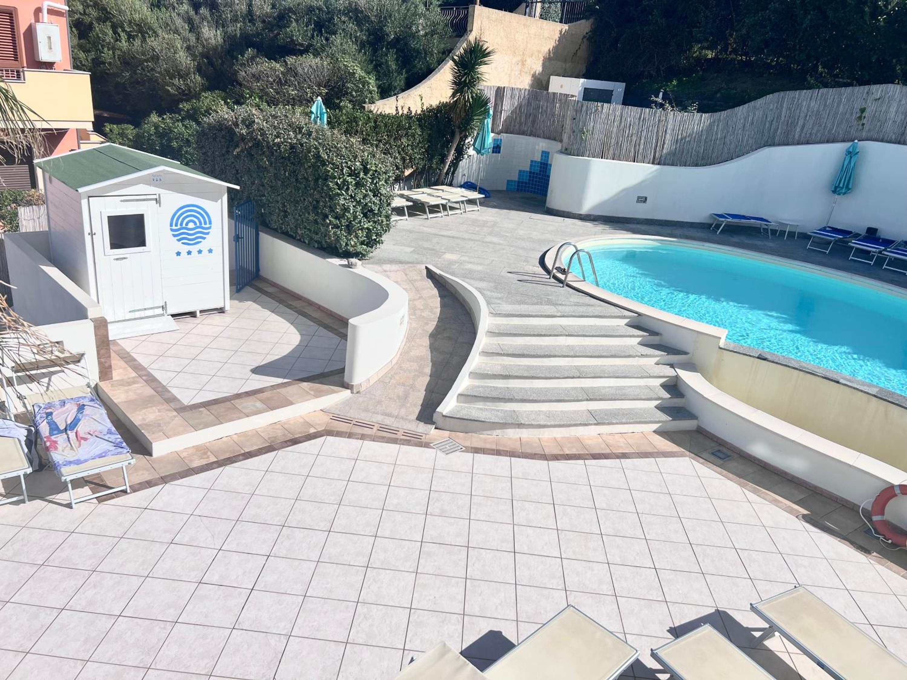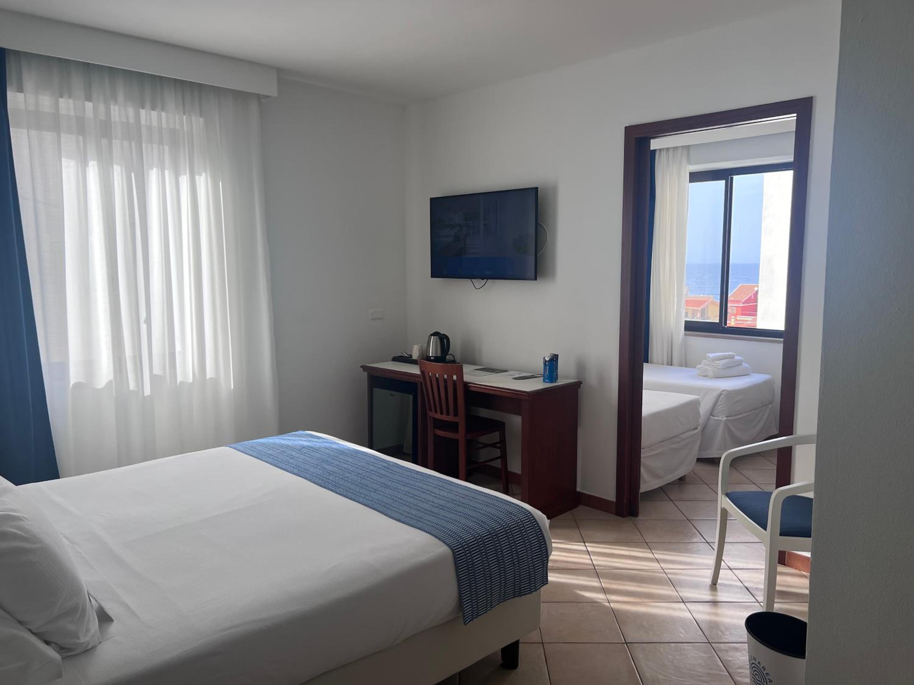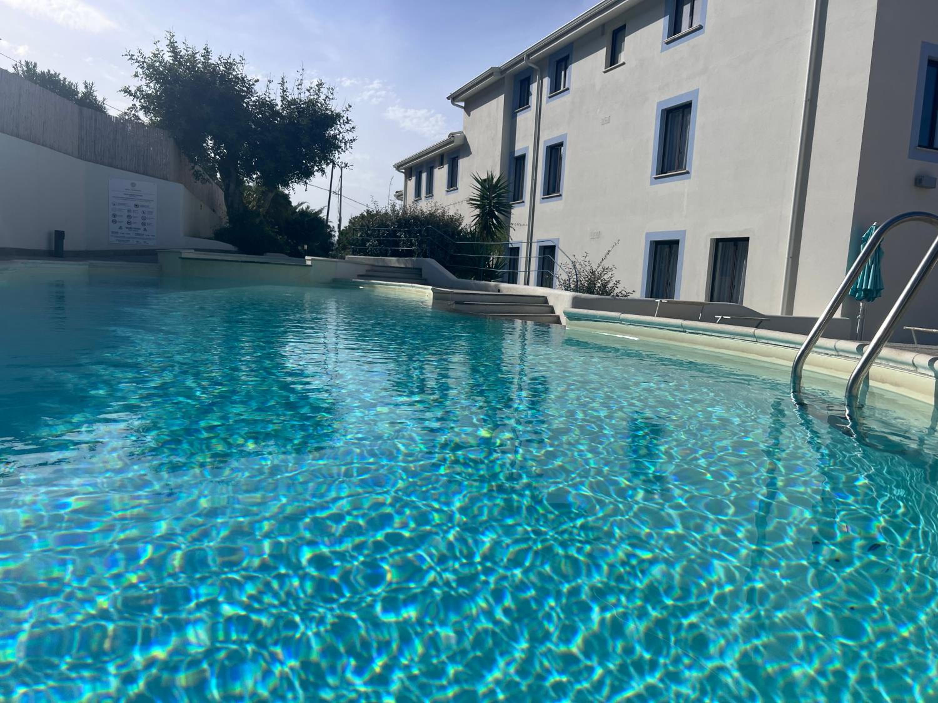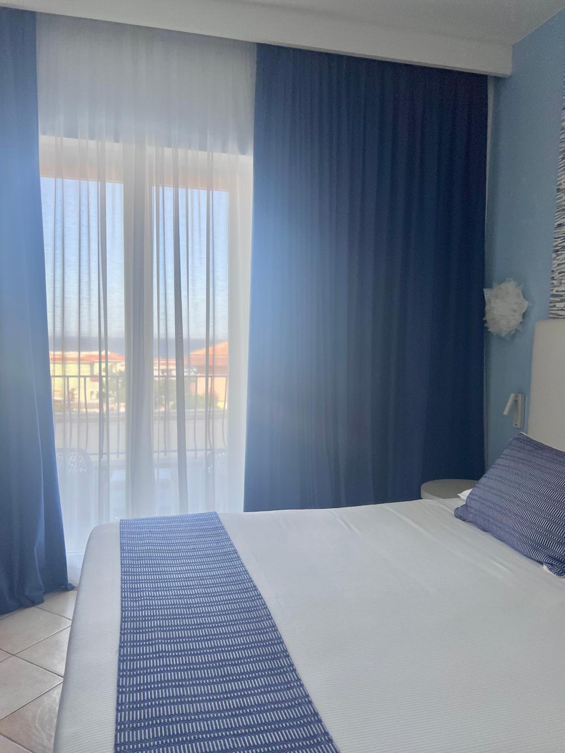 Il comfort della camera con vista mare, la piscina, lo staff alla reception