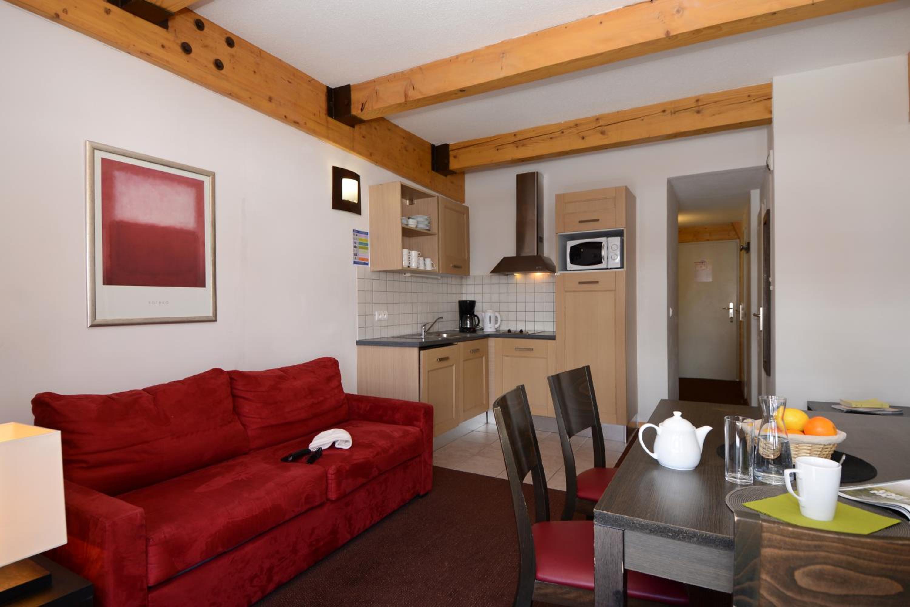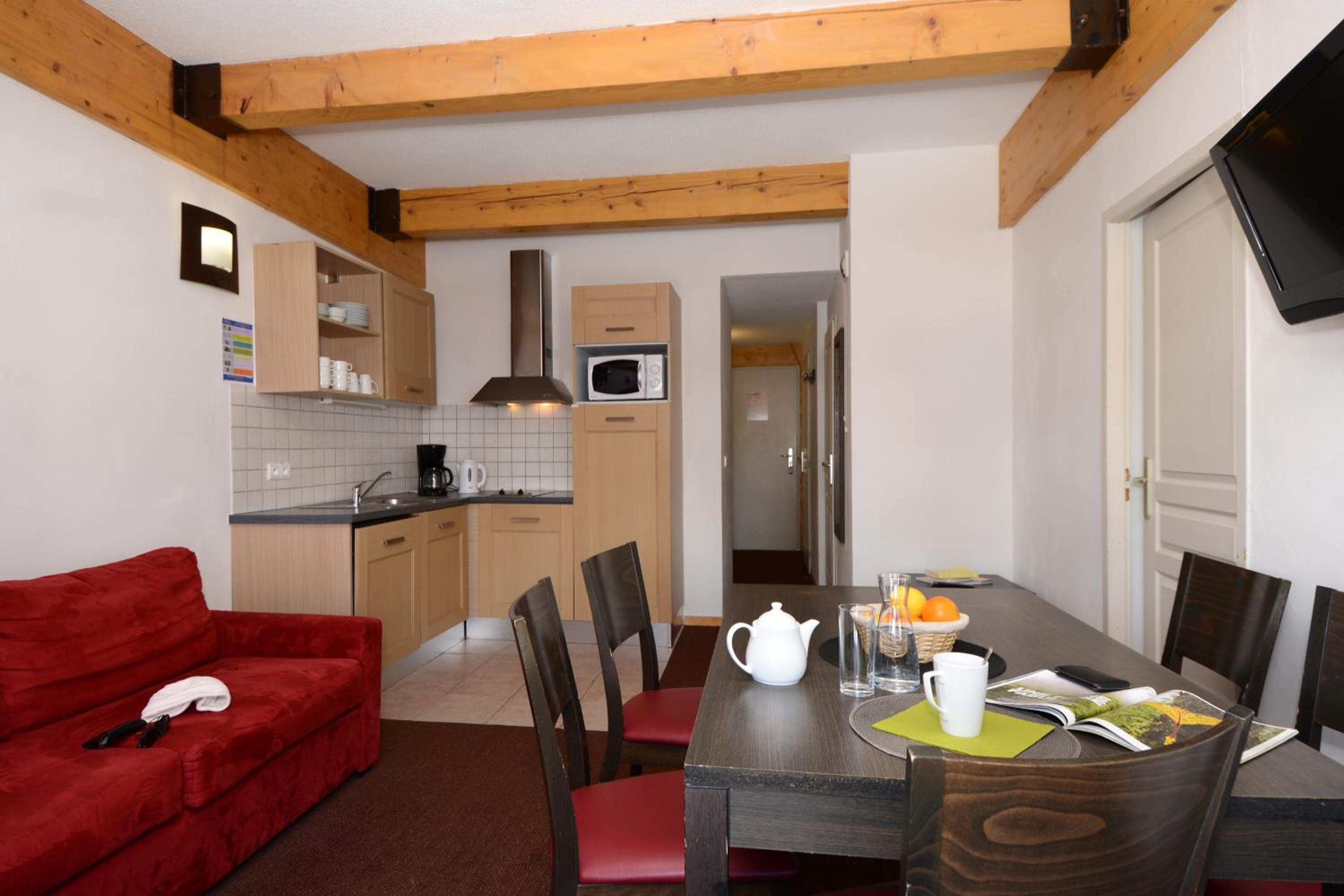 Residence Odalys Le Pelvoux offers spacious furnished apartments with terraces or balconies, ideal for families or groups of up to 8 people. Each apartment features a fully equipped kitchen with modern amenities for a comfortable stay.