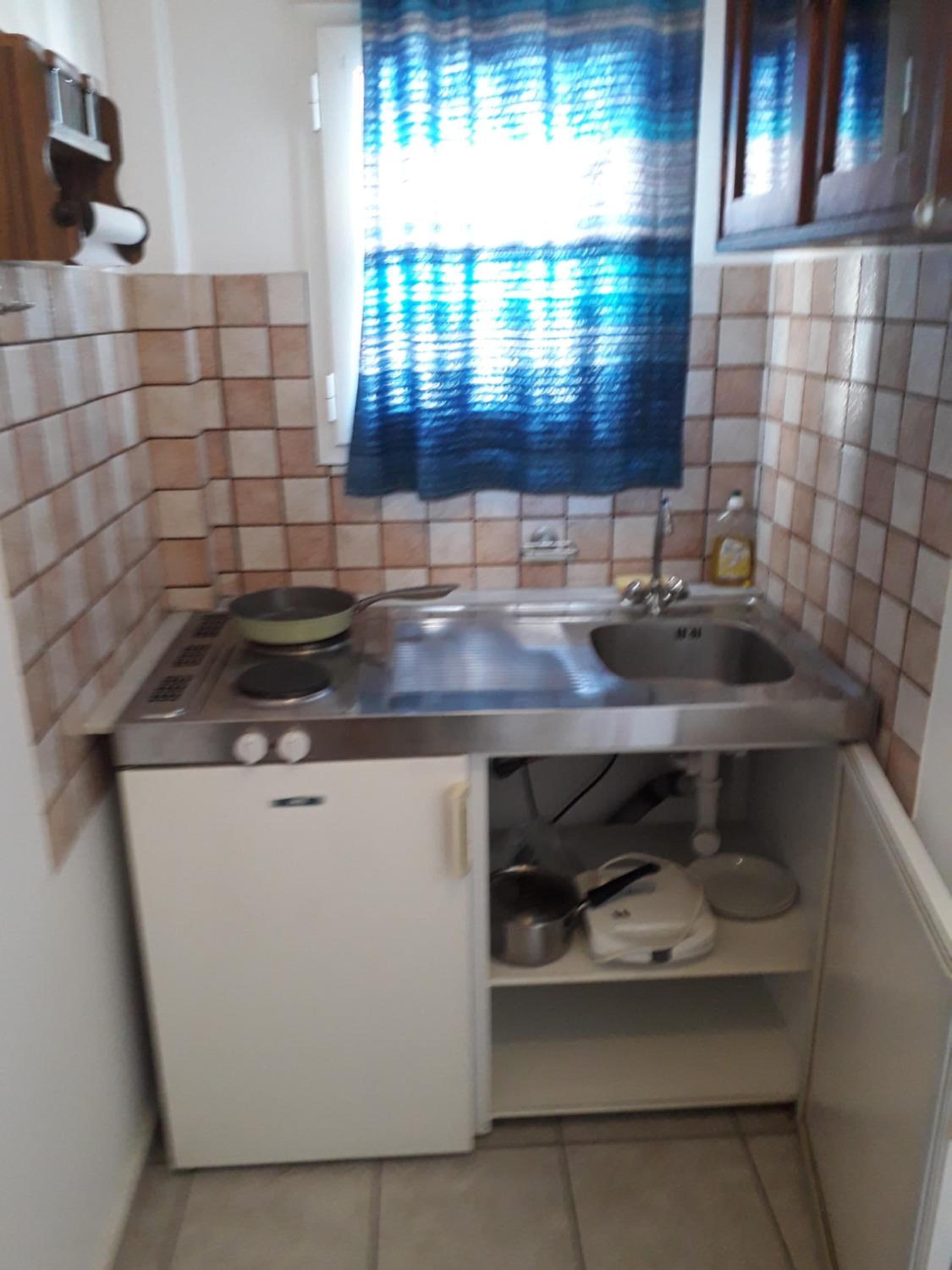 Kuhinja opremljena le s ploščo, malo posode.