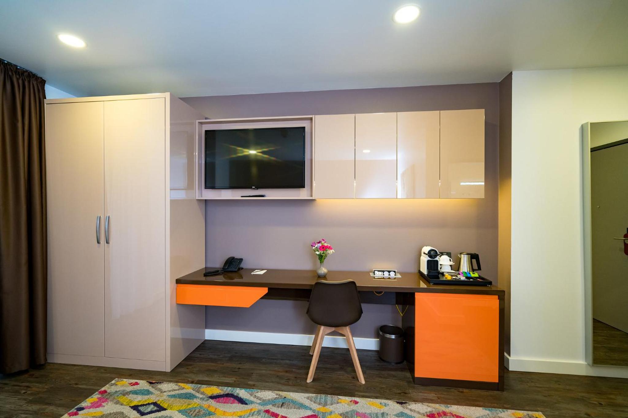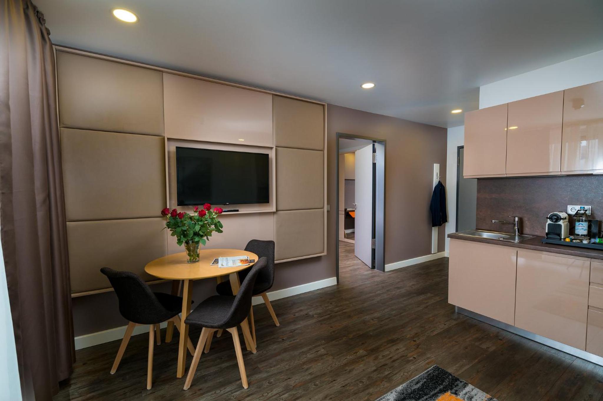 Experience the ultimate comfort at Kreis Residenz München with air-conditioned rooms featuring satellite flat-screen TVs and modern amenities like a dishwasher and coffee machine.