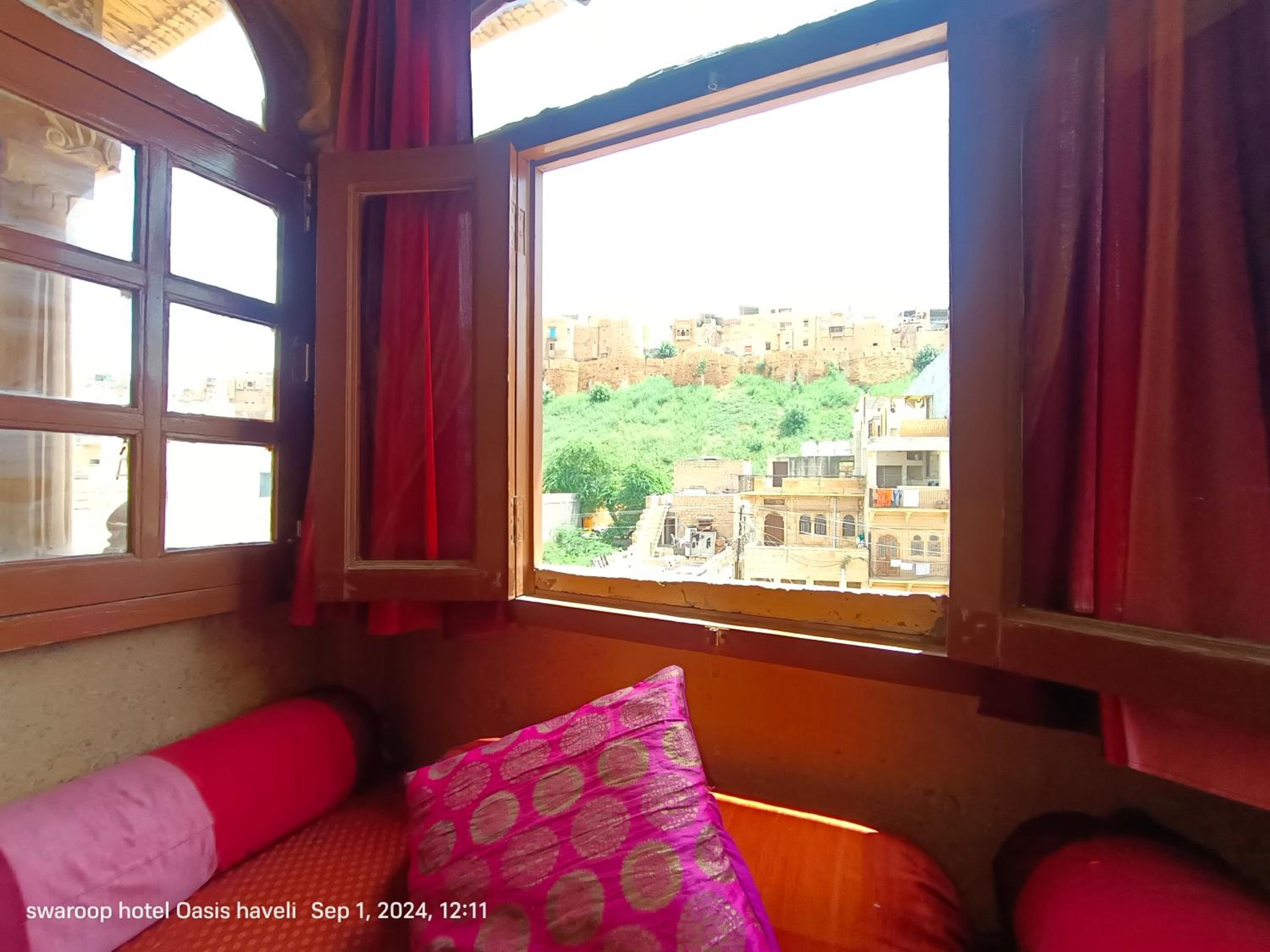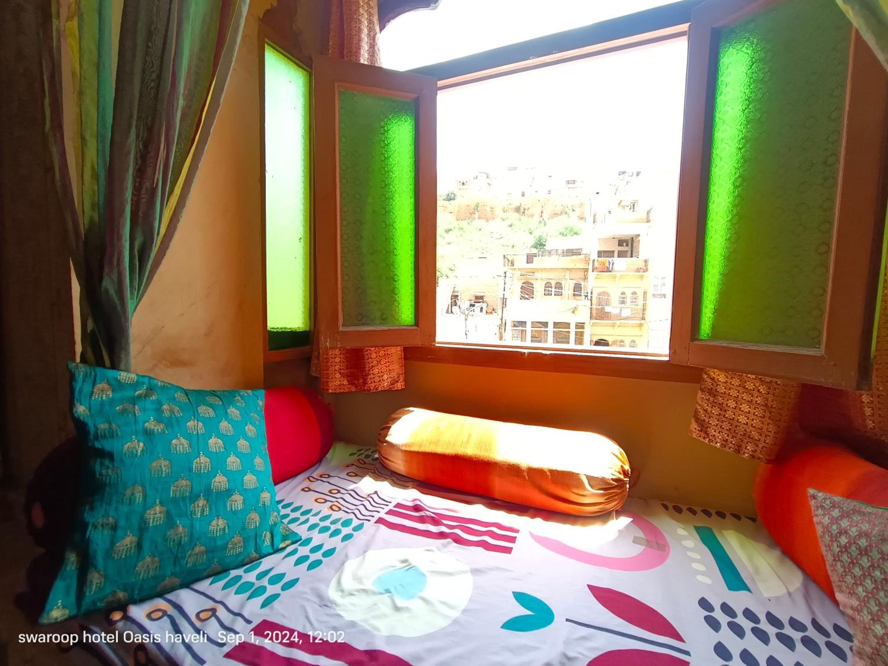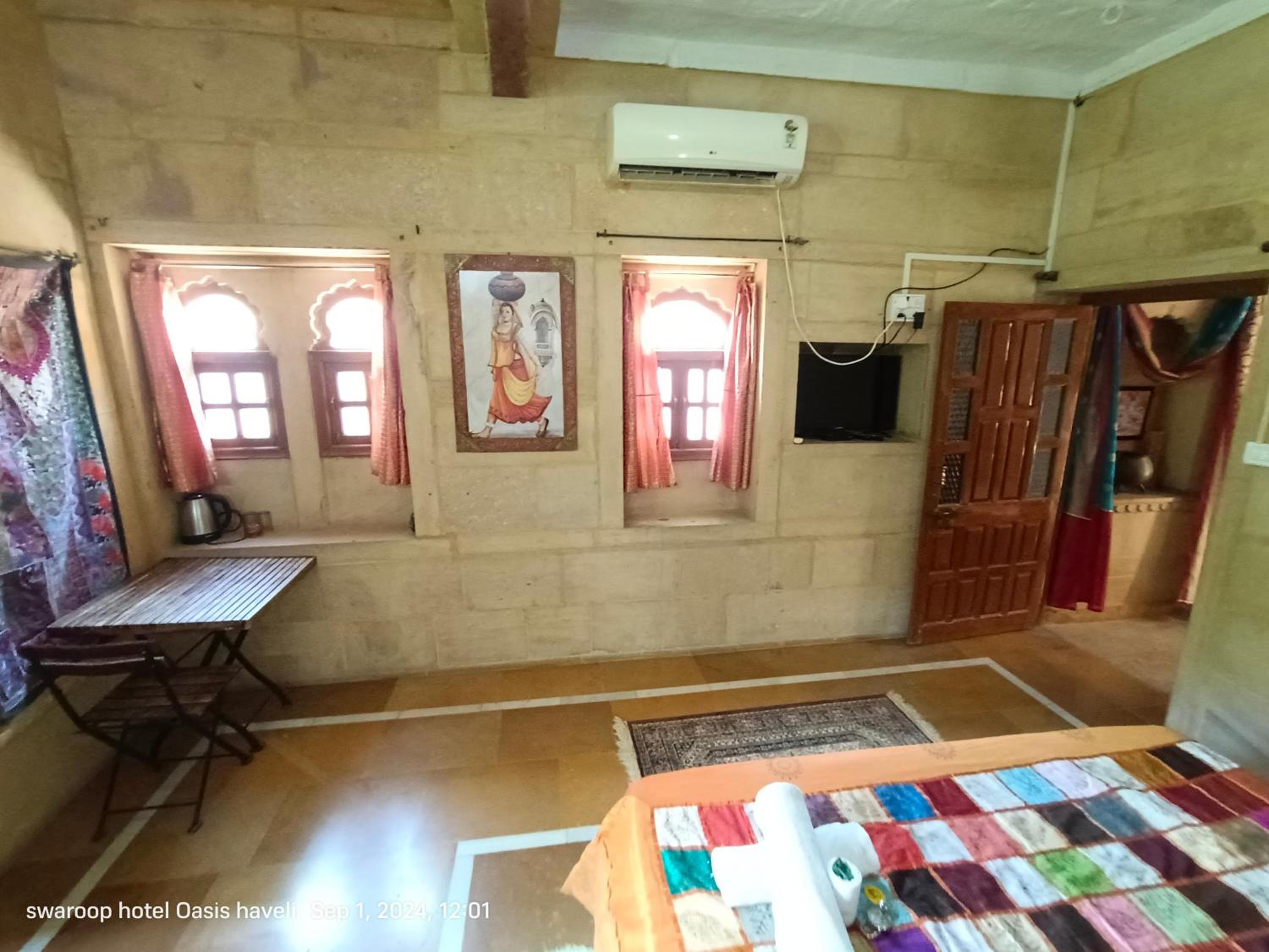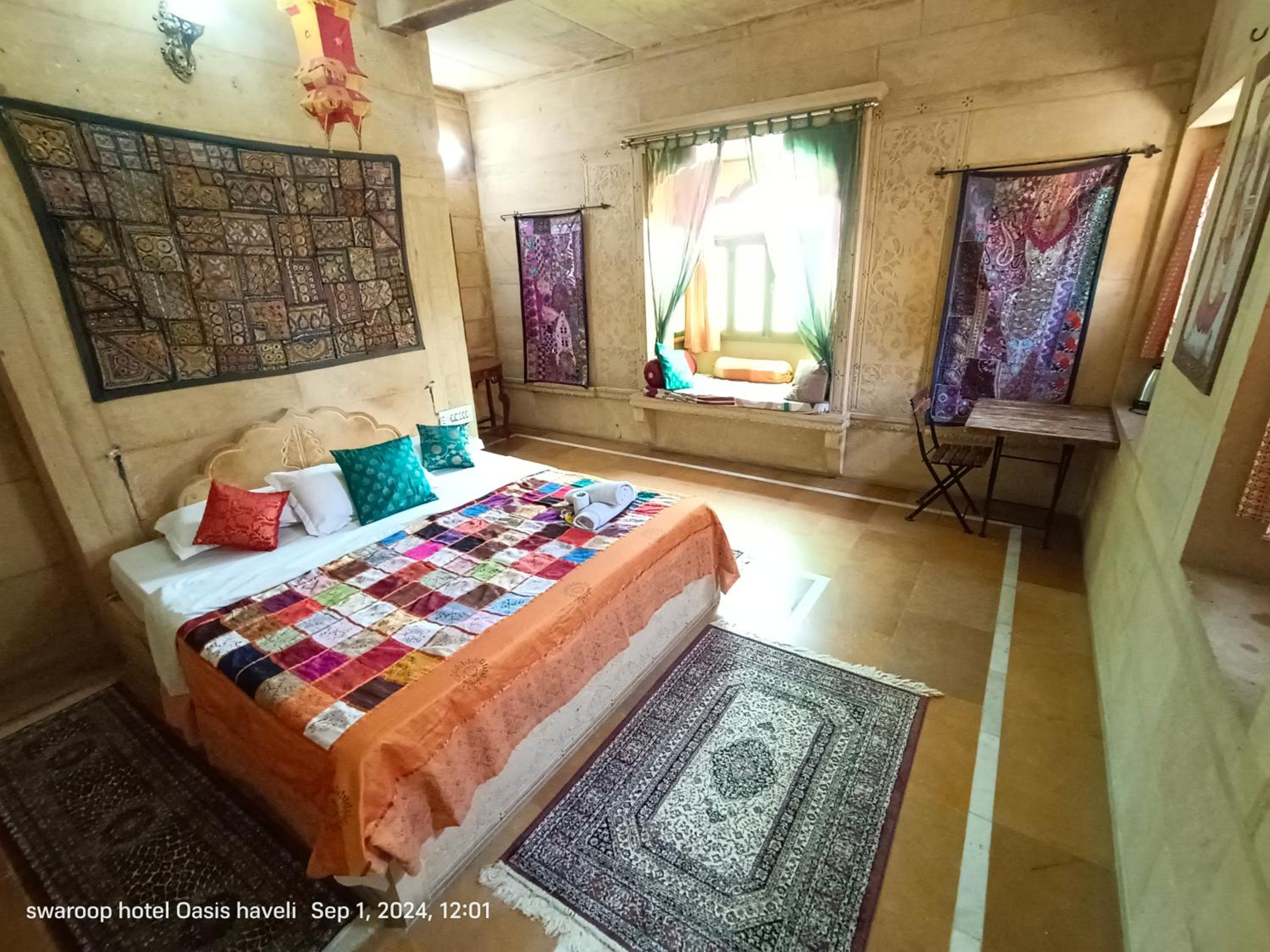 We had booked a basic room for 1 night, but the kind owner upgraded us to a cute room with a bigger bathroom, for our comfort, he added. No extra cost. Everything was good, the bathroom was quite big for Indian standards, and the bed was very comfortable and clean. We enjoyed our 1 night stay at Oasis Haveli and will come back for a longer stay in a different room, this time. Some of their rooms are absolutely gorgeous in the lical style. The owner is a sweet man, his staff is so very friendly and helpful. They make you feel like family. The Jaisalmer hospitality is absolutely great. Our room had no window, but we didn't mind as we only stayed the night. Breakfast is à la carte on the rooftop, where you get a wonderful view of the fort. You can also use their taxi service: their driver took us to our accommodation in the desert and picked us up for a very decent price compared to others.