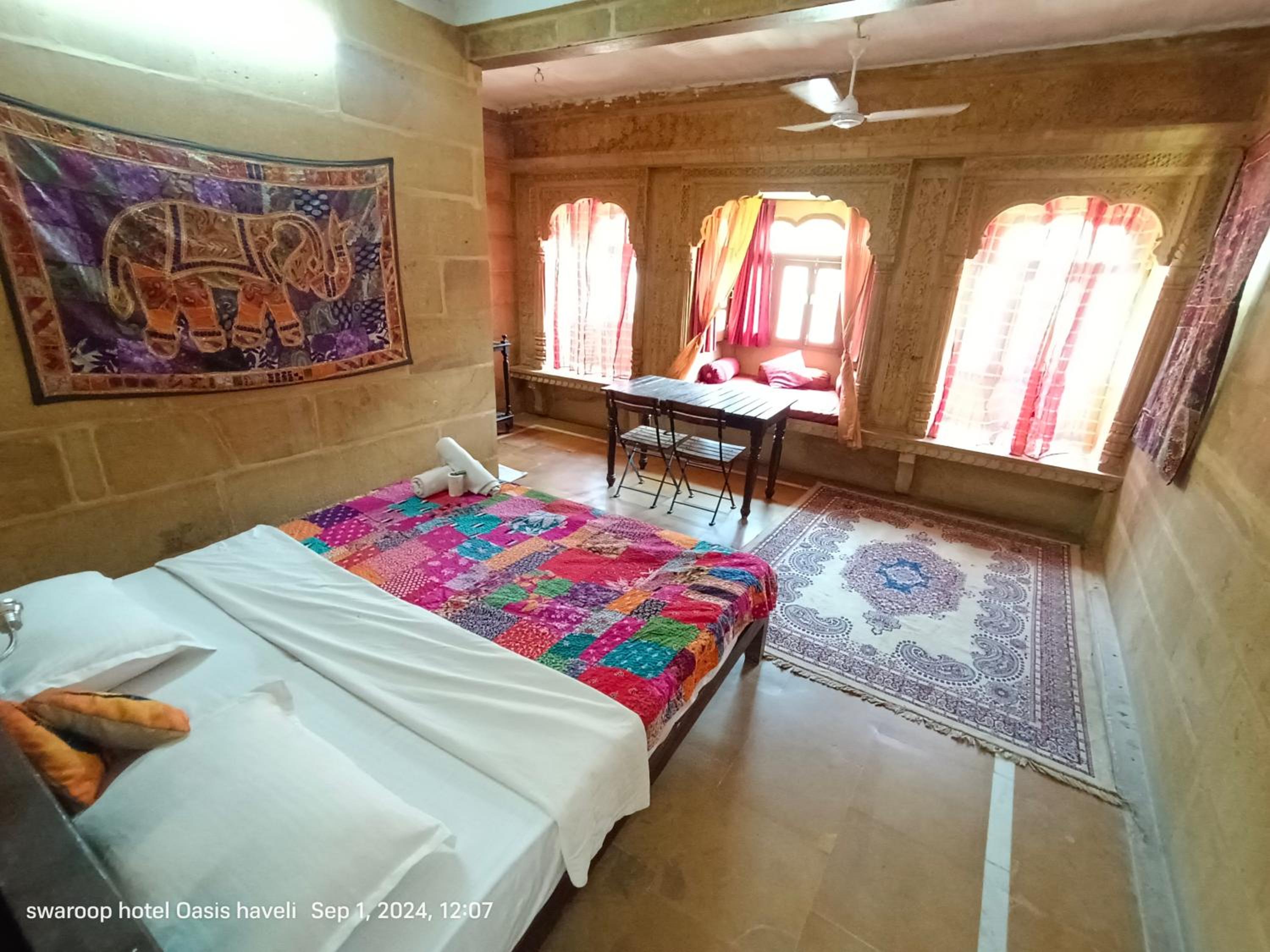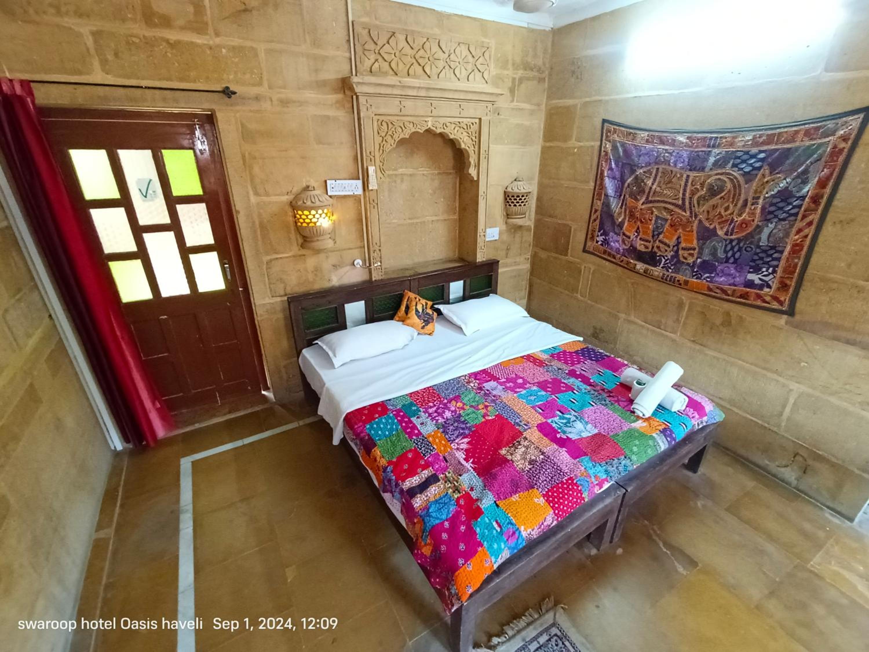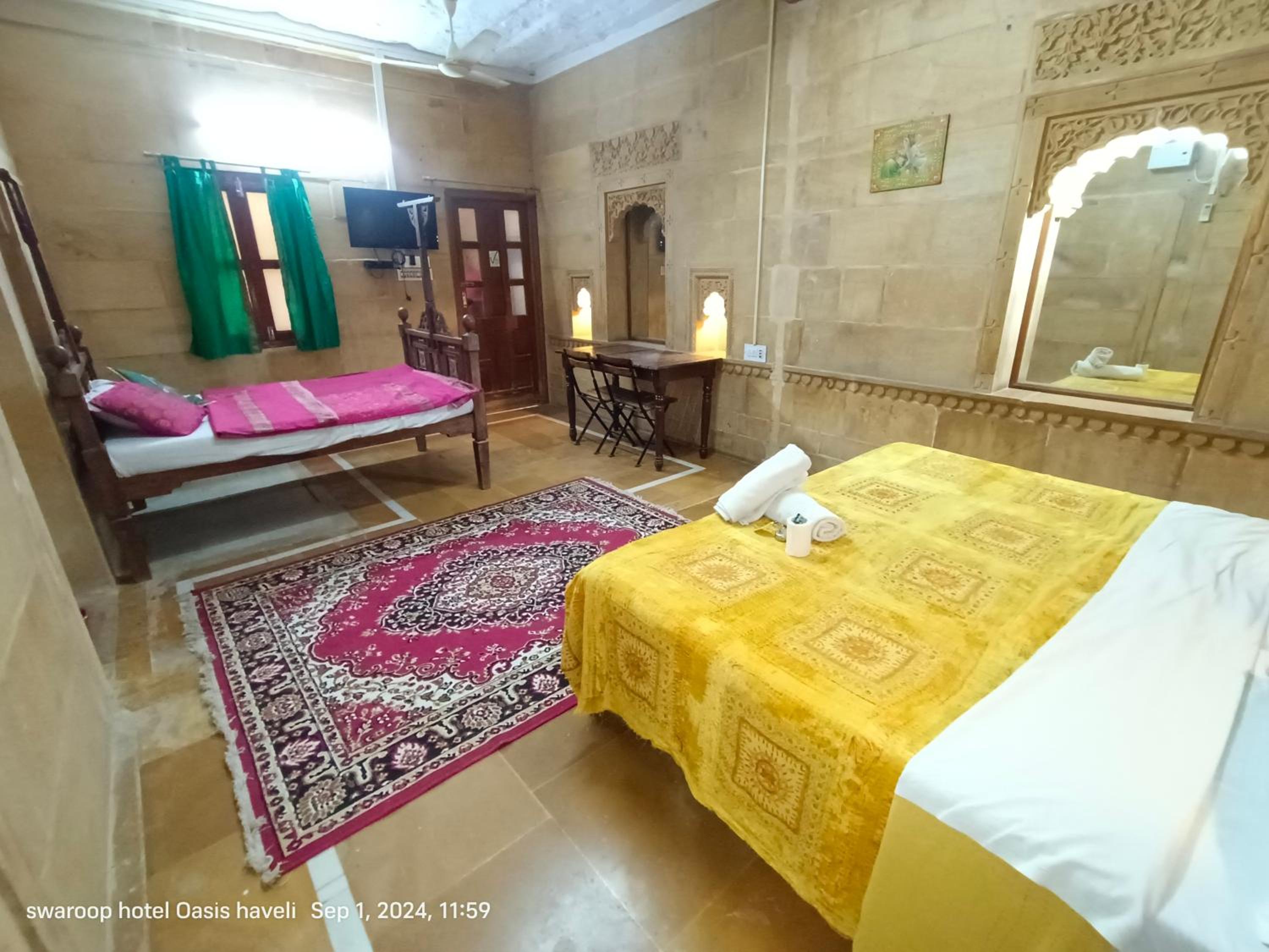 We had booked a basic room for 1 night, but the kind owner upgraded us to a cute room with a bigger bathroom, for our comfort, he added. No extra cost. Everything was good, the bathroom was quite big for Indian standards, and the bed was very comfortable and clean. We enjoyed our 1 night stay at Oasis Haveli and will come back for a longer stay in a different room, this time. Some of their rooms are absolutely gorgeous in the lical style. The owner is a sweet man, his staff is so very friendly and helpful. They make you feel like family. The Jaisalmer hospitality is absolutely great. Our room had no window, but we didn't mind as we only stayed the night. Breakfast is à la carte on the rooftop, where you get a wonderful view of the fort. You can also use their taxi service: their driver took us to our accommodation in the desert and picked us up for a very decent price compared to others.