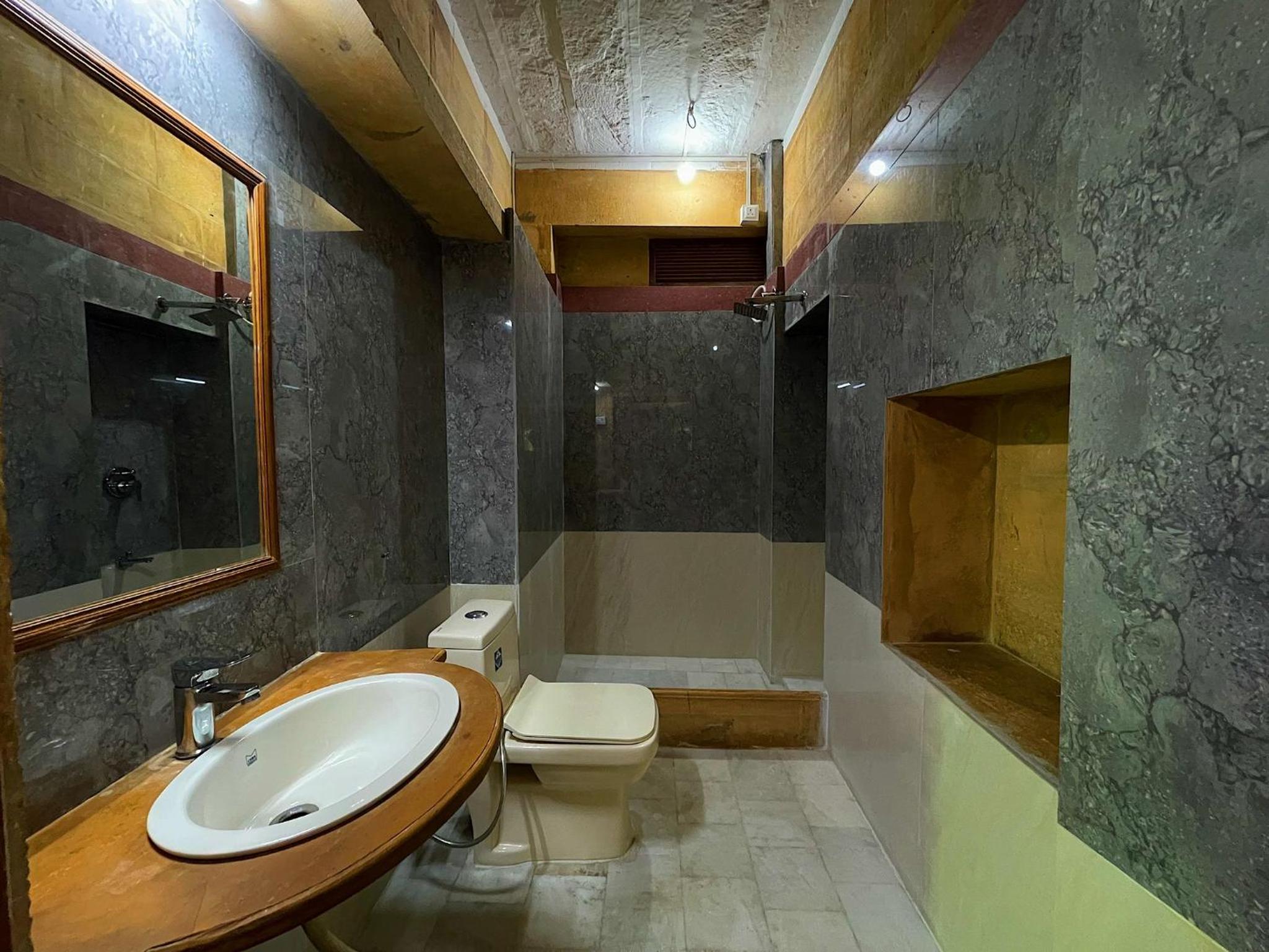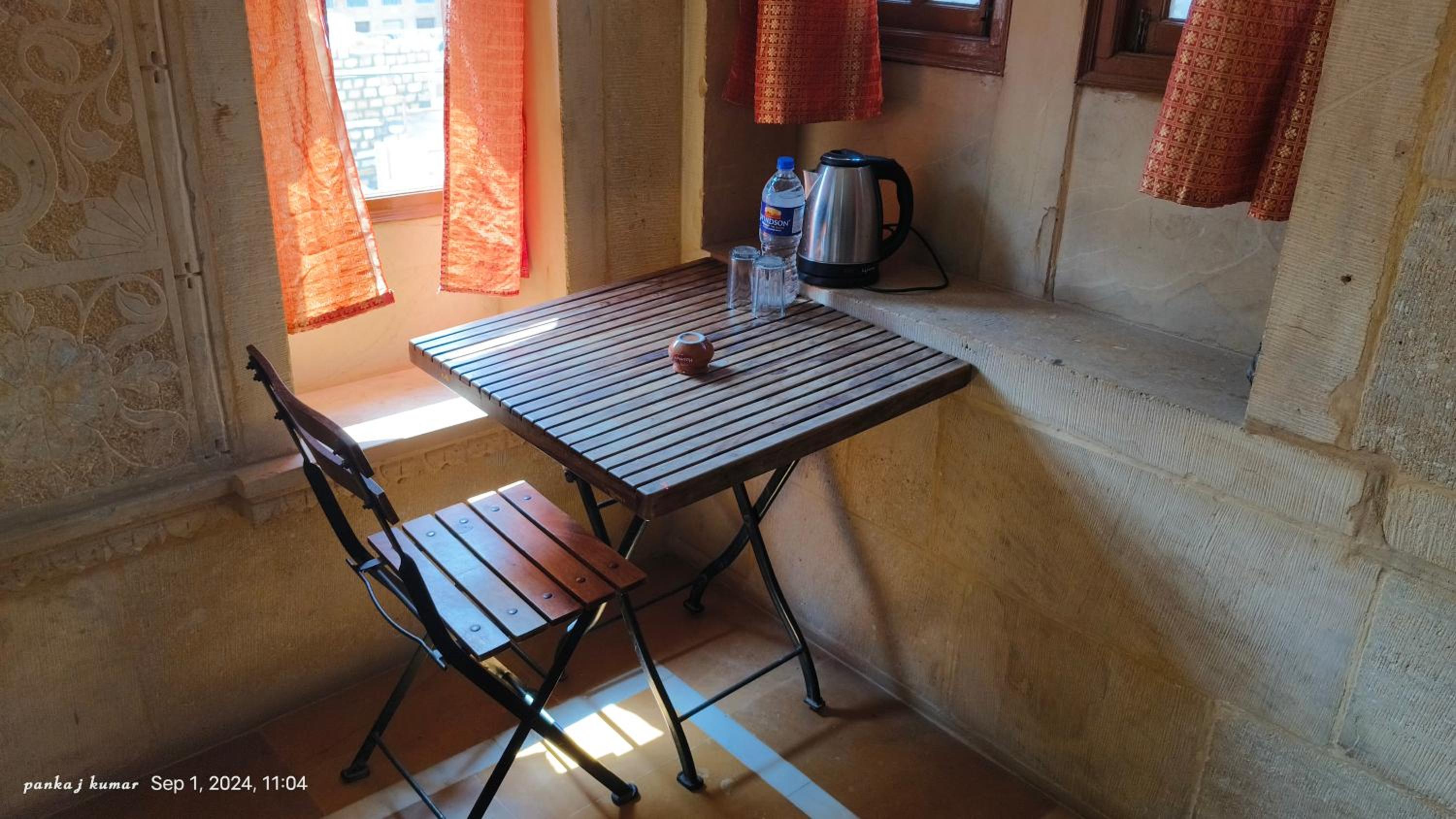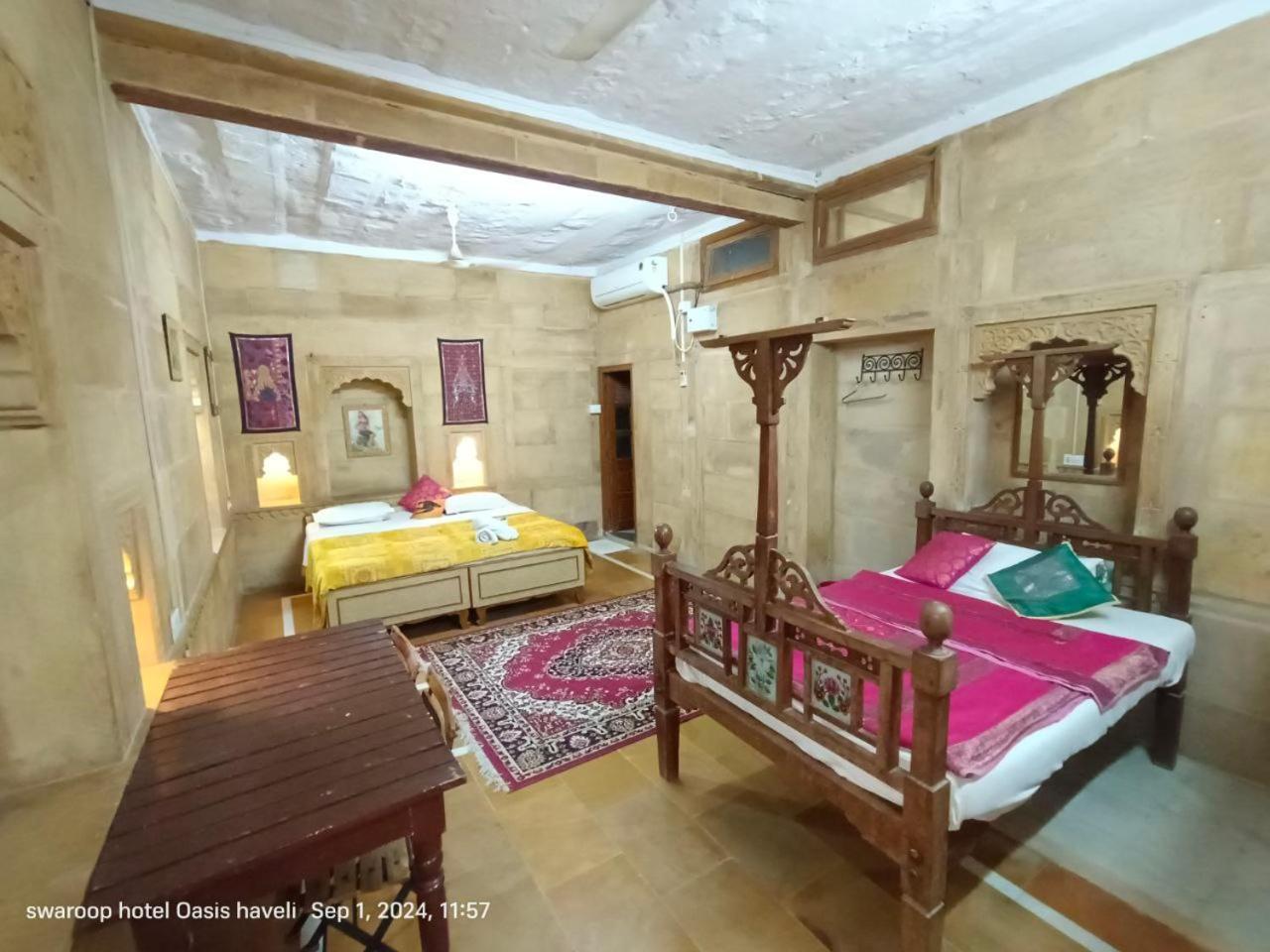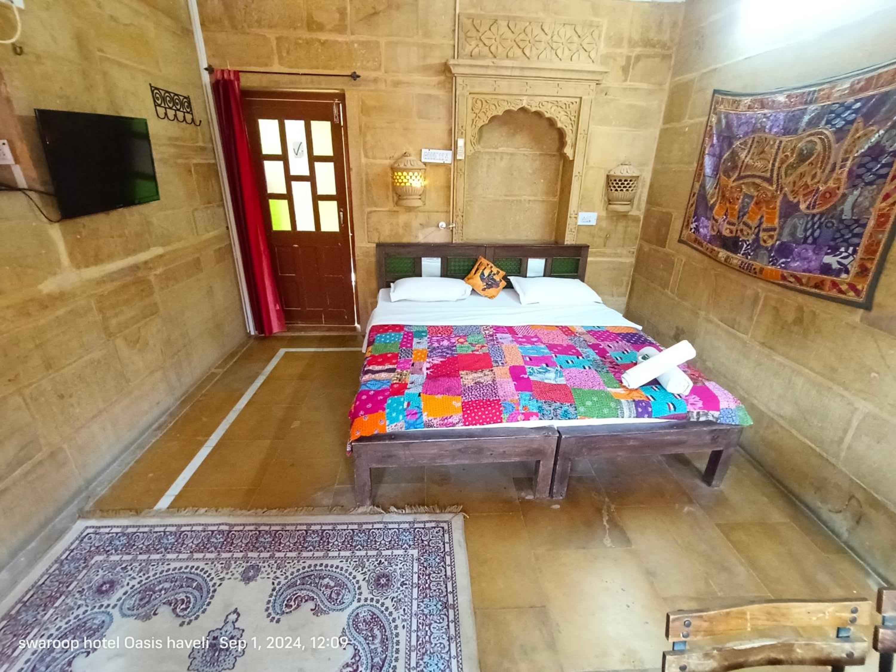 We had booked a basic room for 1 night, but the kind owner upgraded us to a cute room with a bigger bathroom, for our comfort, he added. No extra cost. Everything was good, the bathroom was quite big for Indian standards, and the bed was very comfortable and clean. We enjoyed our 1 night stay at Oasis Haveli and will come back for a longer stay in a different room, this time. Some of their rooms are absolutely gorgeous in the lical style. The owner is a sweet man, his staff is so very friendly and helpful. They make you feel like family. The Jaisalmer hospitality is absolutely great. Our room had no window, but we didn't mind as we only stayed the night. Breakfast is à la carte on the rooftop, where you get a wonderful view of the fort. You can also use their taxi service: their driver took us to our accommodation in the desert and picked us up for a very decent price compared to others.