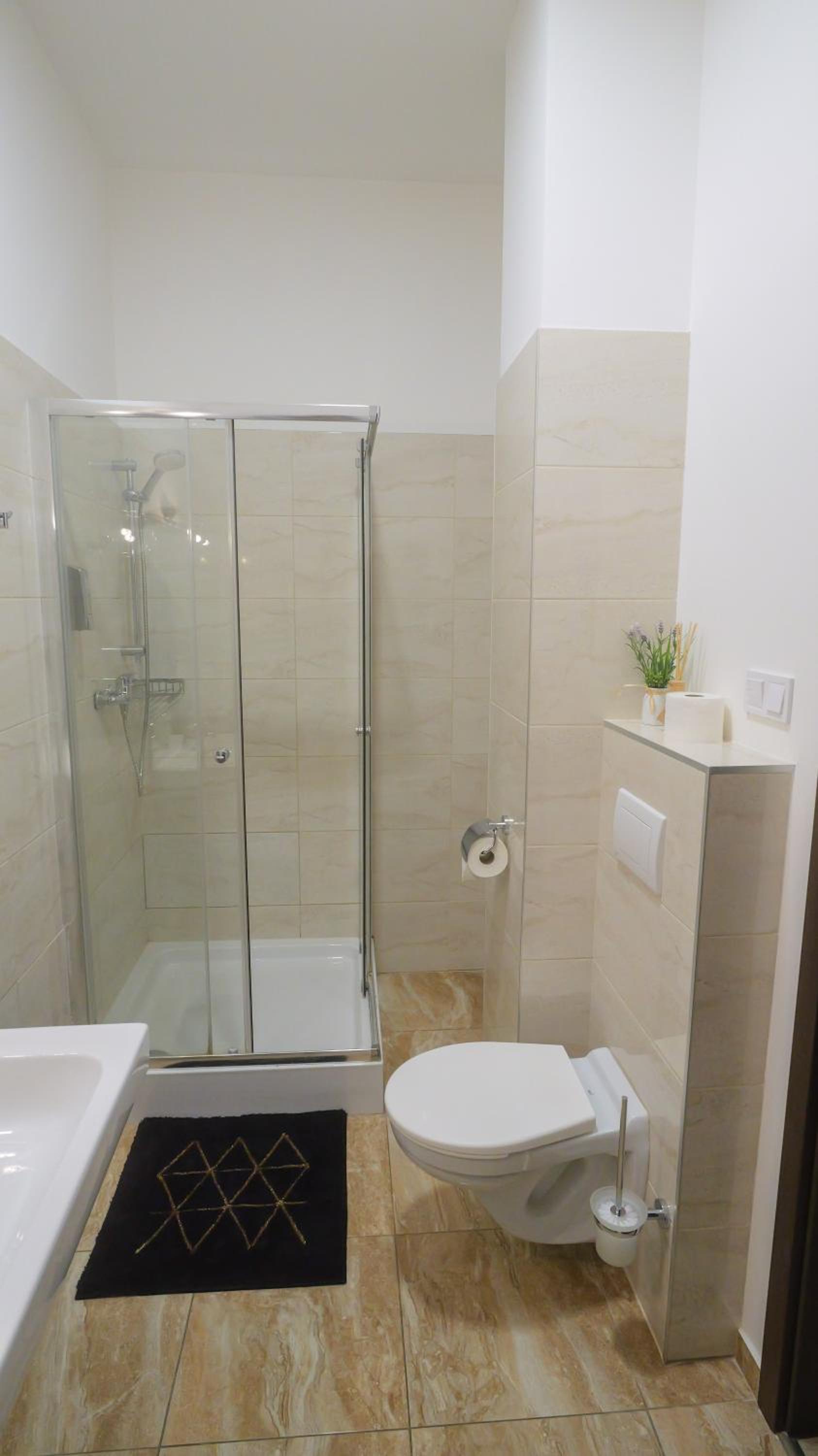 Uteráky by potrebovali vybieliť (ale boli čisté, oprané). Sprchový kút by potreboval dôkladnejšie vyčistiť (zamerať sa na rohy, kúty, spoje medzi vaničkou a stenami).