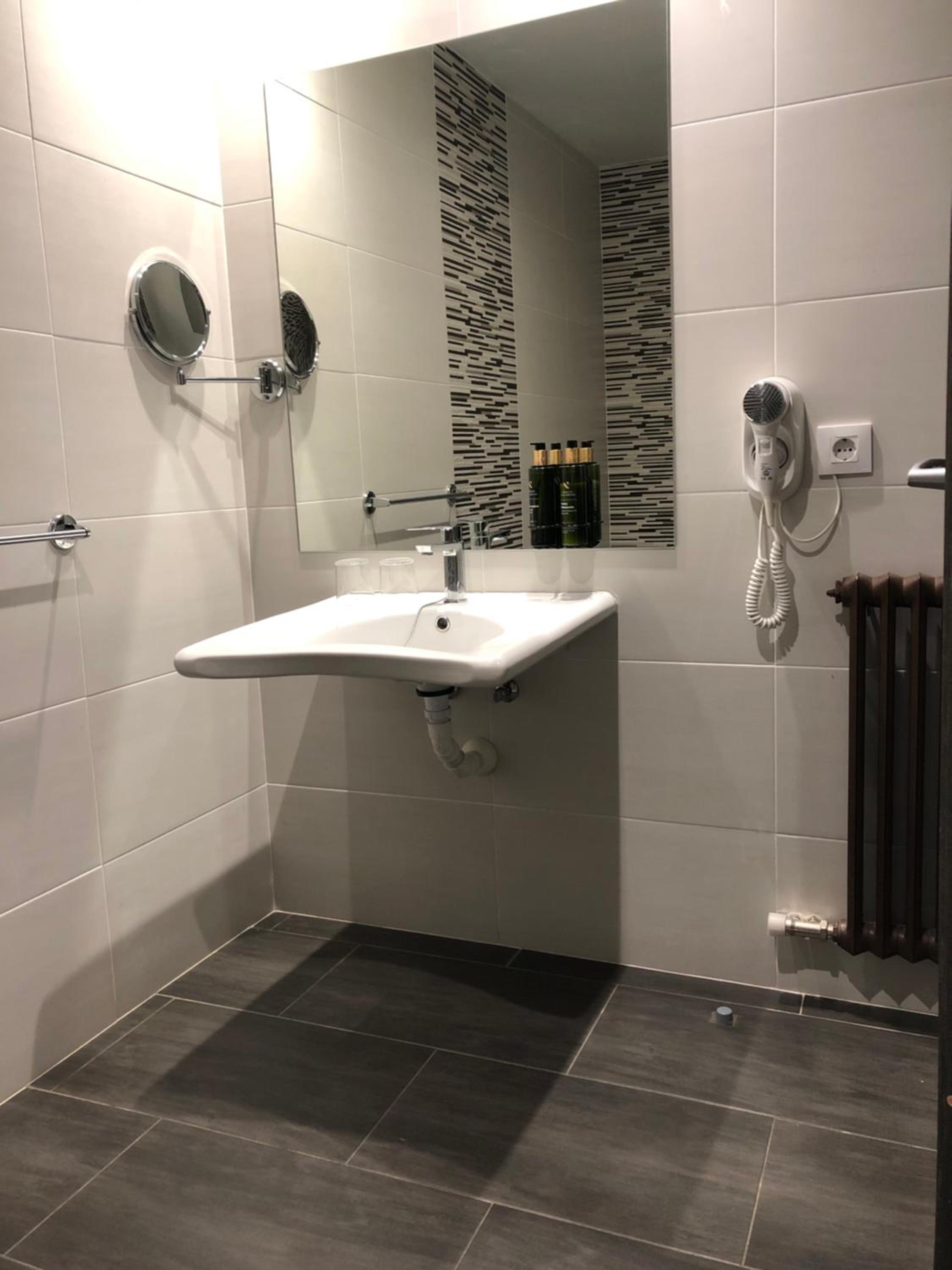 Bagno sporco e usurato: peli dappertutto, sul water, sul muro, sul lavandino. Il phon sembrava da buttare. Lo scarico, dopo l’uso, faceva un rumore forte e improvviso.