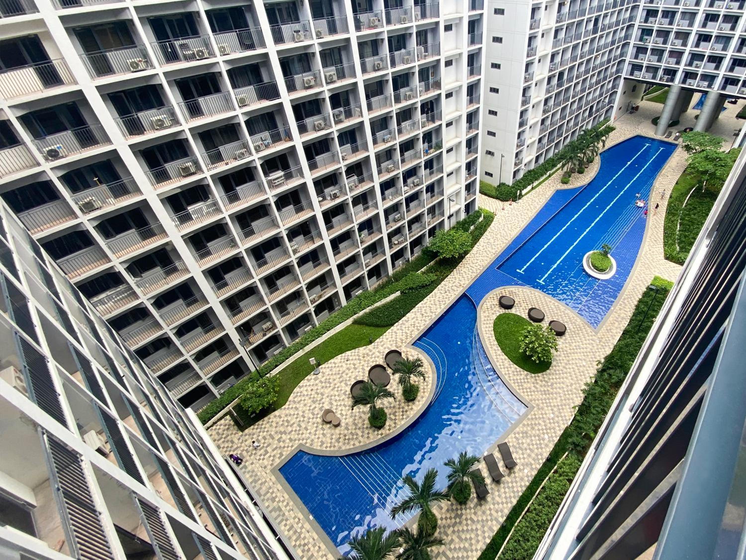 Enjoy picturesque views of the garden and pool from your room at Homefort at Shore Residences.
