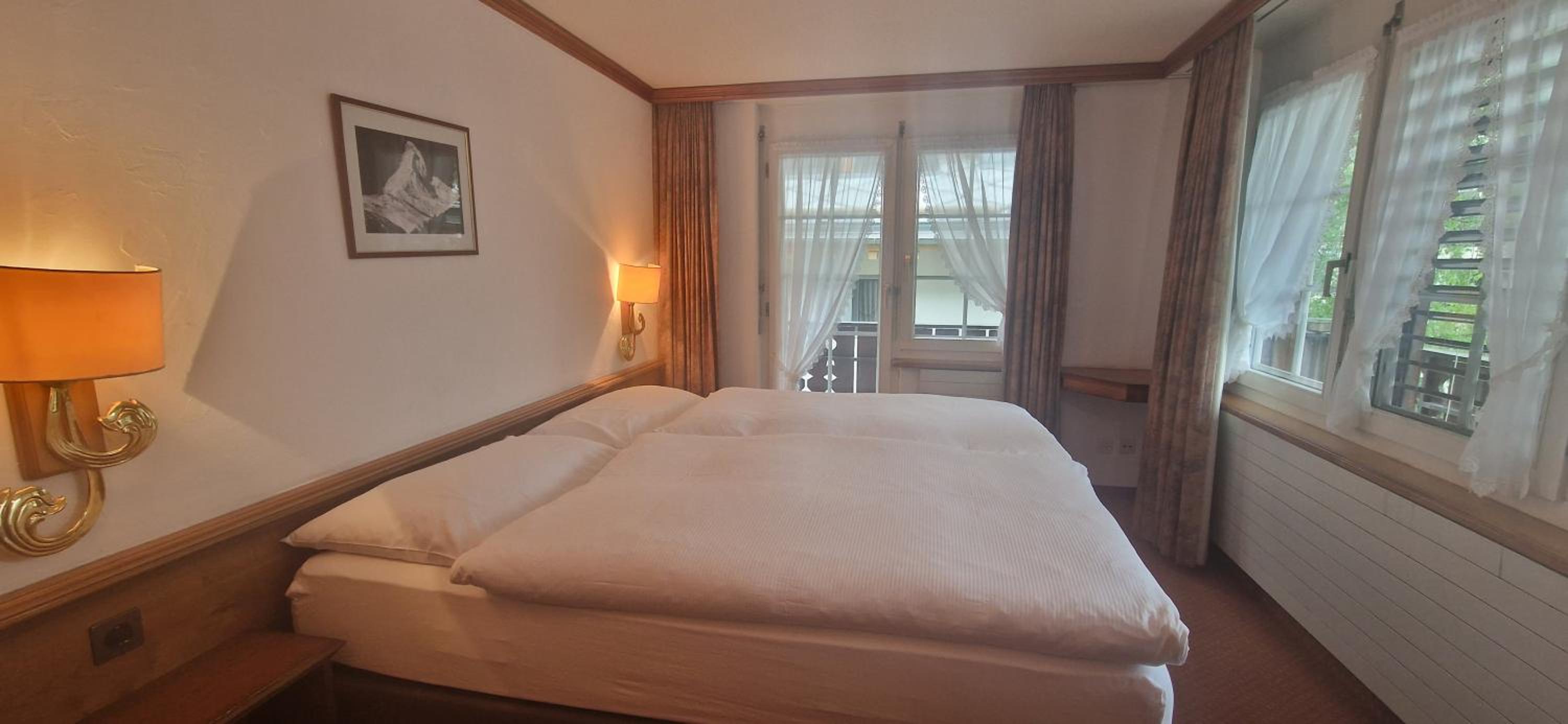 The apartment was of good size with a separate bedroom and a well stocked kitchenette. Well located with a ski hire facility and bus stop within 50m and only a short 10 minute walk to the train station and the centre of Zermatt. Ski storage was provided onsite. Two additional single wall mounted pull-down beds were provided should you need to accommodate additional guests.