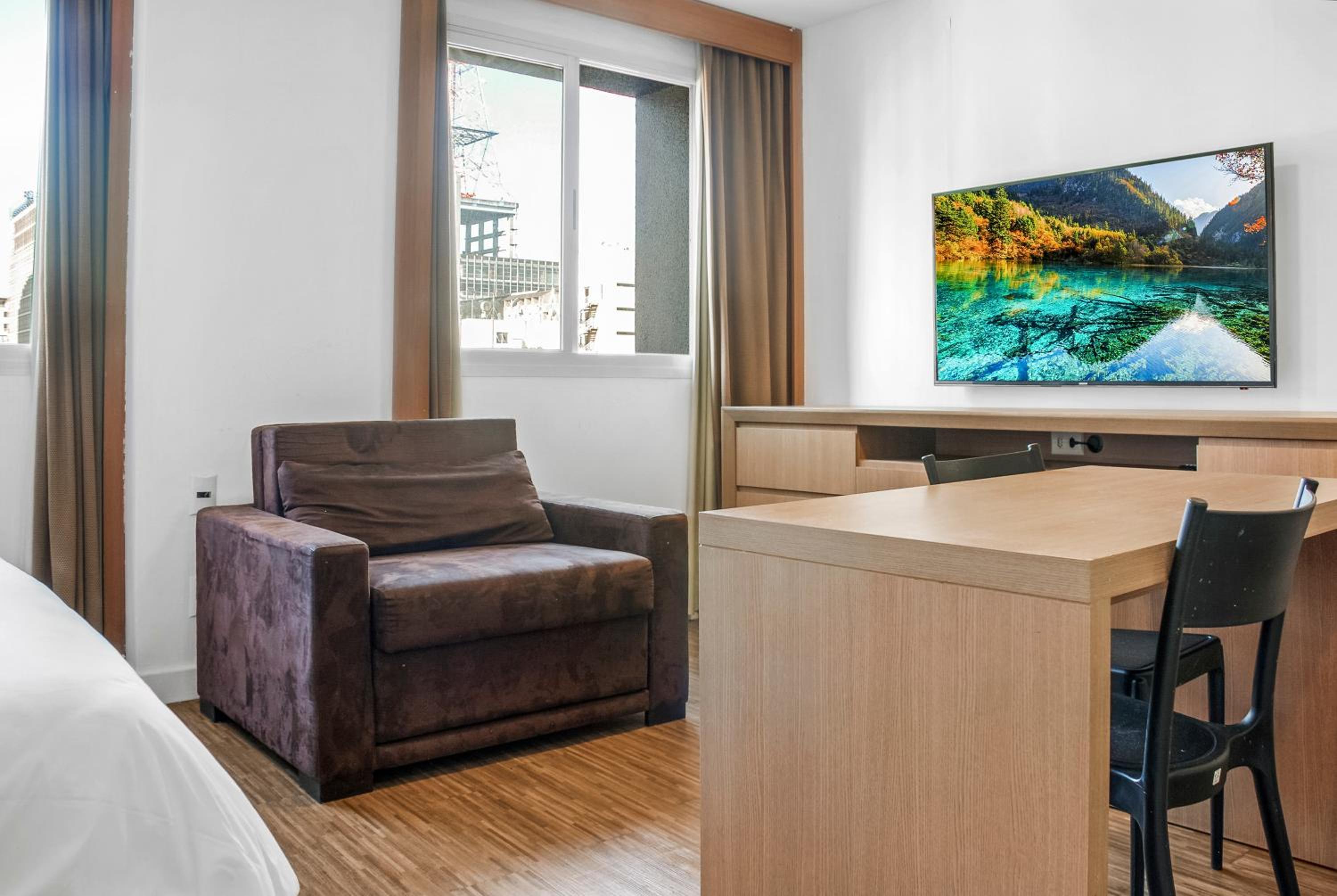 Localização, qualidade do hotel, cama muito confortável e roupas de cama boas e macias. Cozinha bem equipada, televisão grande e com todos os canais.