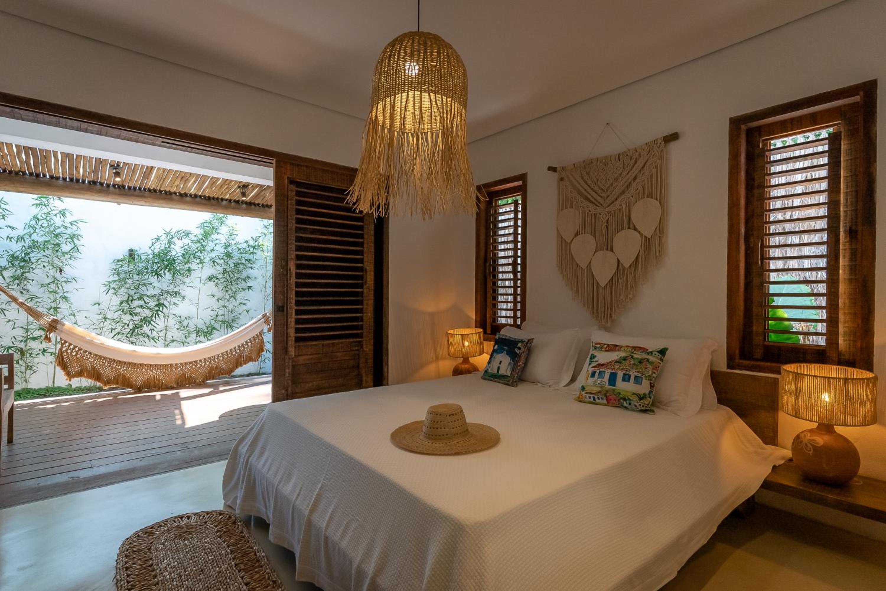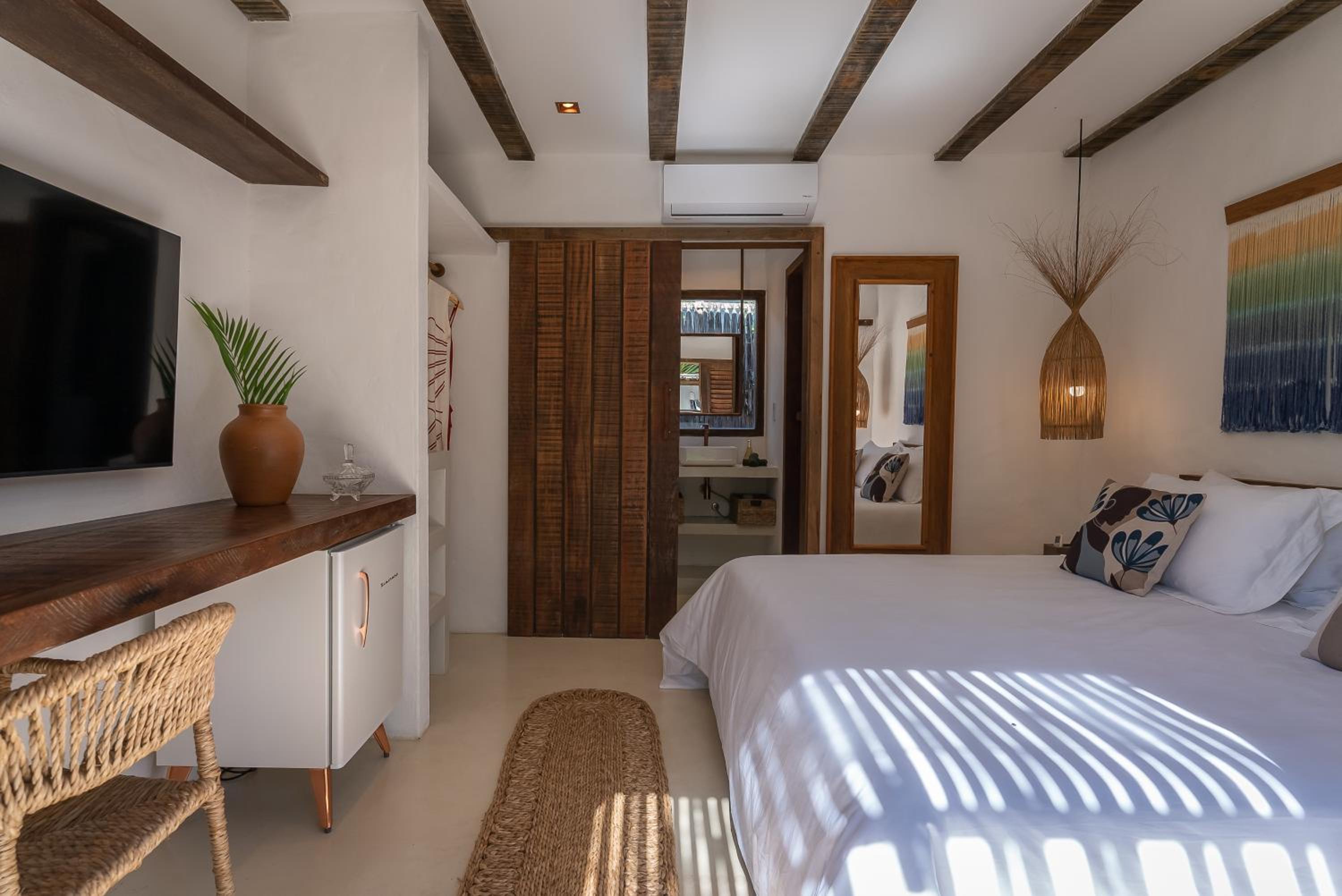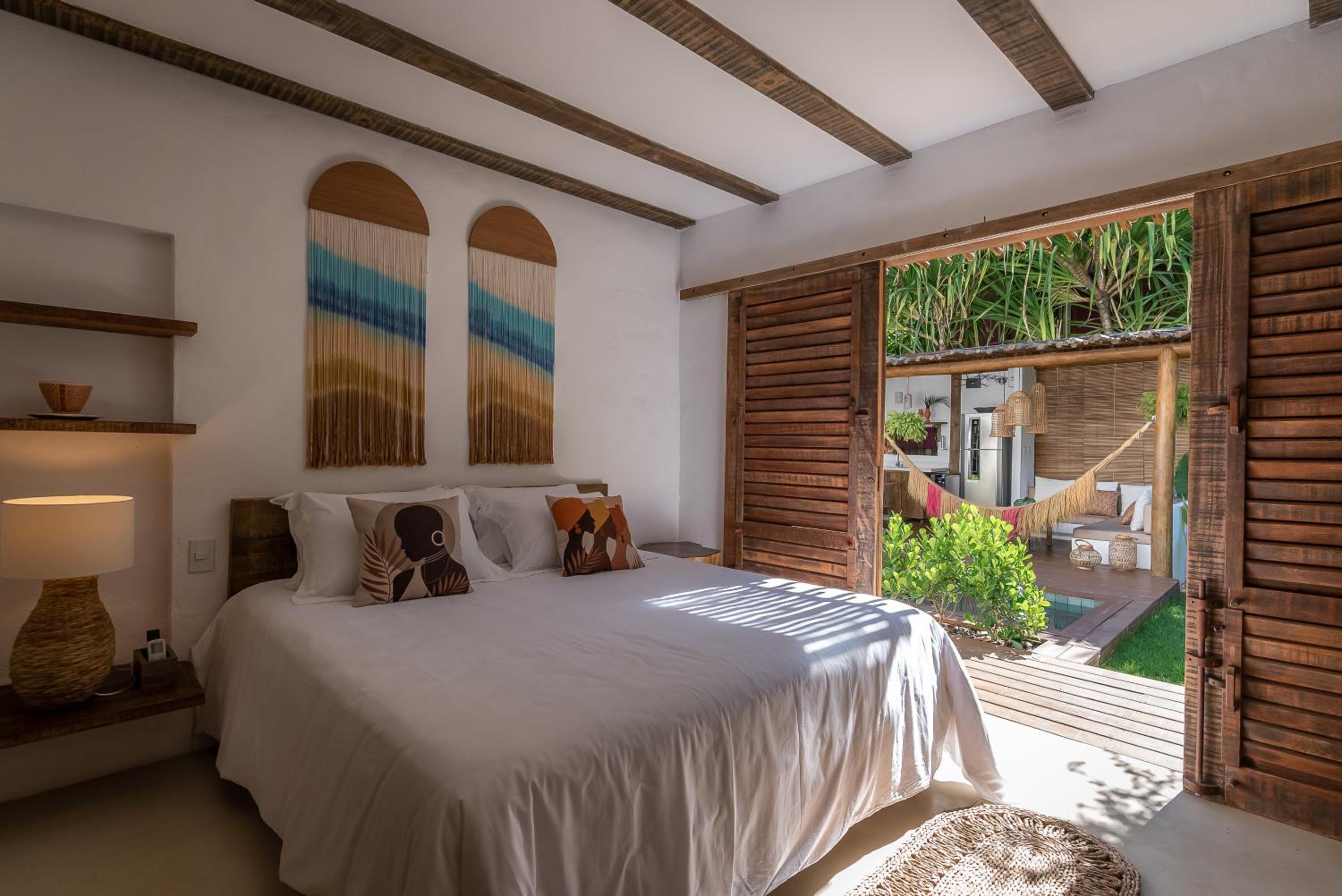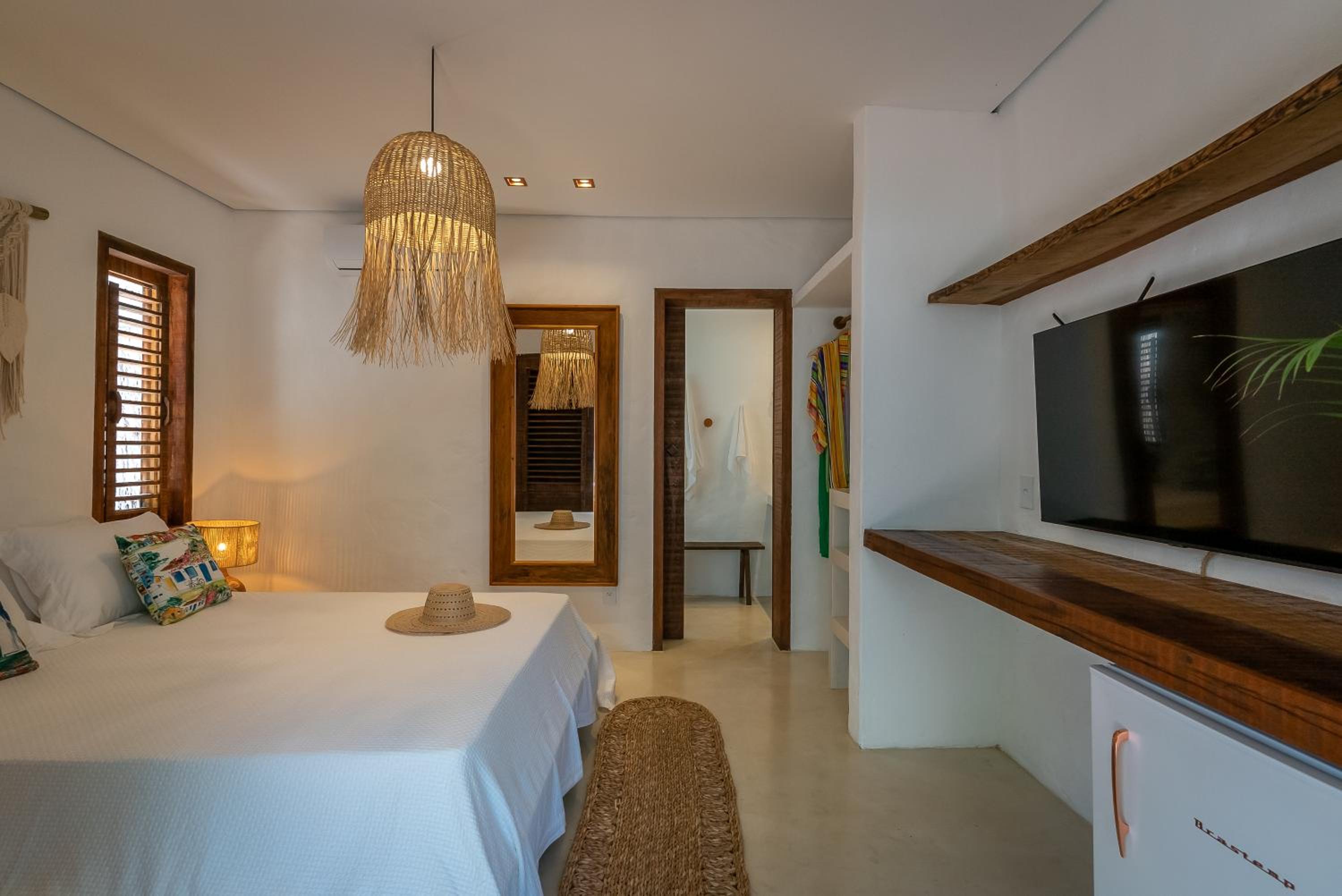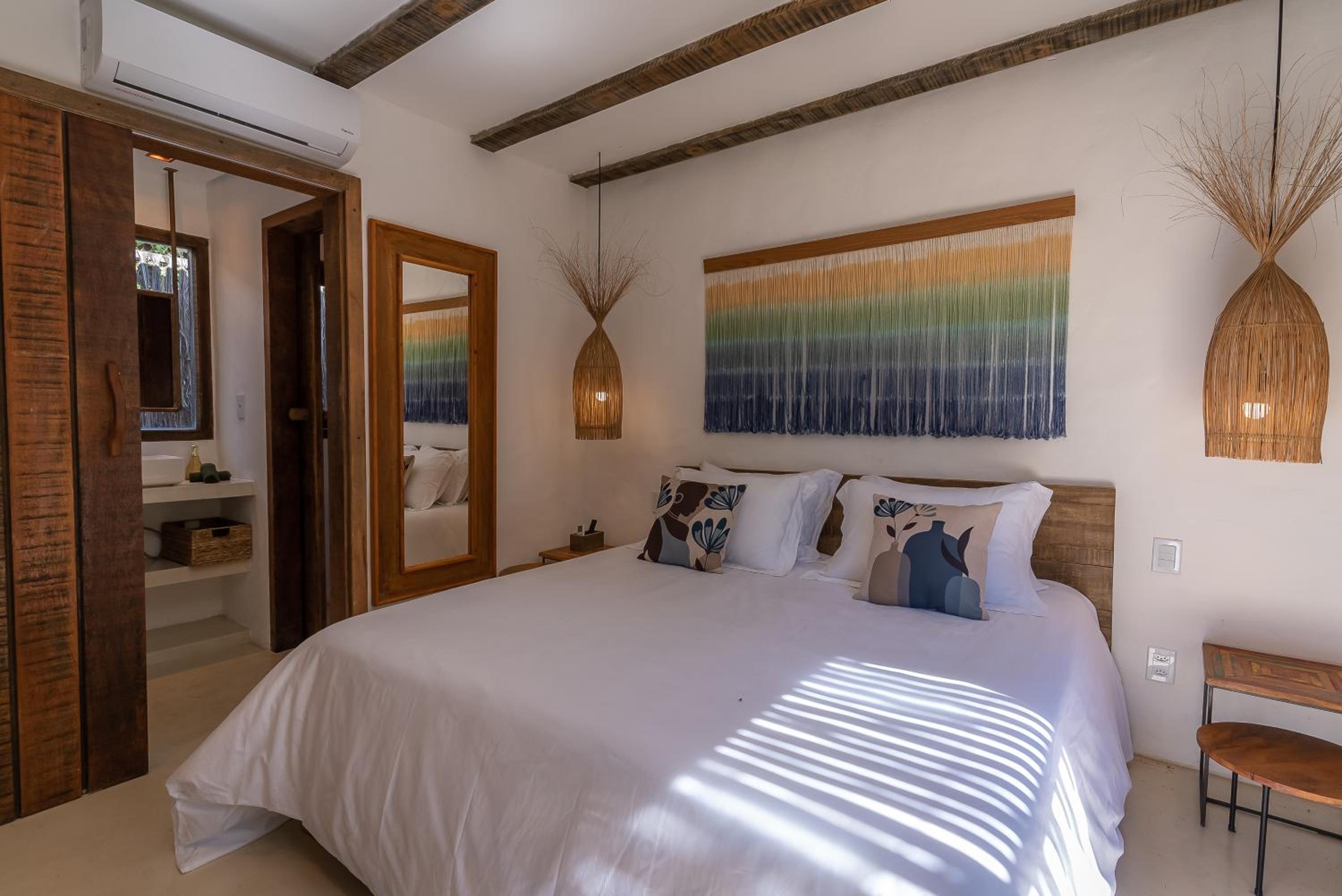 O quarto é um charme à parte. Tem aquele estilo rústico chique que é a cara de Caraíva, com madeira, decoração local de muito bom gosto e uma cama extremamente confortável. Simplesmente acolhedor.