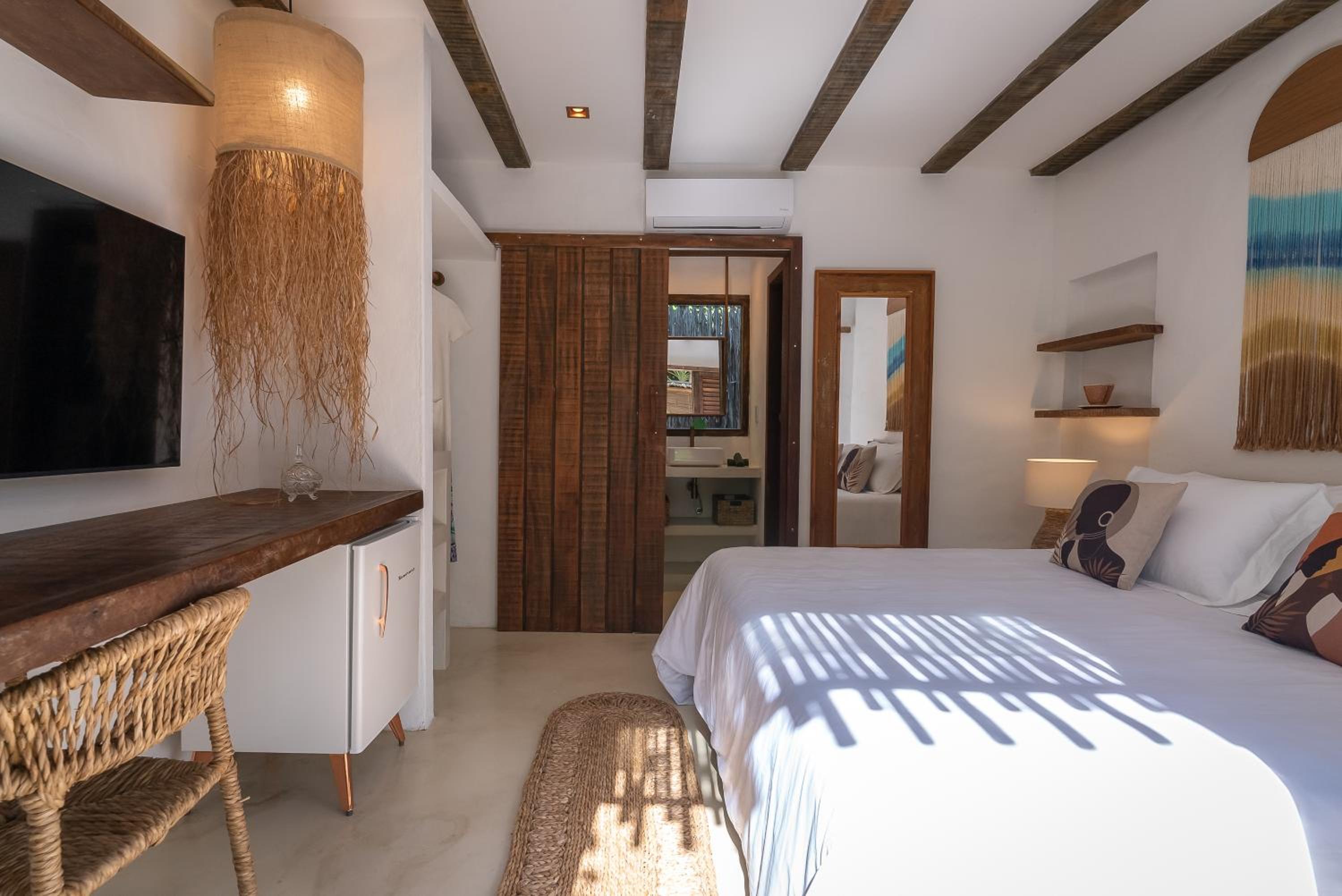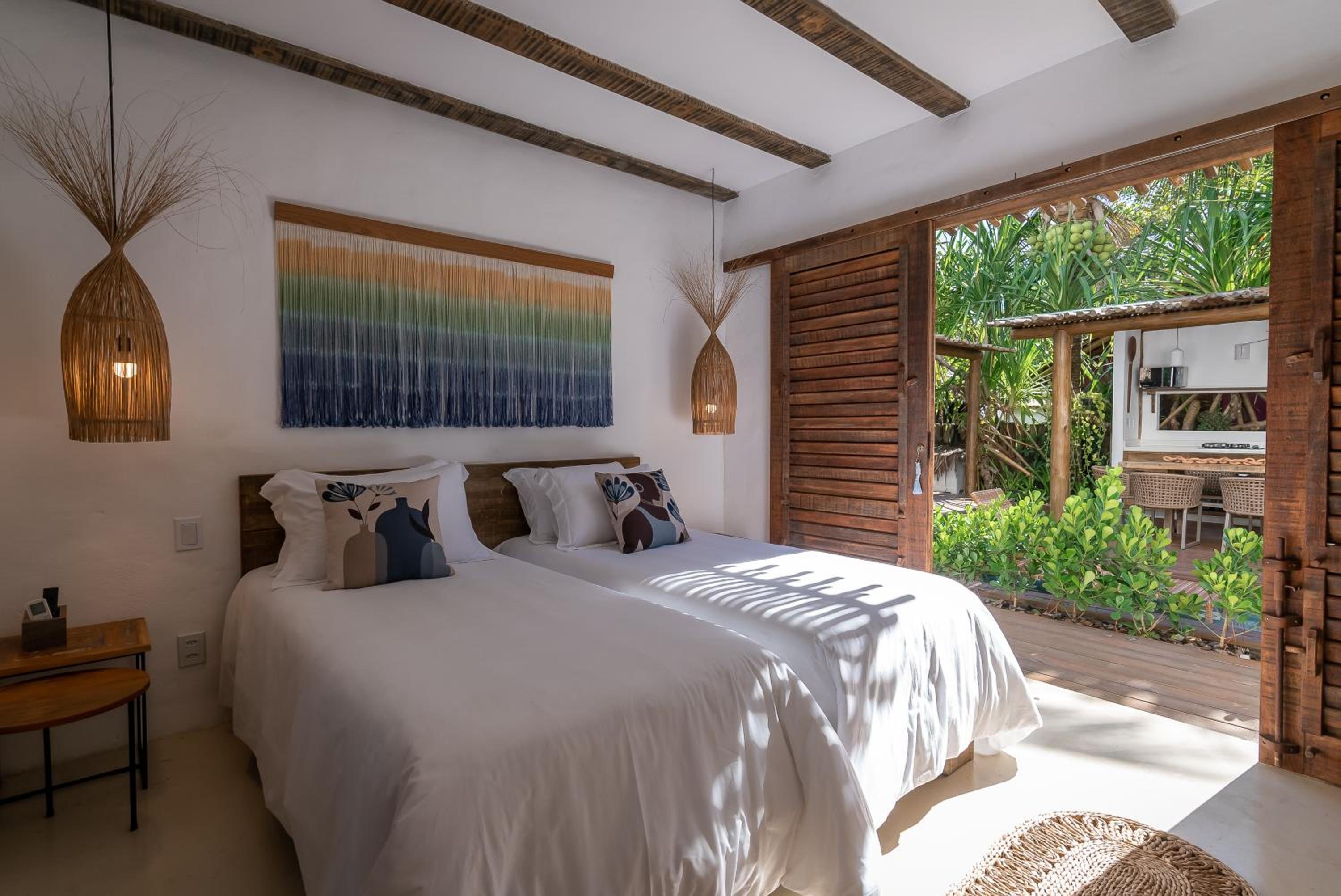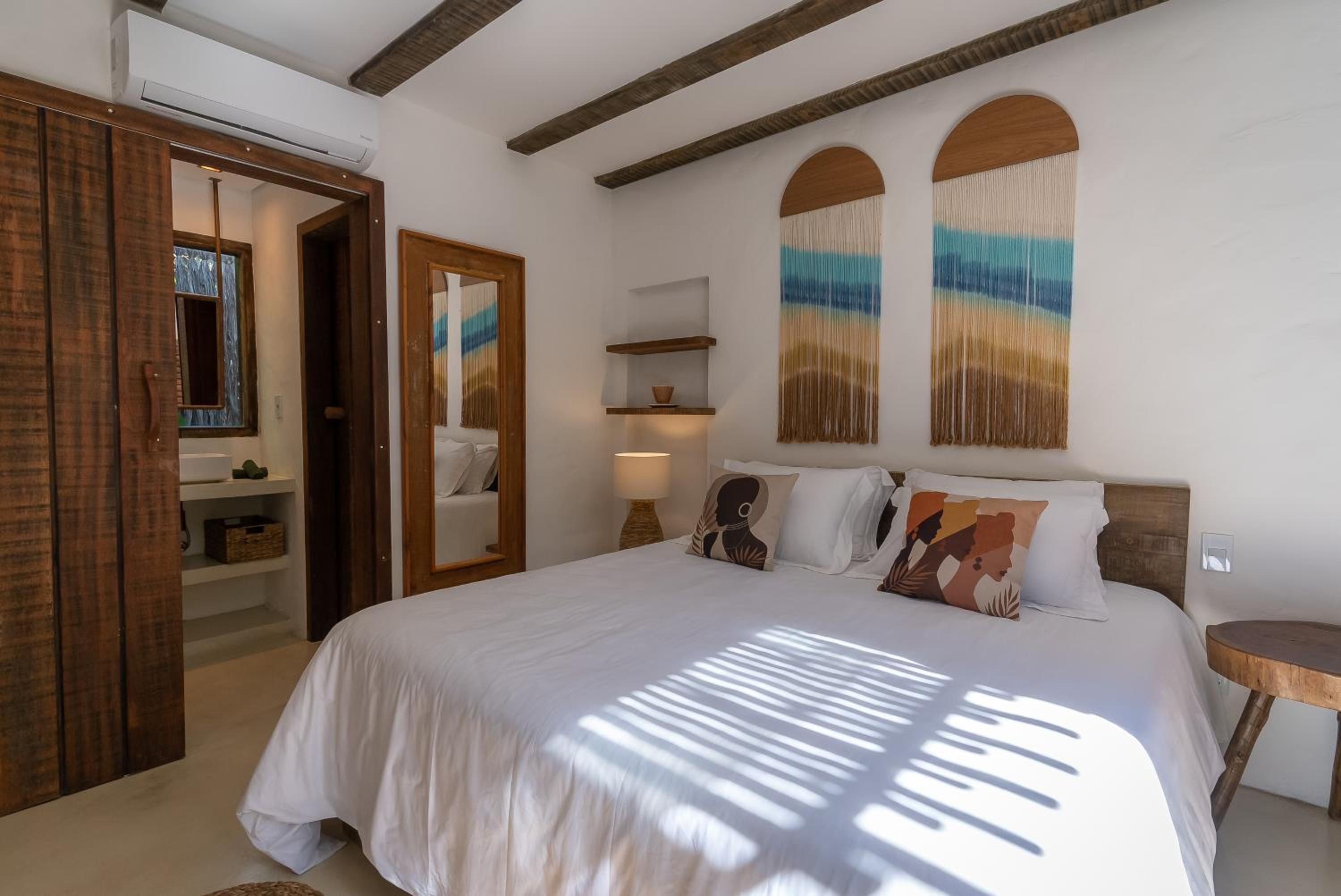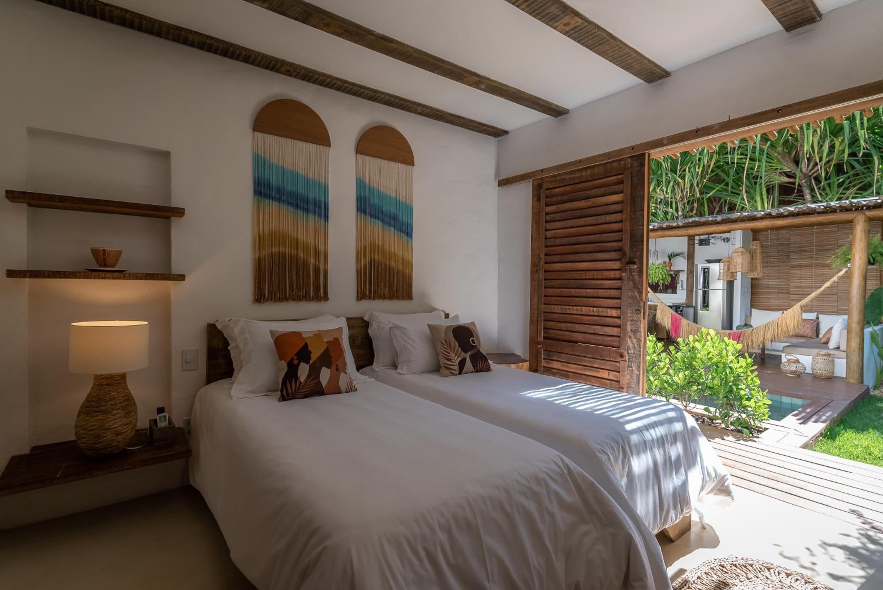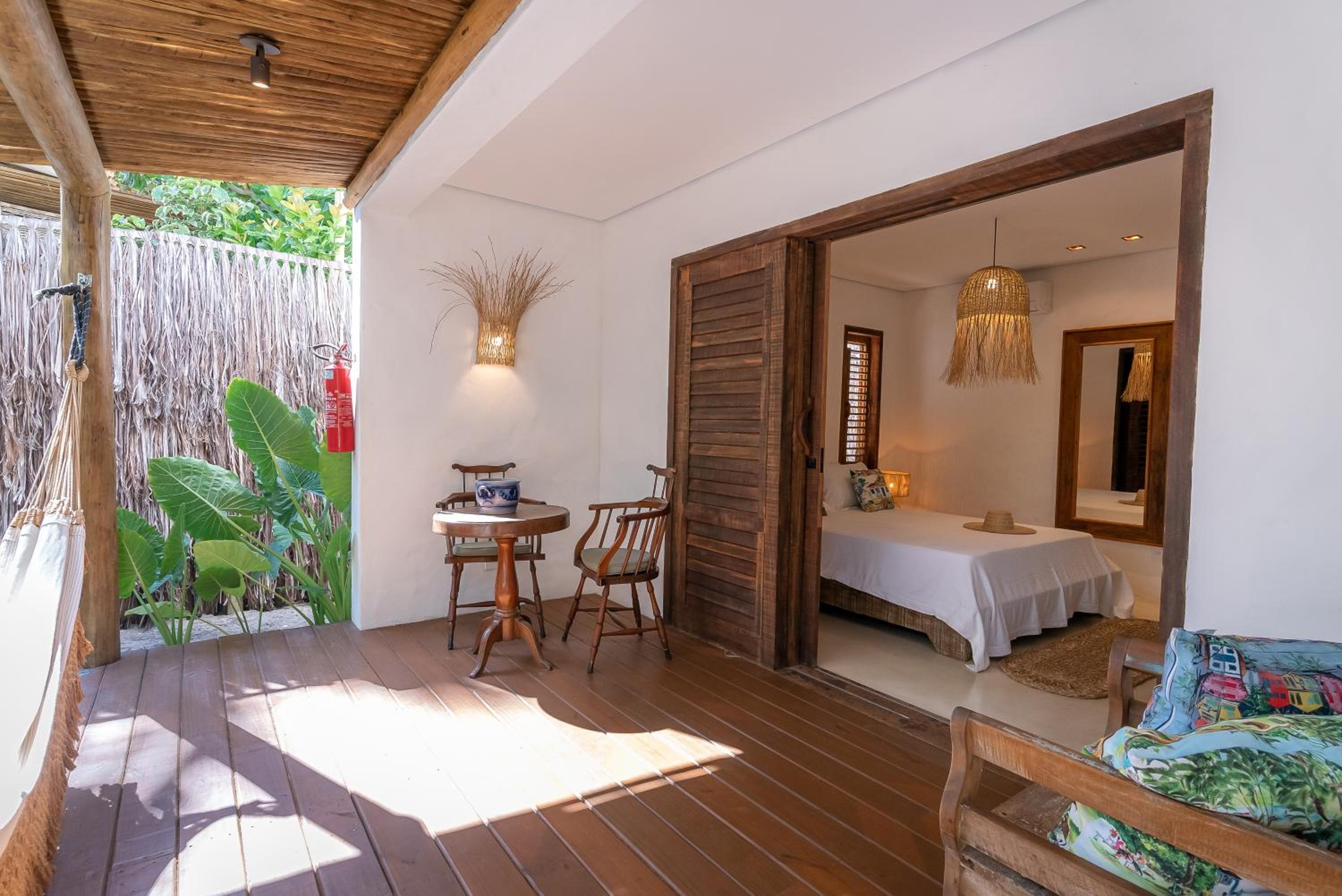 O quarto é um charme à parte. Tem aquele estilo rústico chique que é a cara de Caraíva, com madeira, decoração local de muito bom gosto e uma cama extremamente confortável. Simplesmente acolhedor.