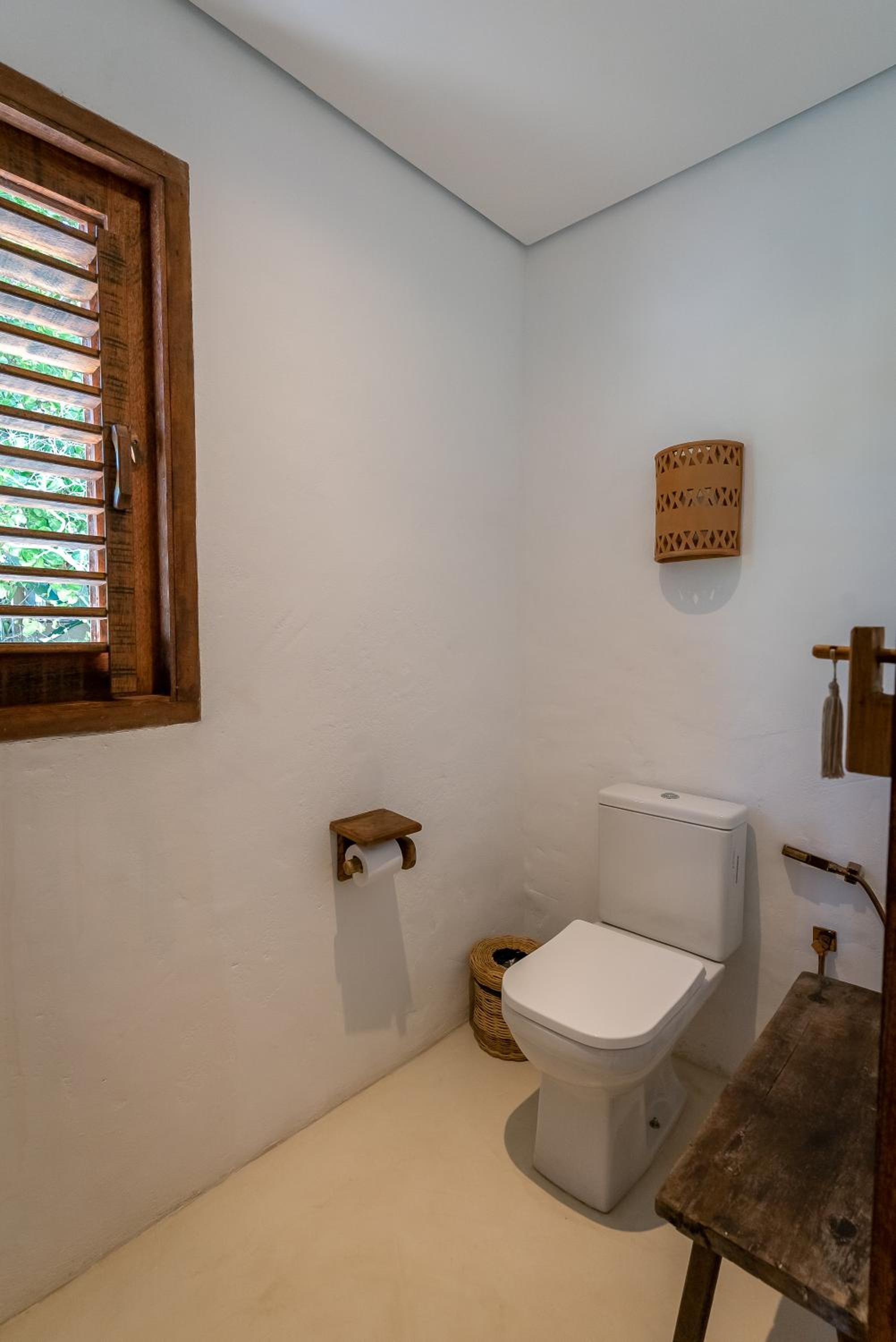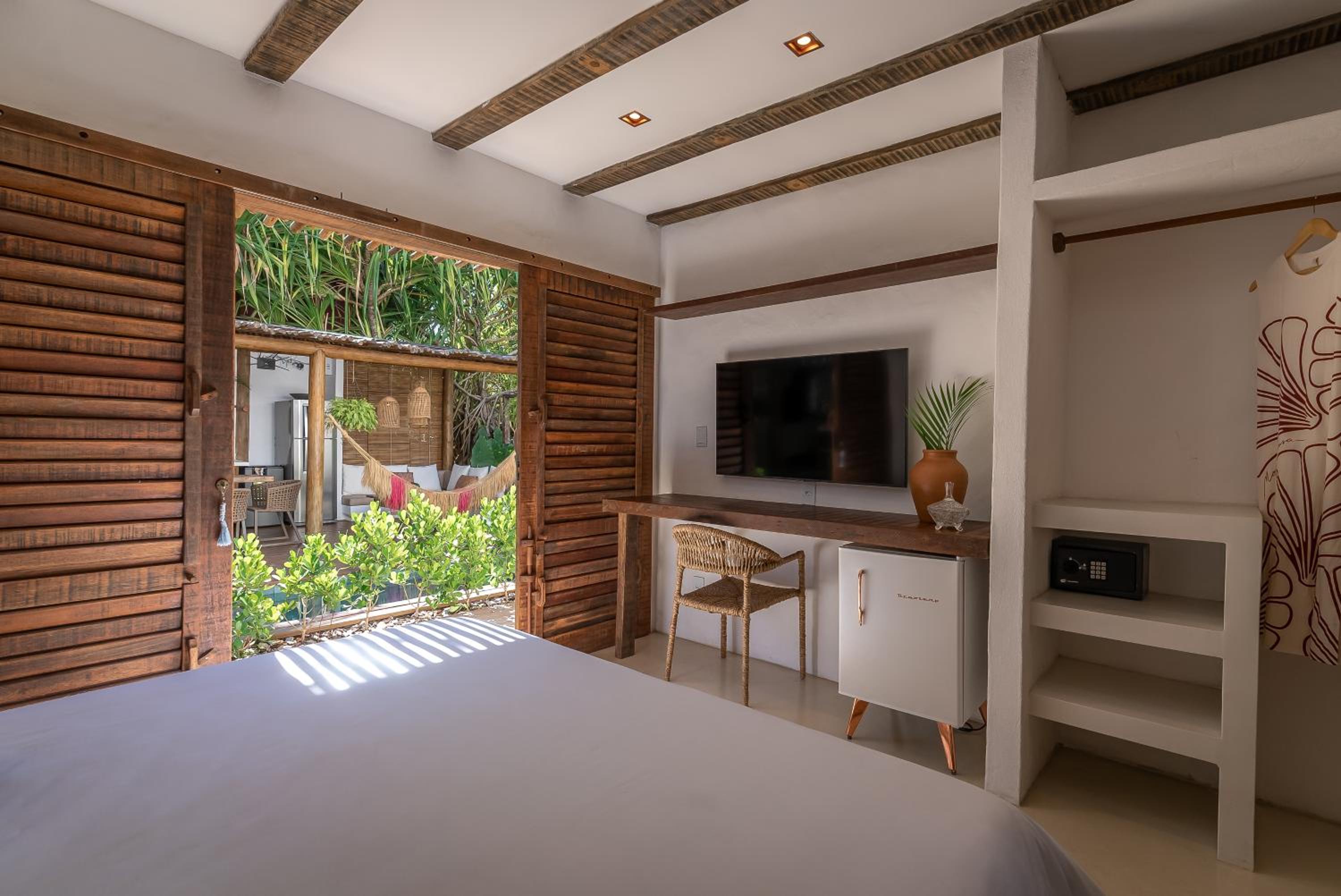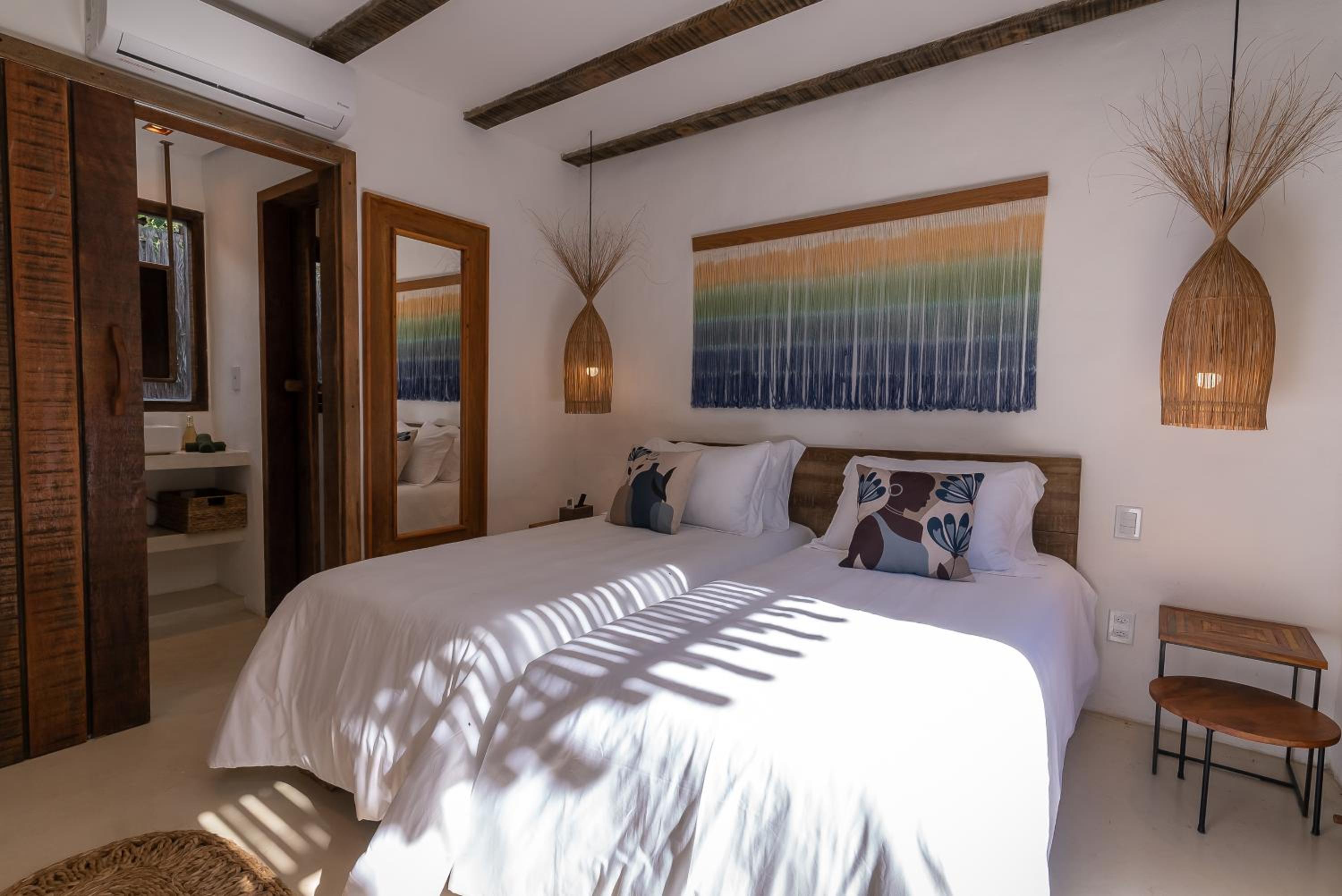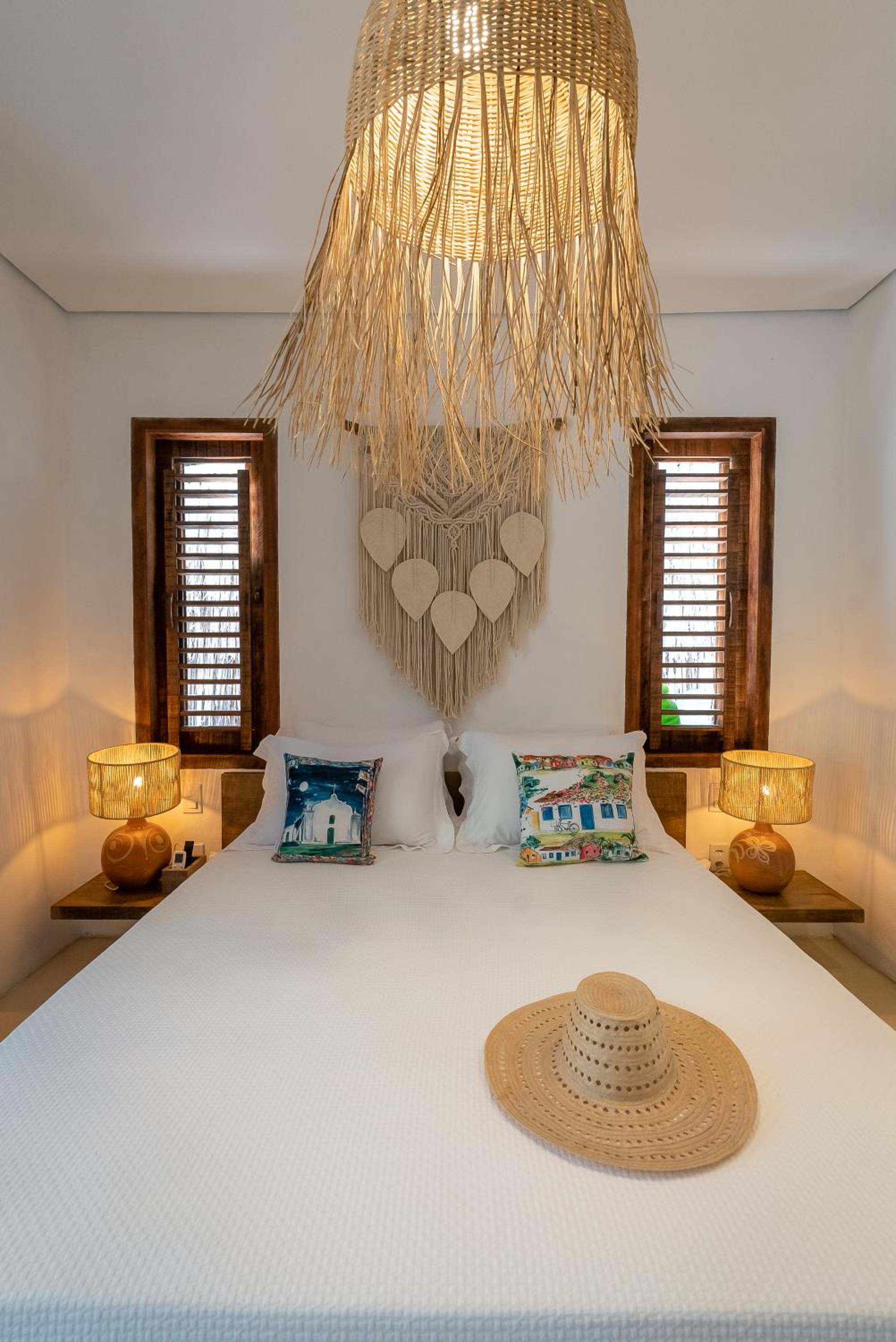 O quarto é um charme à parte. Tem aquele estilo rústico chique que é a cara de Caraíva, com madeira, decoração local de muito bom gosto e uma cama extremamente confortável. Simplesmente acolhedor.