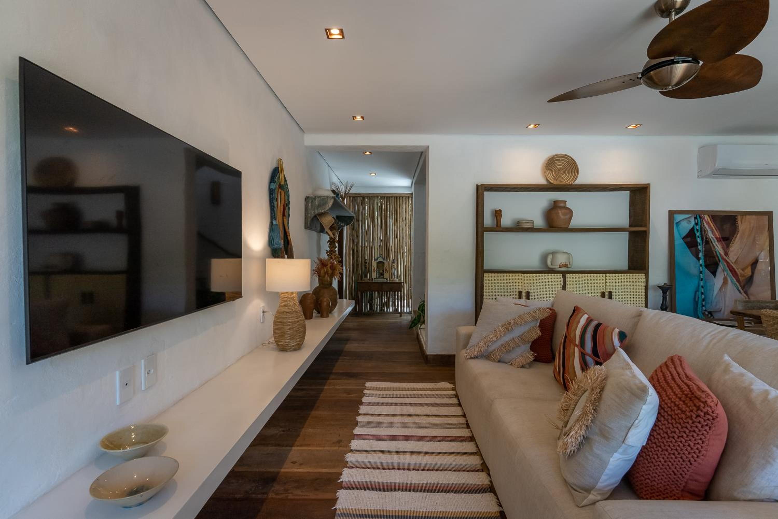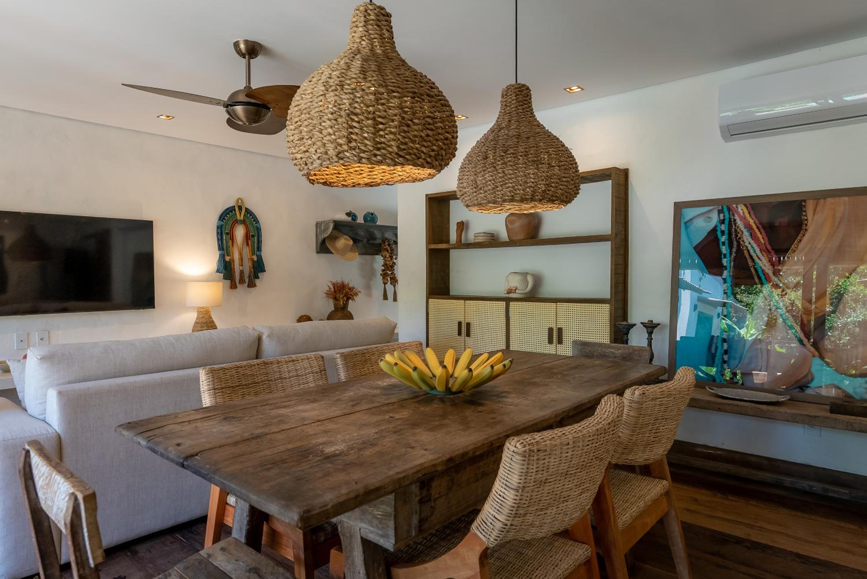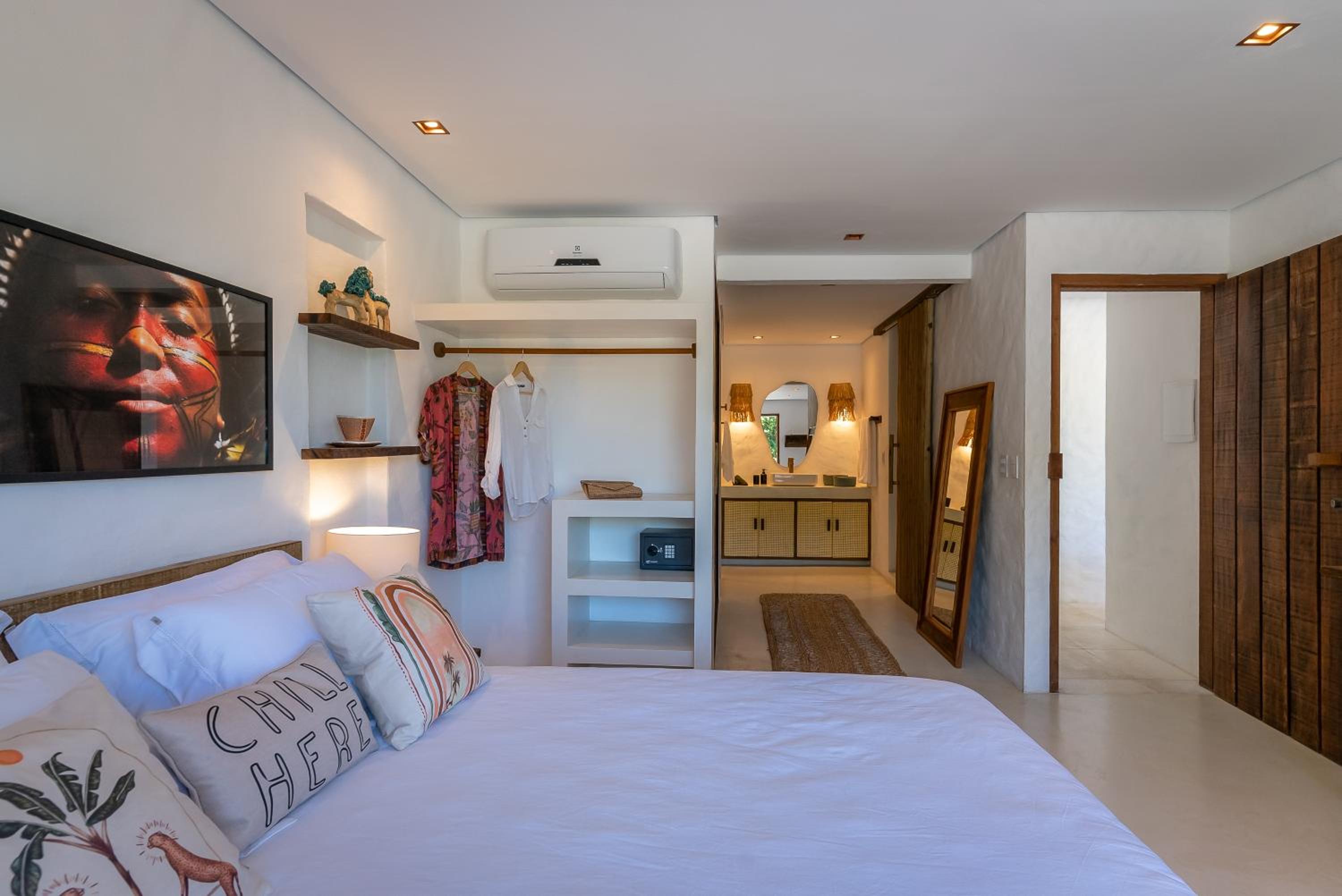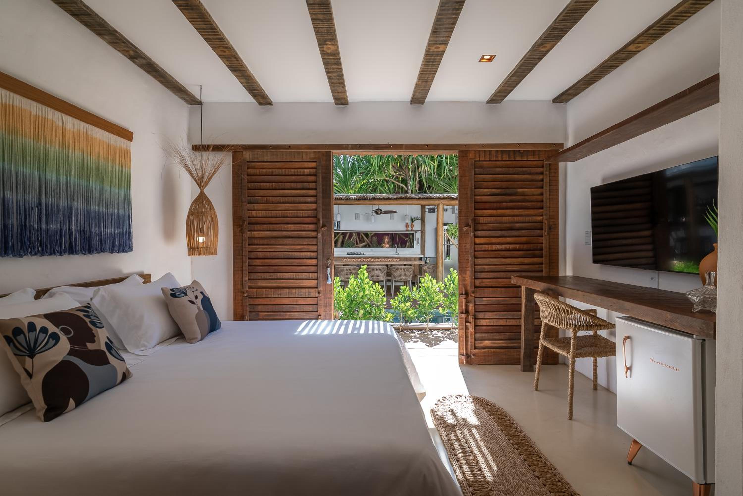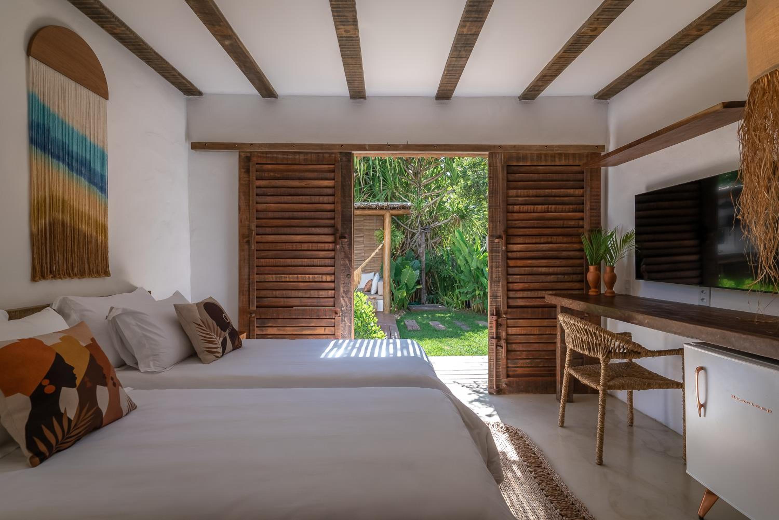 O quarto é um charme à parte. Tem aquele estilo rústico chique que é a cara de Caraíva, com madeira, decoração local de muito bom gosto e uma cama extremamente confortável. Simplesmente acolhedor.