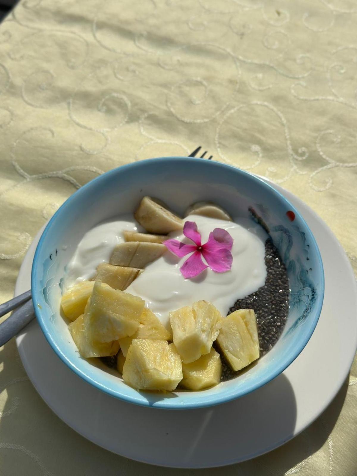 Les 2 jours suivants, petit déjeuner pantagruélique, fruits, vrai café, oeufs au plat délicieux, pain