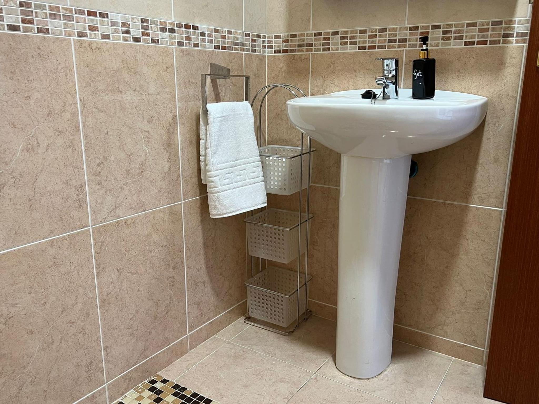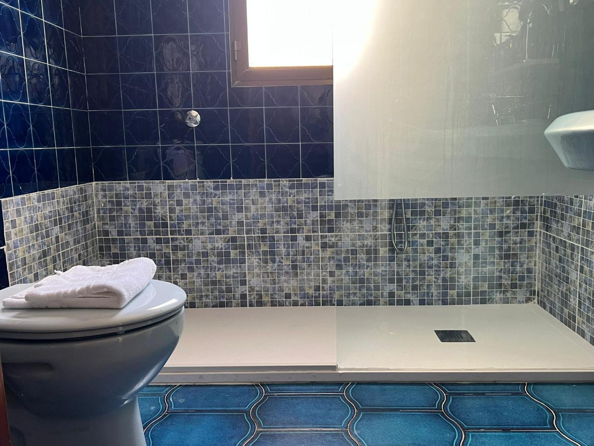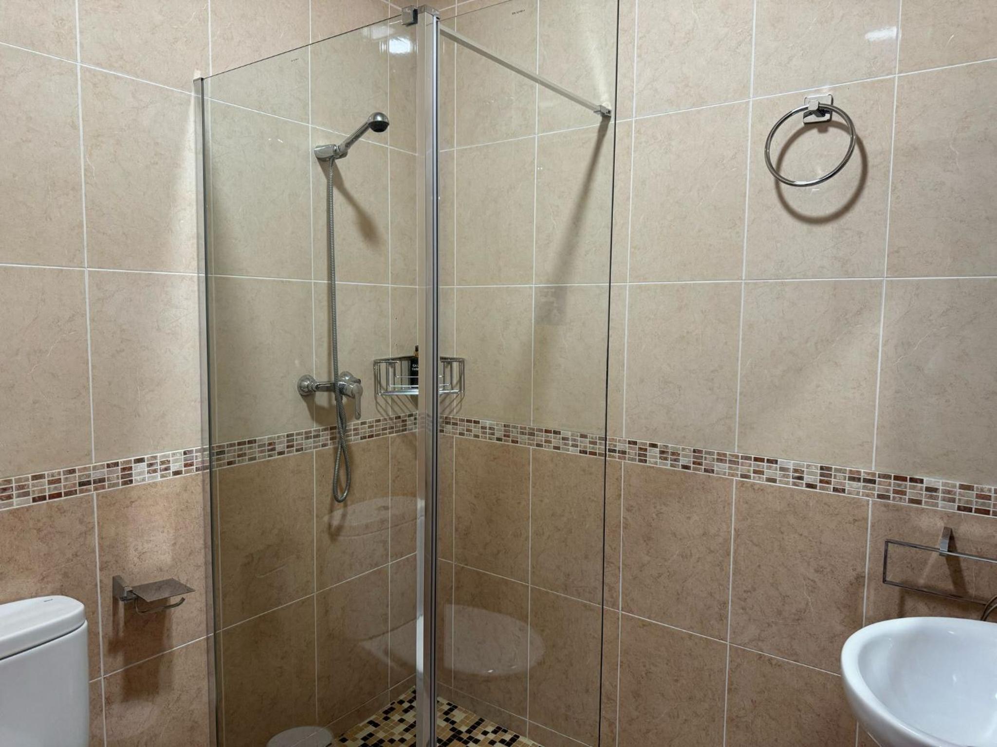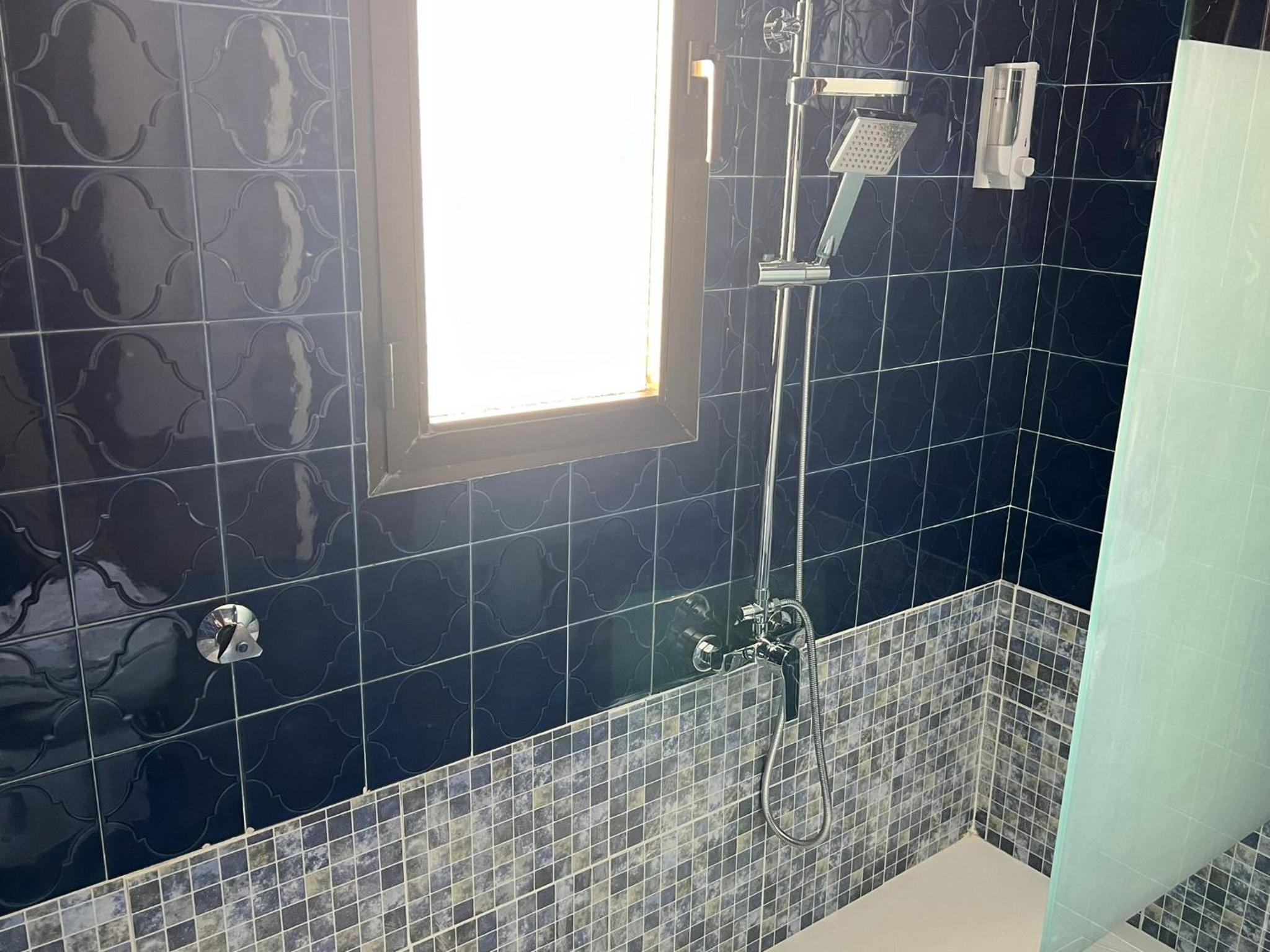 Sdb vétuste, tuyau de la douche qui fuyait, difficile de régler la température de l'eau, pas de savon, gel douche, gobelets...
