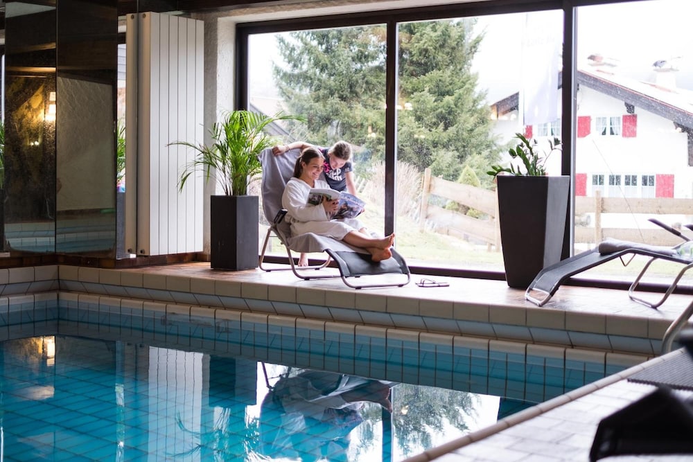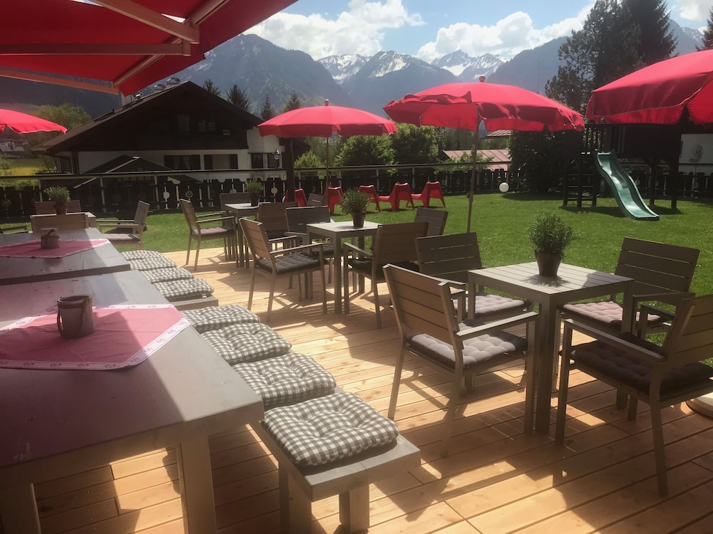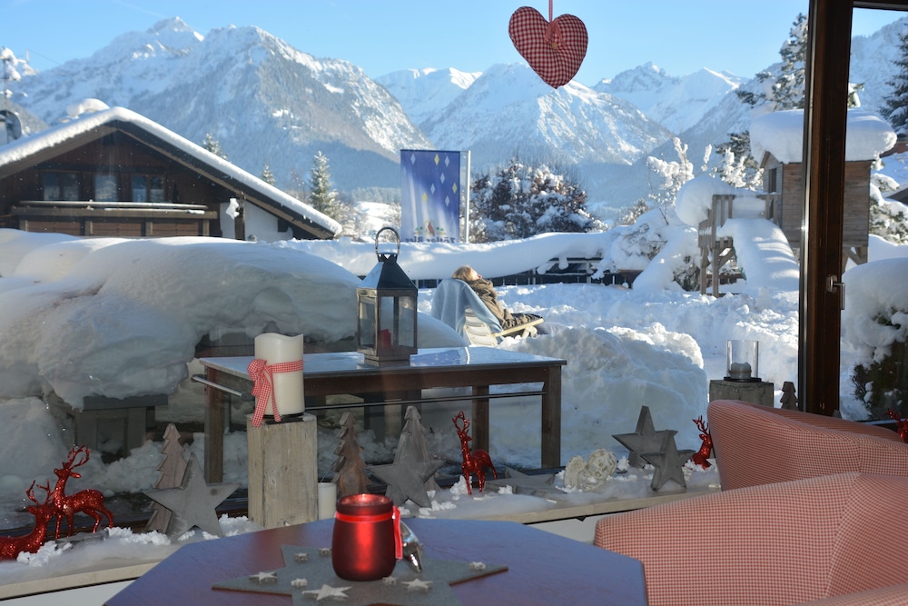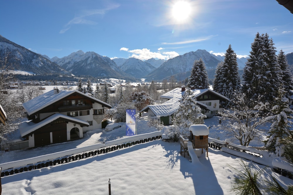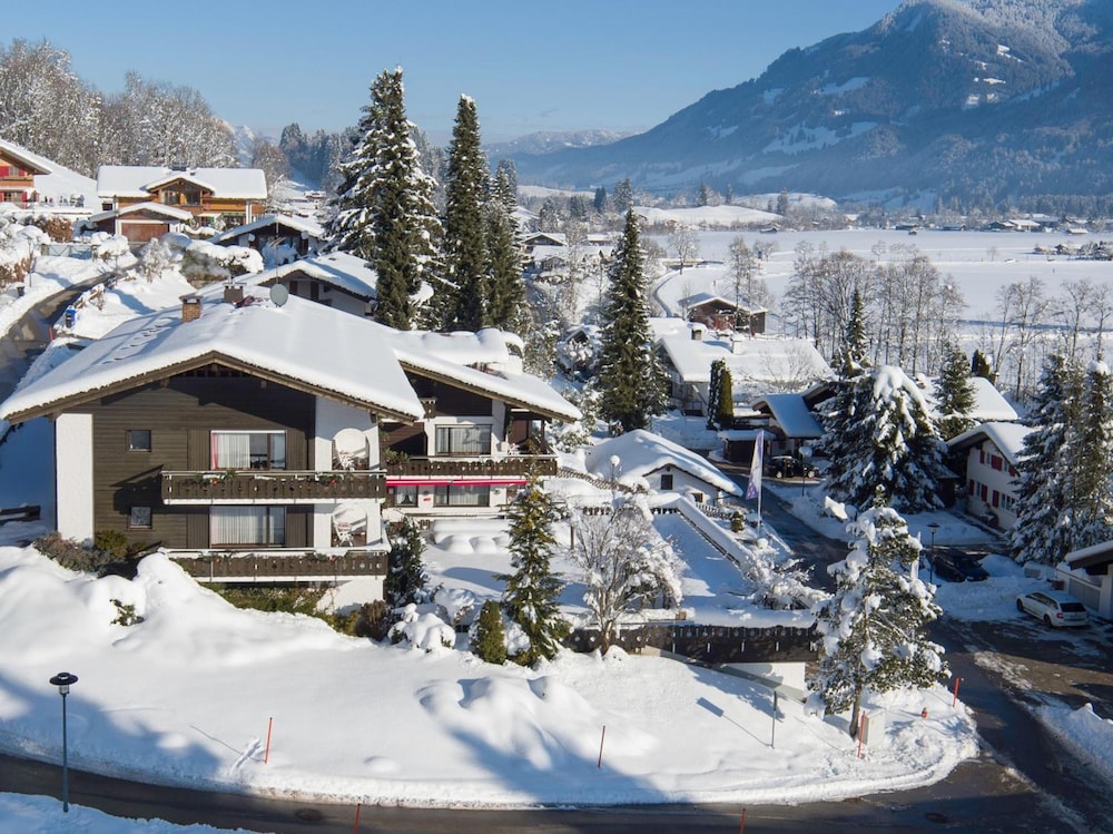 Hotel is in quiet location with views of the mountains from lounge, room and dining room. Warm swimming pool open all the time with sauna. Staff very friendly and speak English. Bed very comfortable and room very clean with balcony. Coffee and cake from 4pm to 5pm provided free. Free to take a roll for lunch from the excellent breakfast buffet. 15mins walk to town but mostly across quiet pasture land. Nebelhorn lift 2 miles away but we walked as nice walking through smart town and NTC rental can keep your skis overnight so not difficult walking.