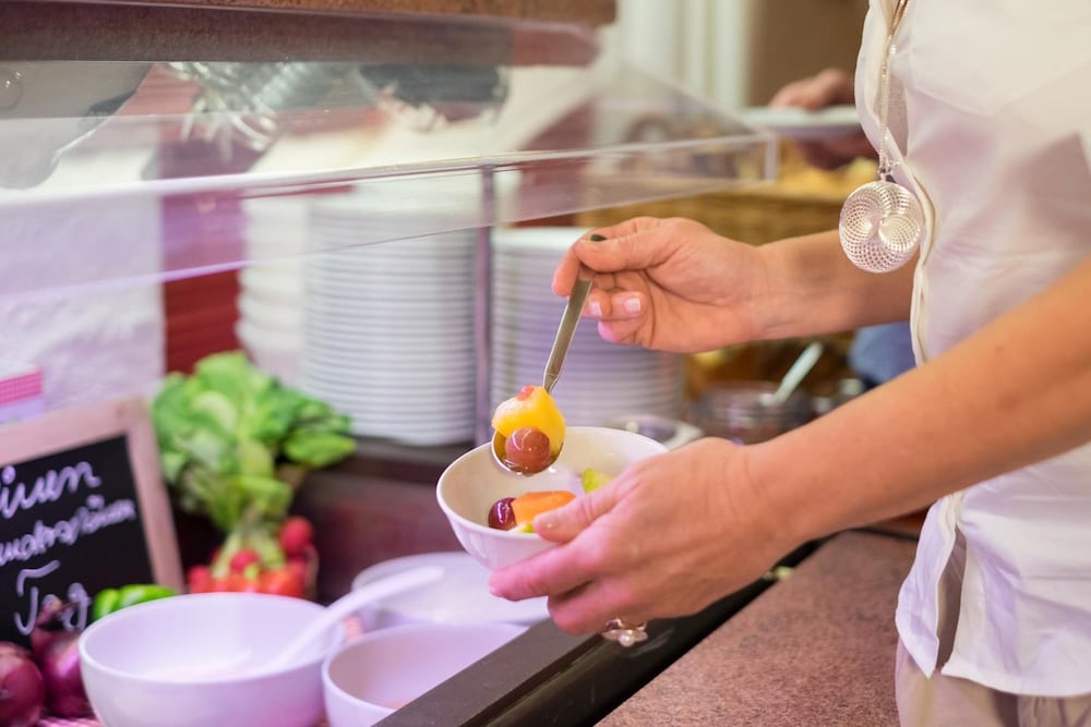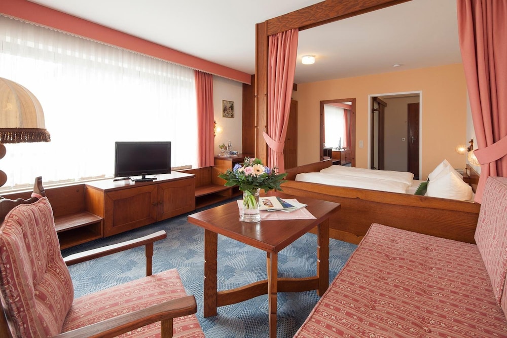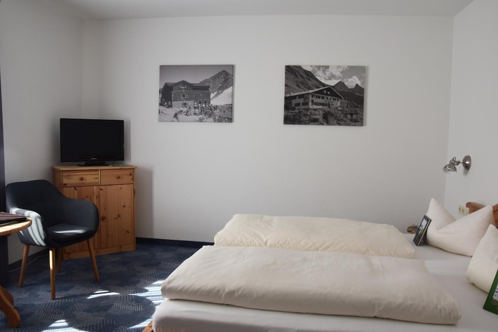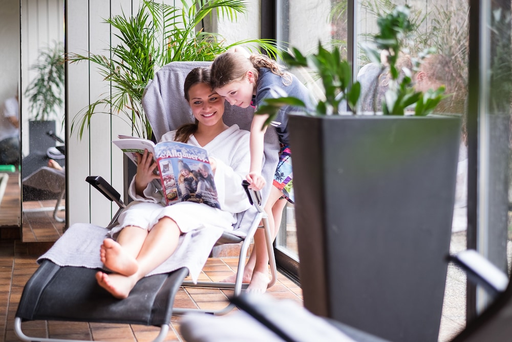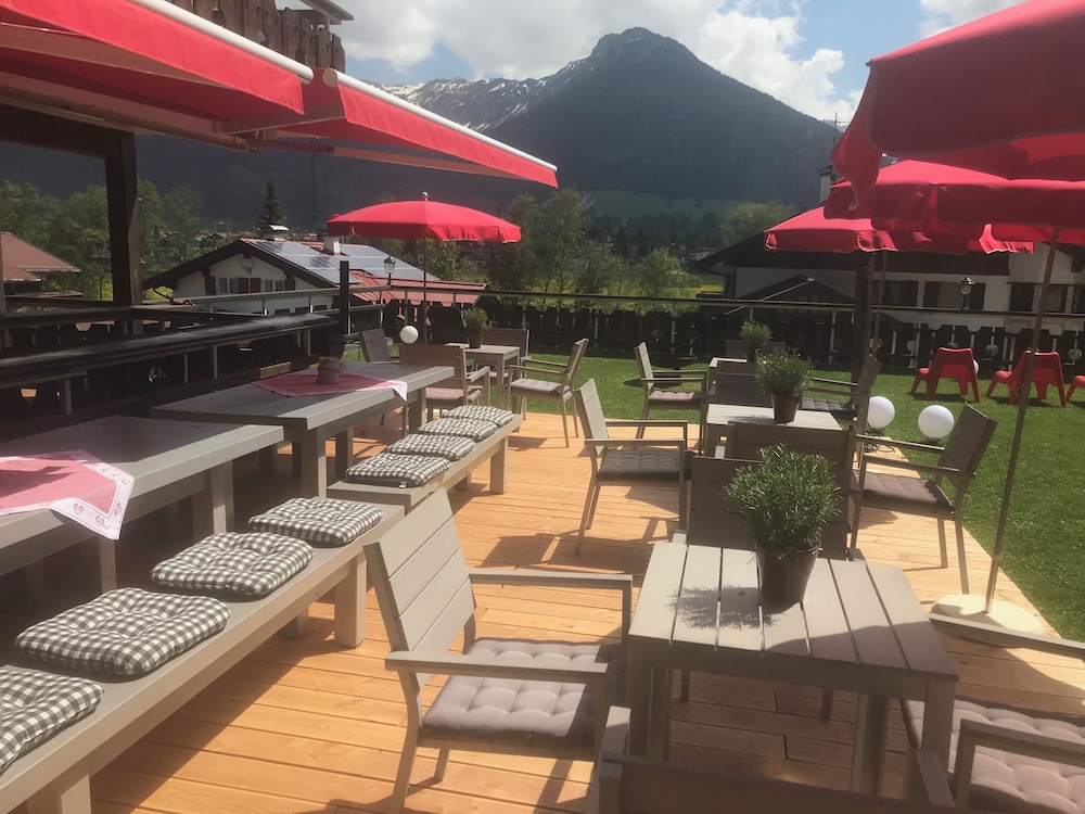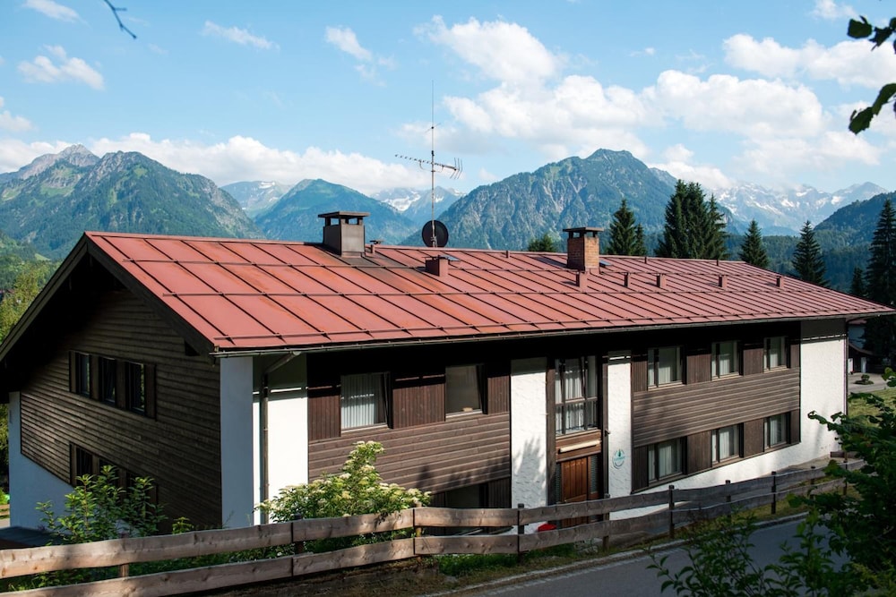 Hotel is in quiet location with views of the mountains from lounge, room and dining room. Warm swimming pool open all the time with sauna. Staff very friendly and speak English. Bed very comfortable and room very clean with balcony. Coffee and cake from 4pm to 5pm provided free. Free to take a roll for lunch from the excellent breakfast buffet. 15mins walk to town but mostly across quiet pasture land. Nebelhorn lift 2 miles away but we walked as nice walking through smart town and NTC rental can keep your skis overnight so not difficult walking.
