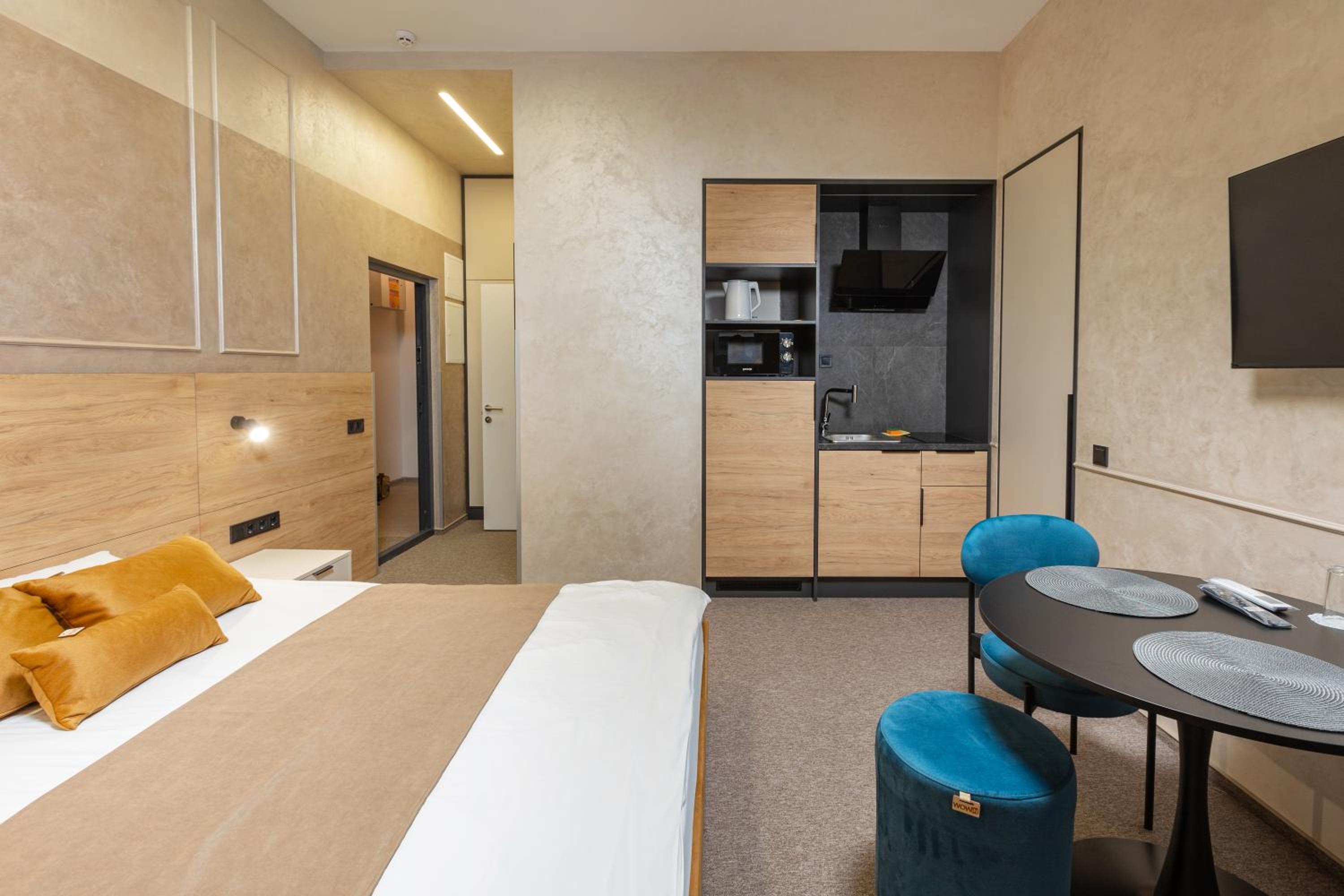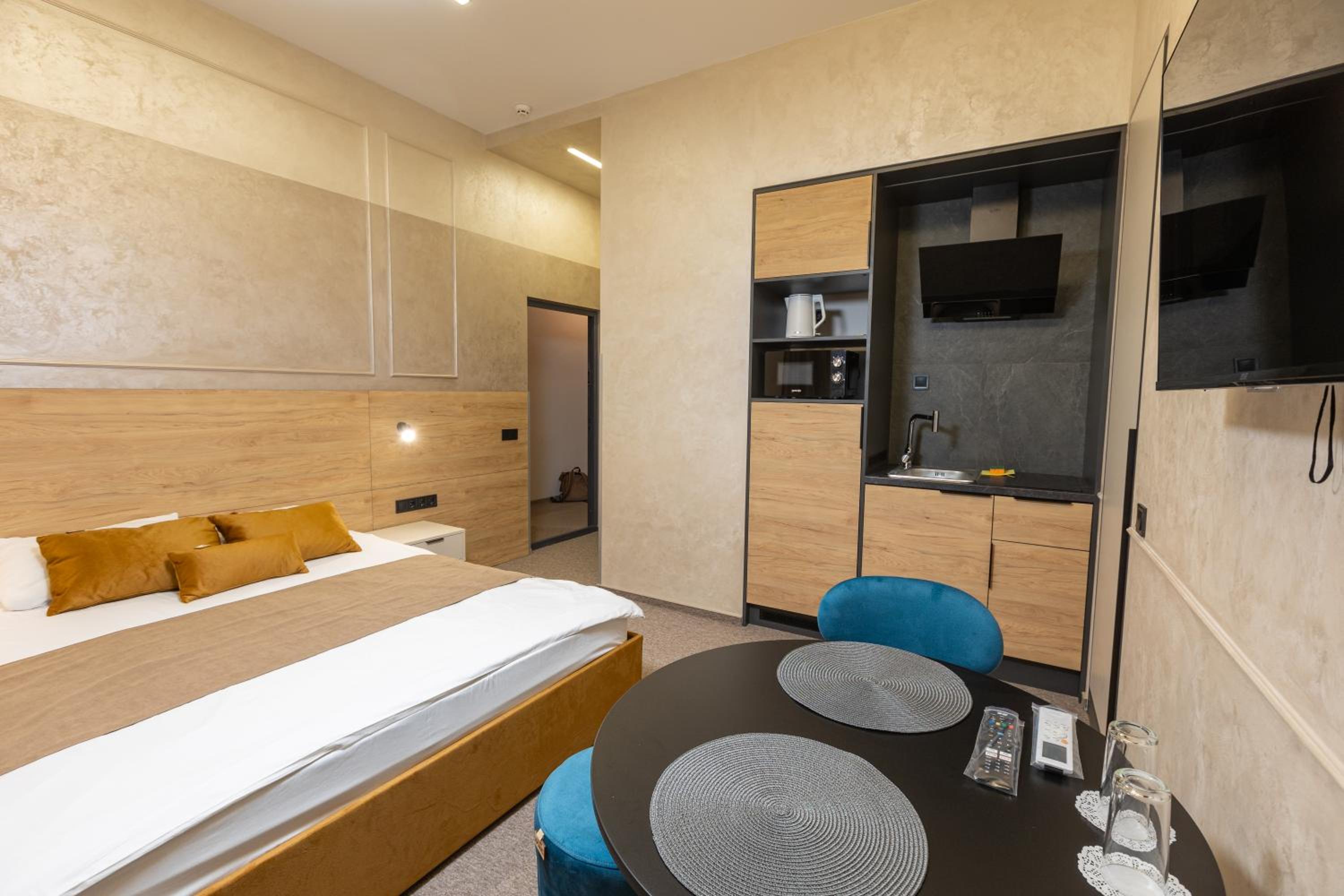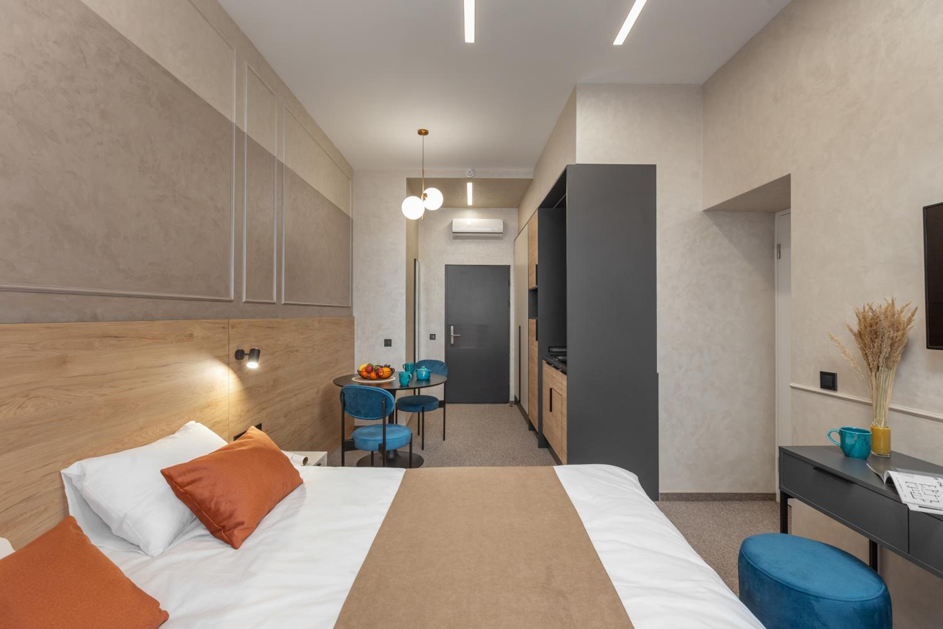 Our apartments feature fully equipped kitchenettes, flat-screen TVs, and private bathrooms with bidets and slippers. Relax in comfort with air conditioning, free WiFi, and 24-hour front desk service. Plus, enjoy the convenience of a minimarket on-site.