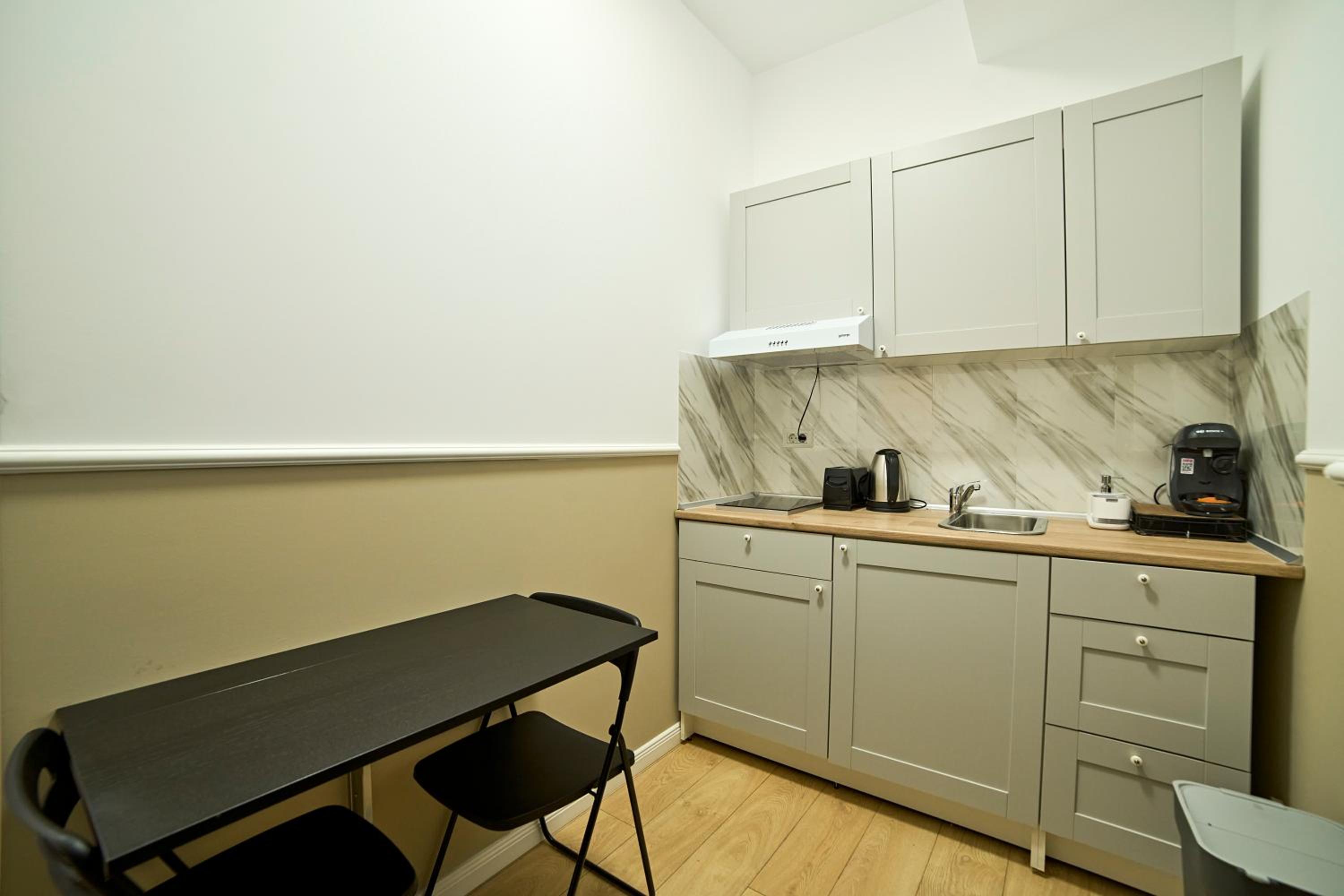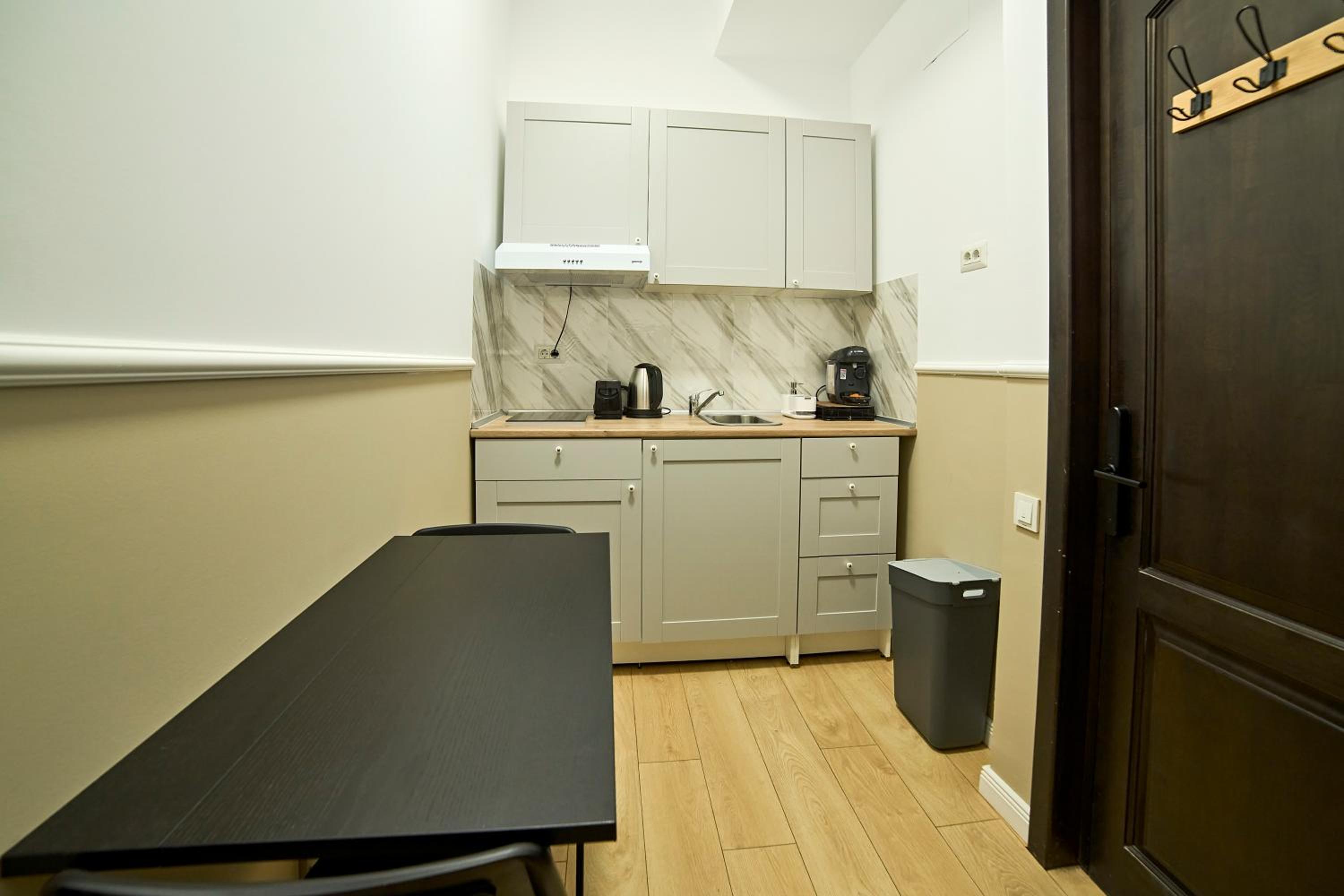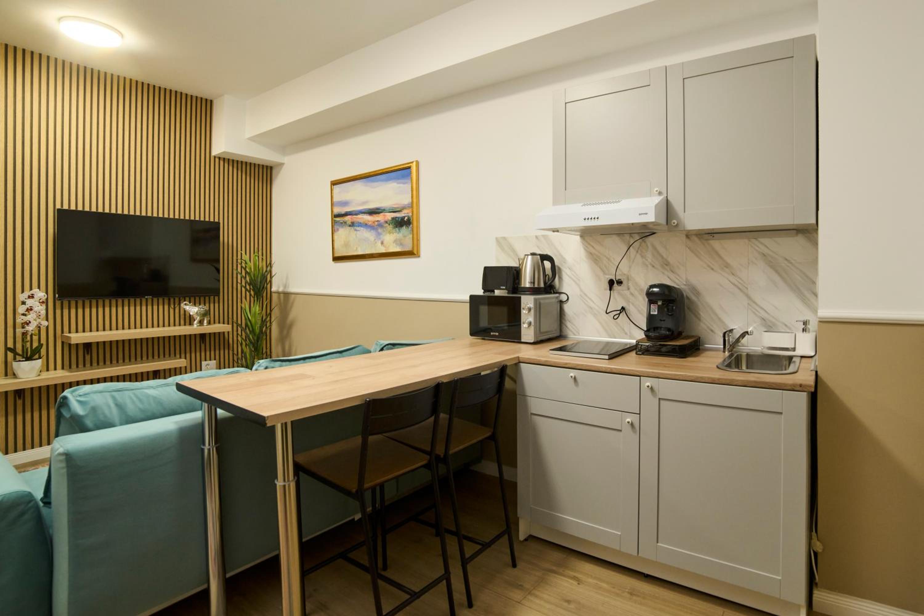 Dobrze wyposażony pokój z aneksem kuchennym.