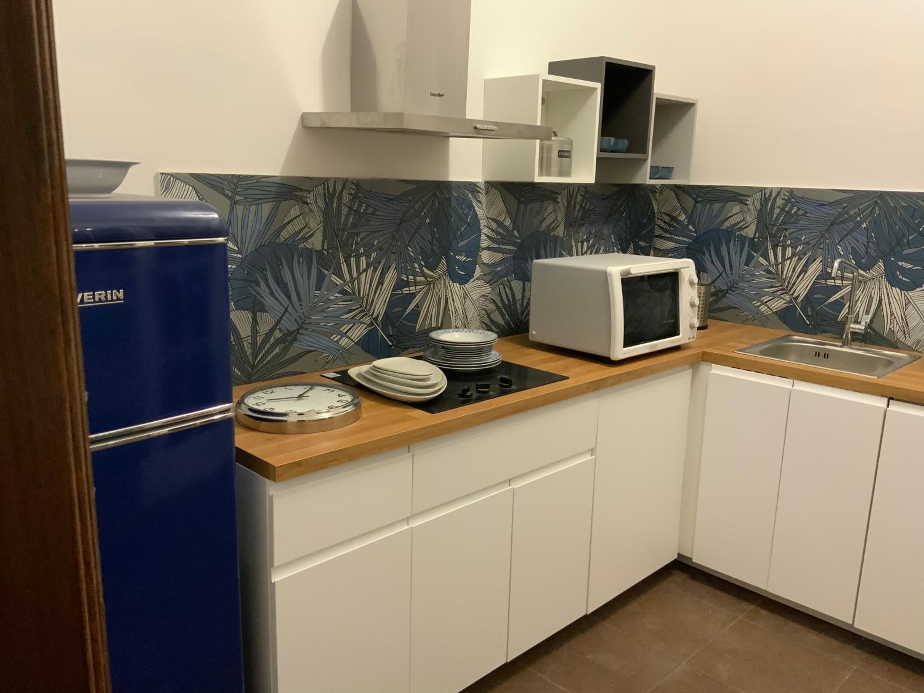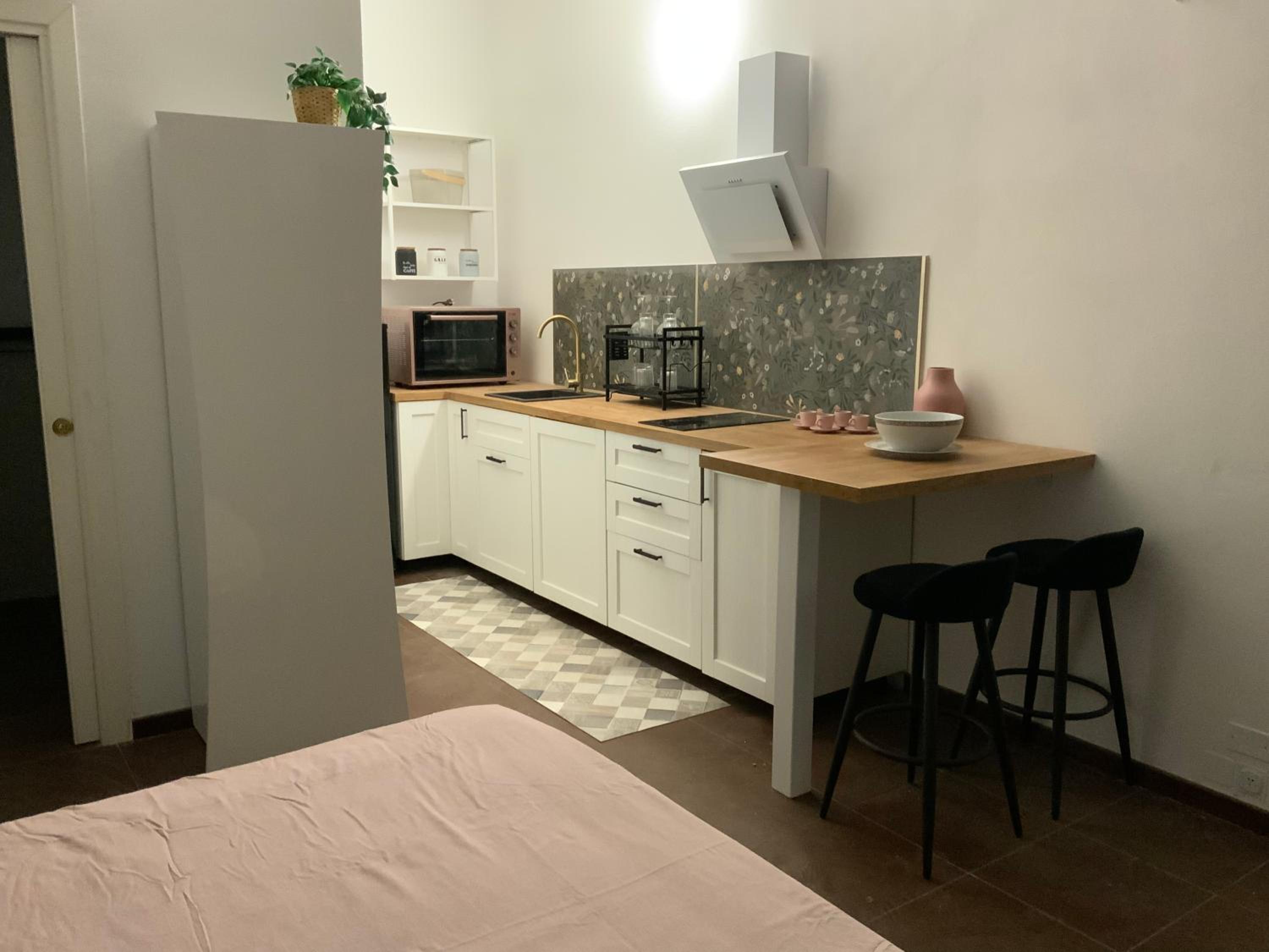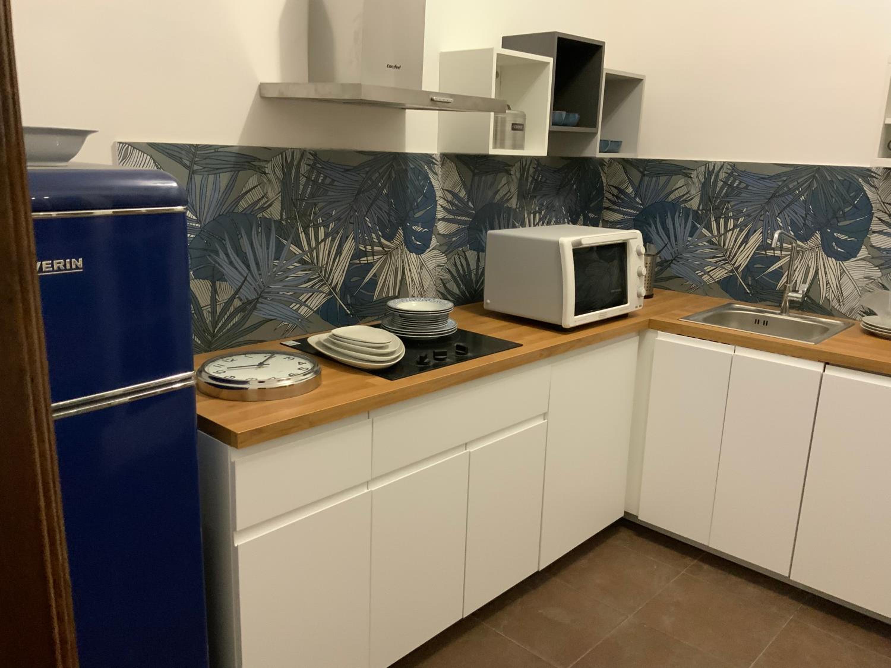 Metterei su una mensola in stanza un fornetto a microonde oppure una friggitrice ad aria per poter scaldare velocemente i pasti. Ma non è indispensabile ci si arrangia tranquillamente