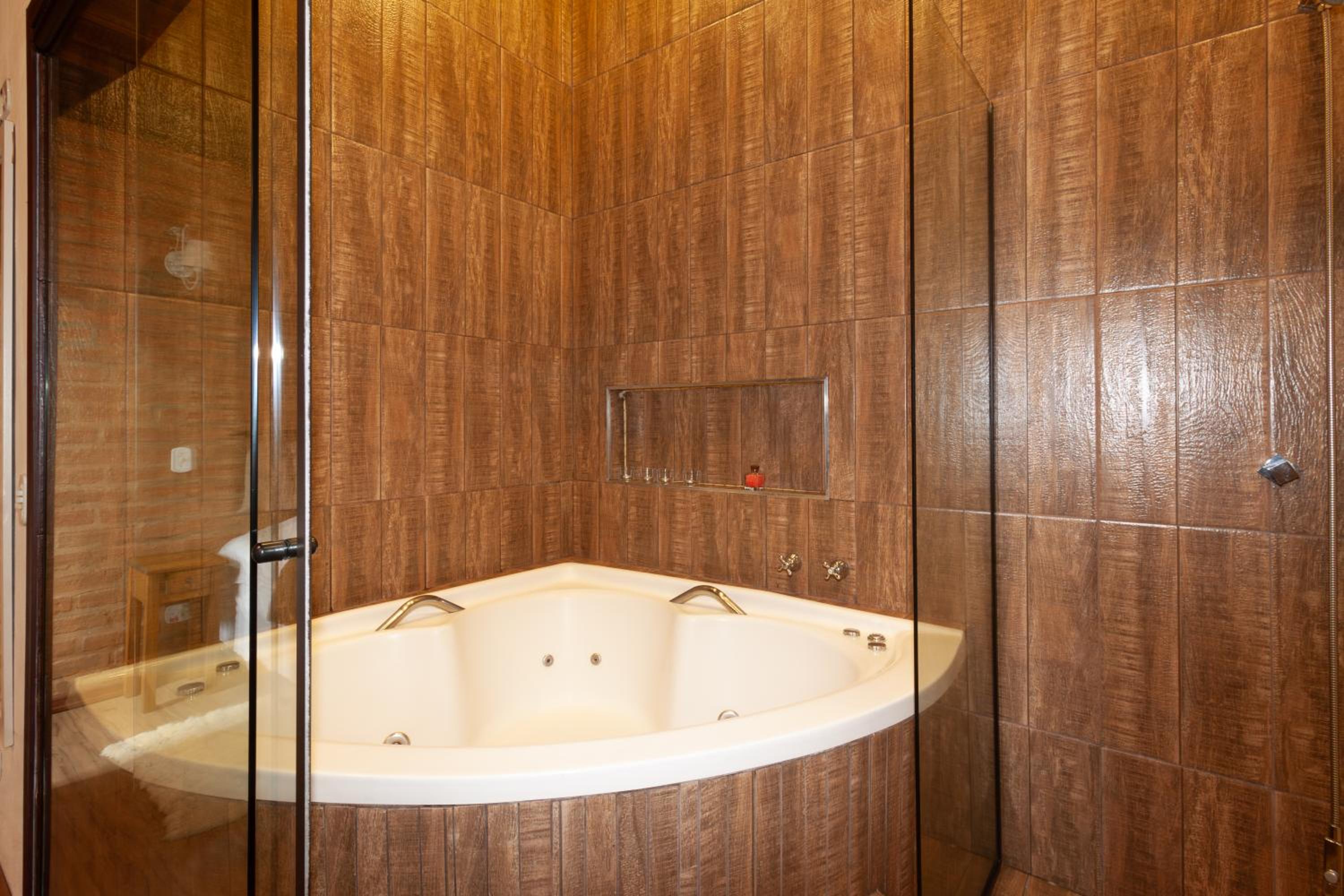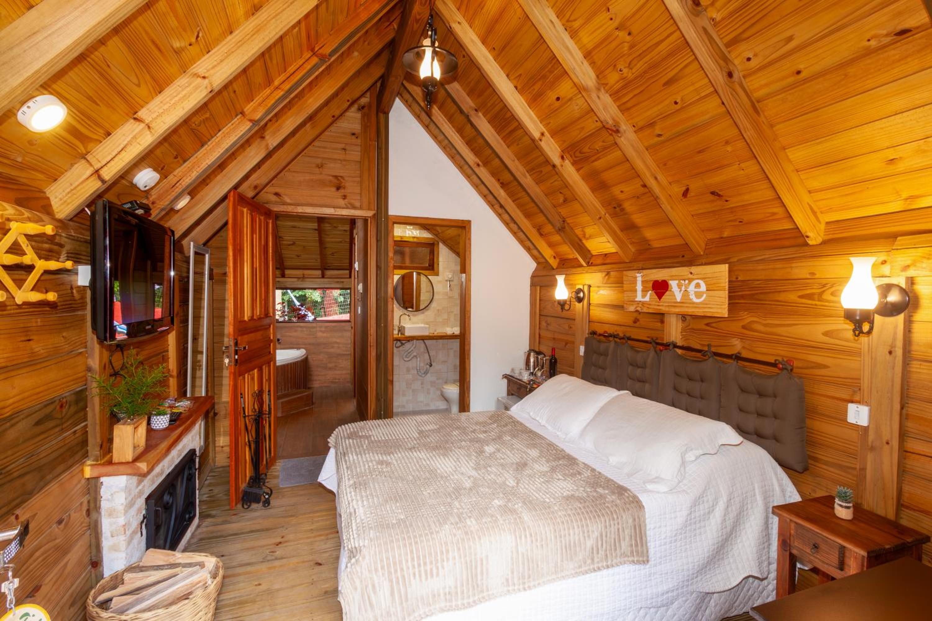 Quarto grande, bem arejado e fresco, com lareira e banheira de ótimo tamanho