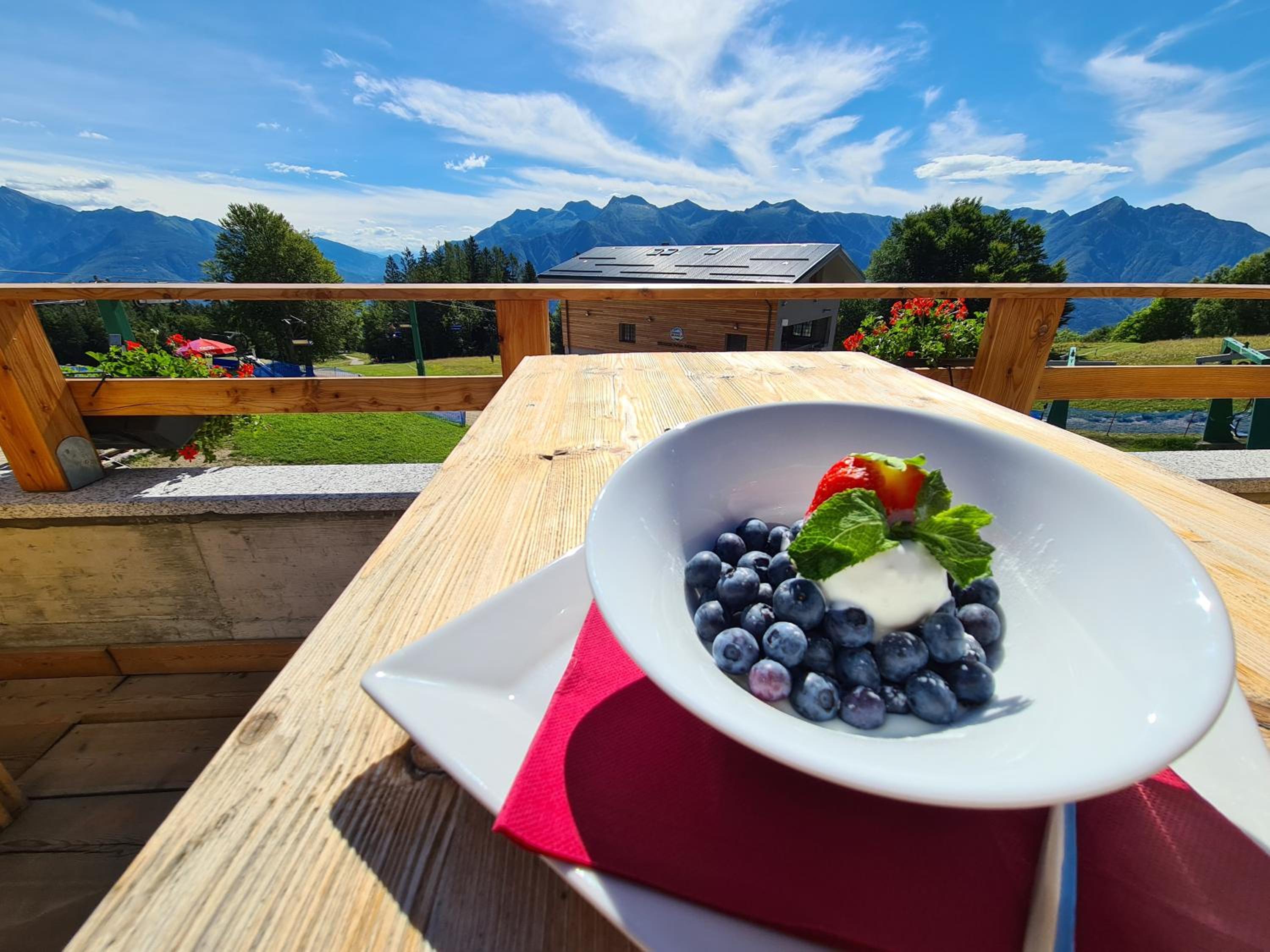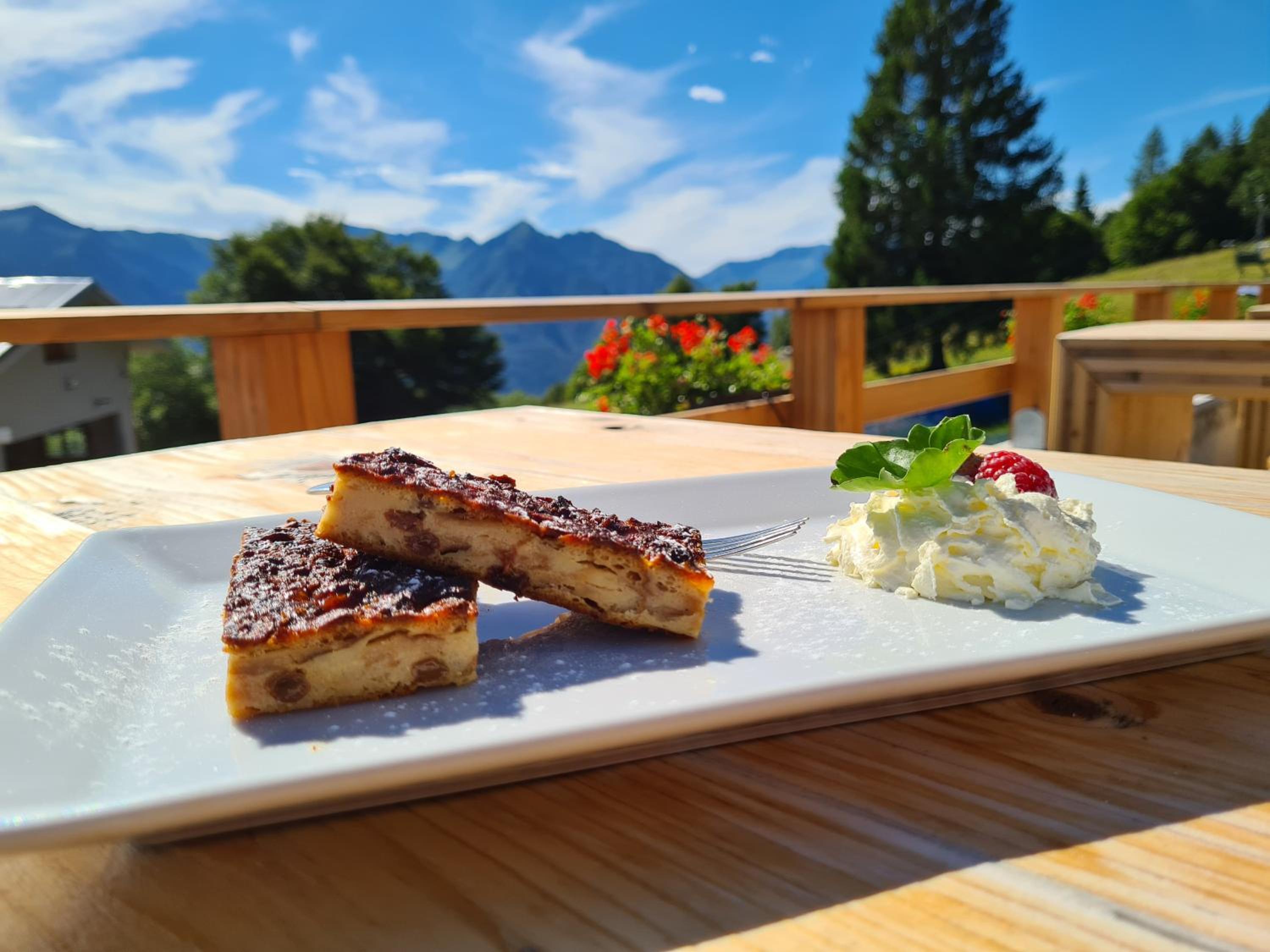 Das Abendessen war fein. Das Frühstück war ebenfalls tiptop. Das Bergpanorama ein Traum. Dieses kann man auf der schönen Terrasse voll geniessen.