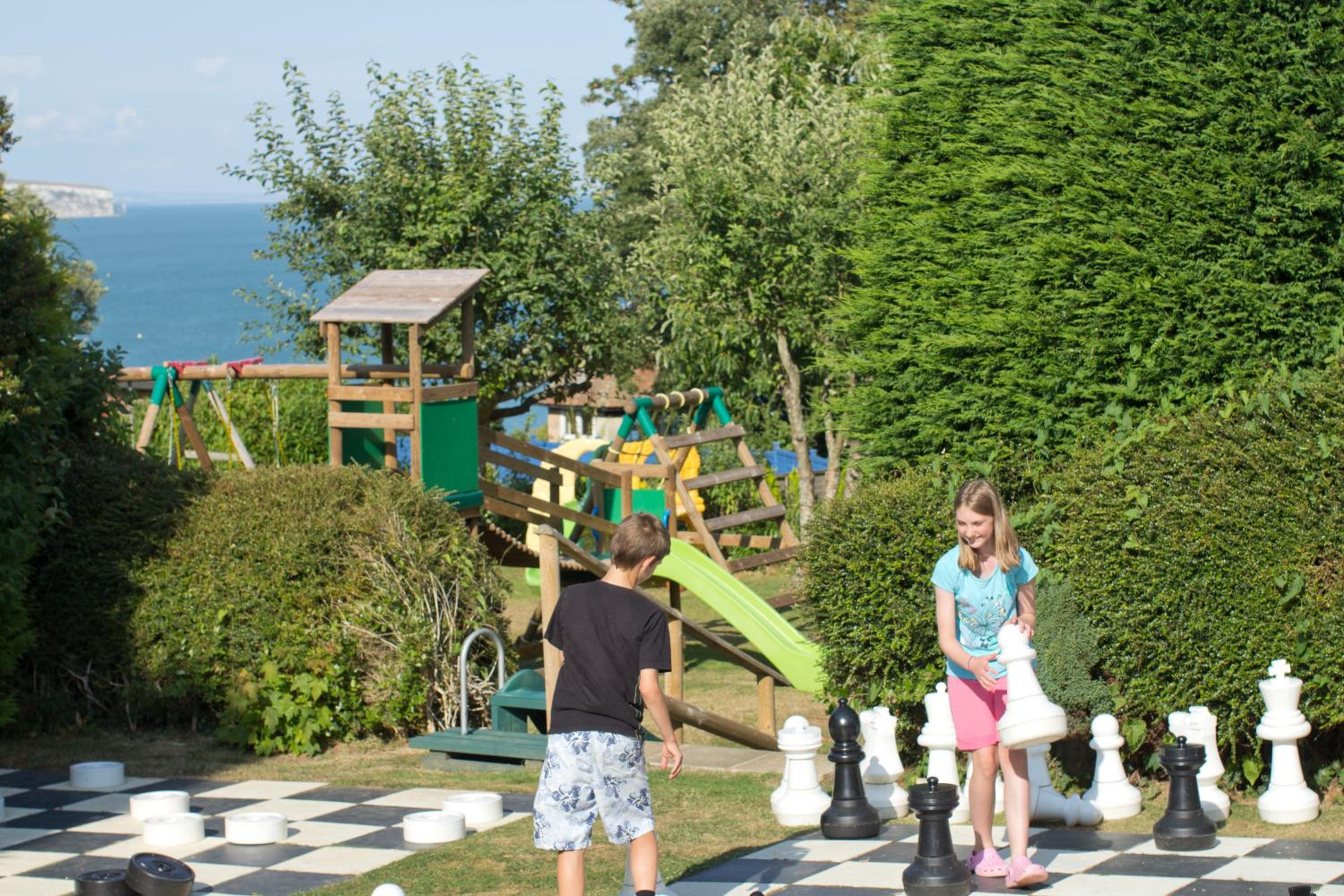 Perched on a cliff-top, Luccombe Hall offers breathtaking sea views and serene gardens with fun activities for all ages, including a giant chess set and a children's play area.