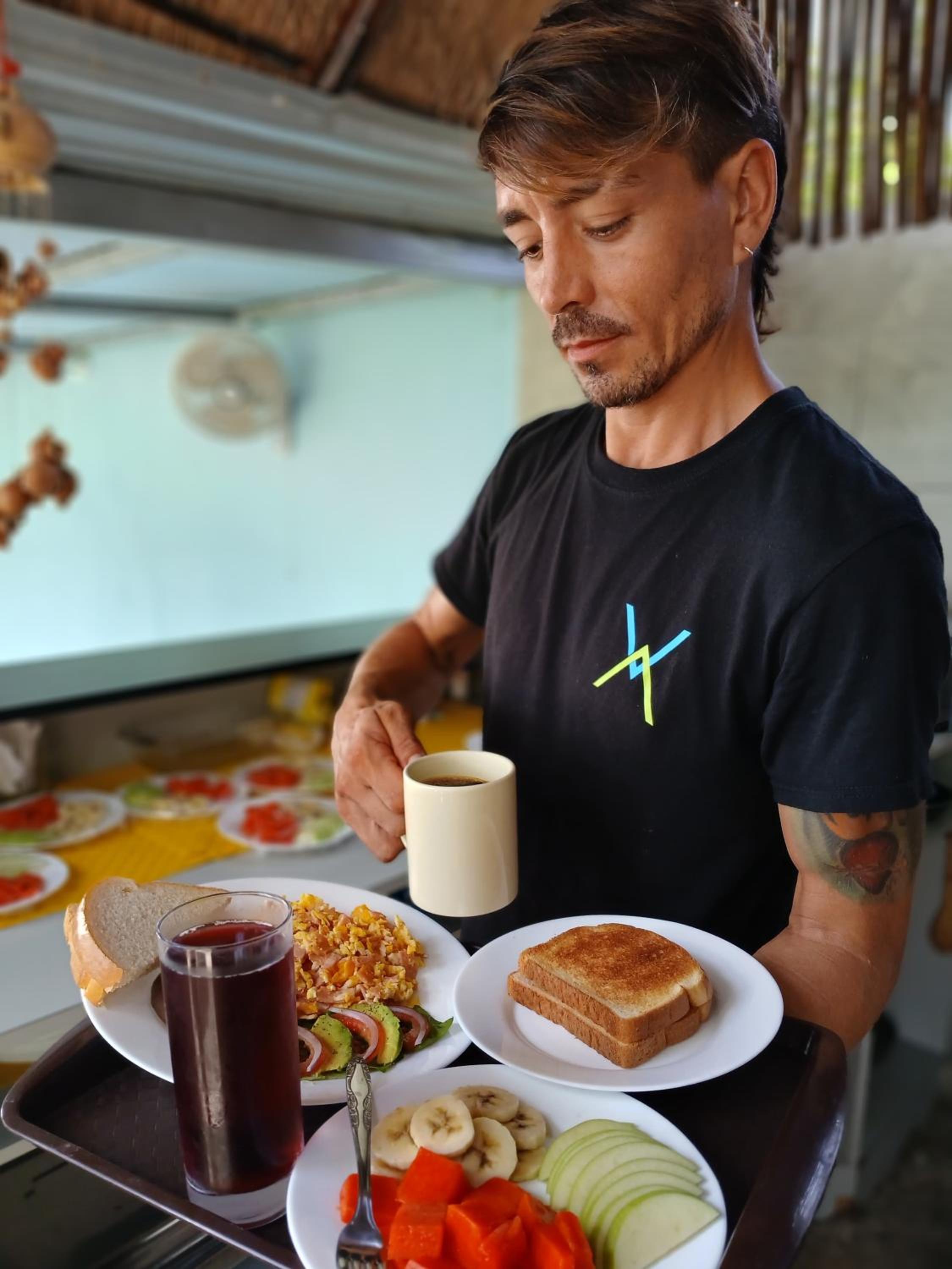 Le petit déjeuner reste très sobre. Tartine fruit ☕️ ☕️