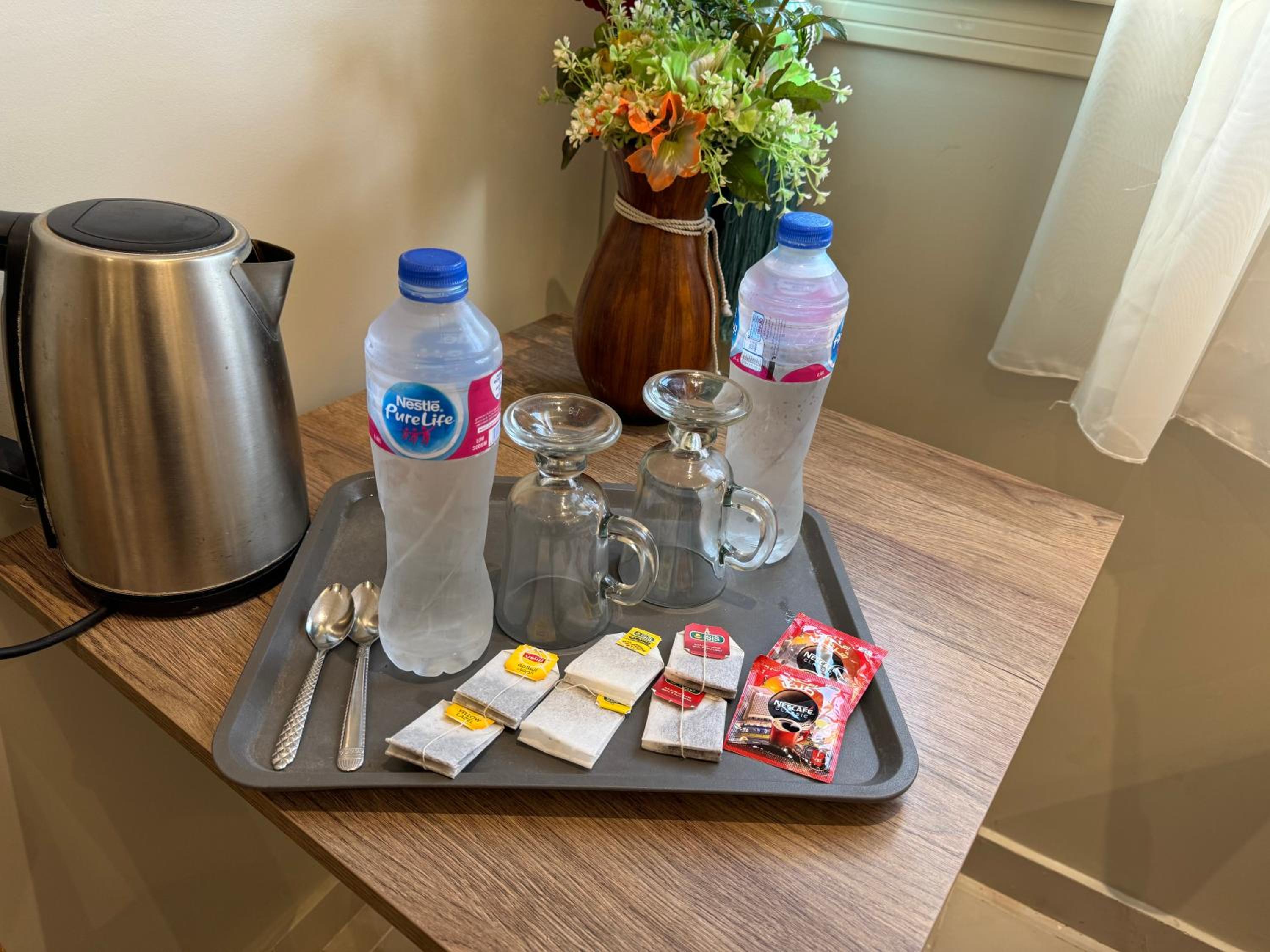 مثل مرافق الشاى والقهوة وزجاجة مياه على الاقل وشبشب للاستحمام