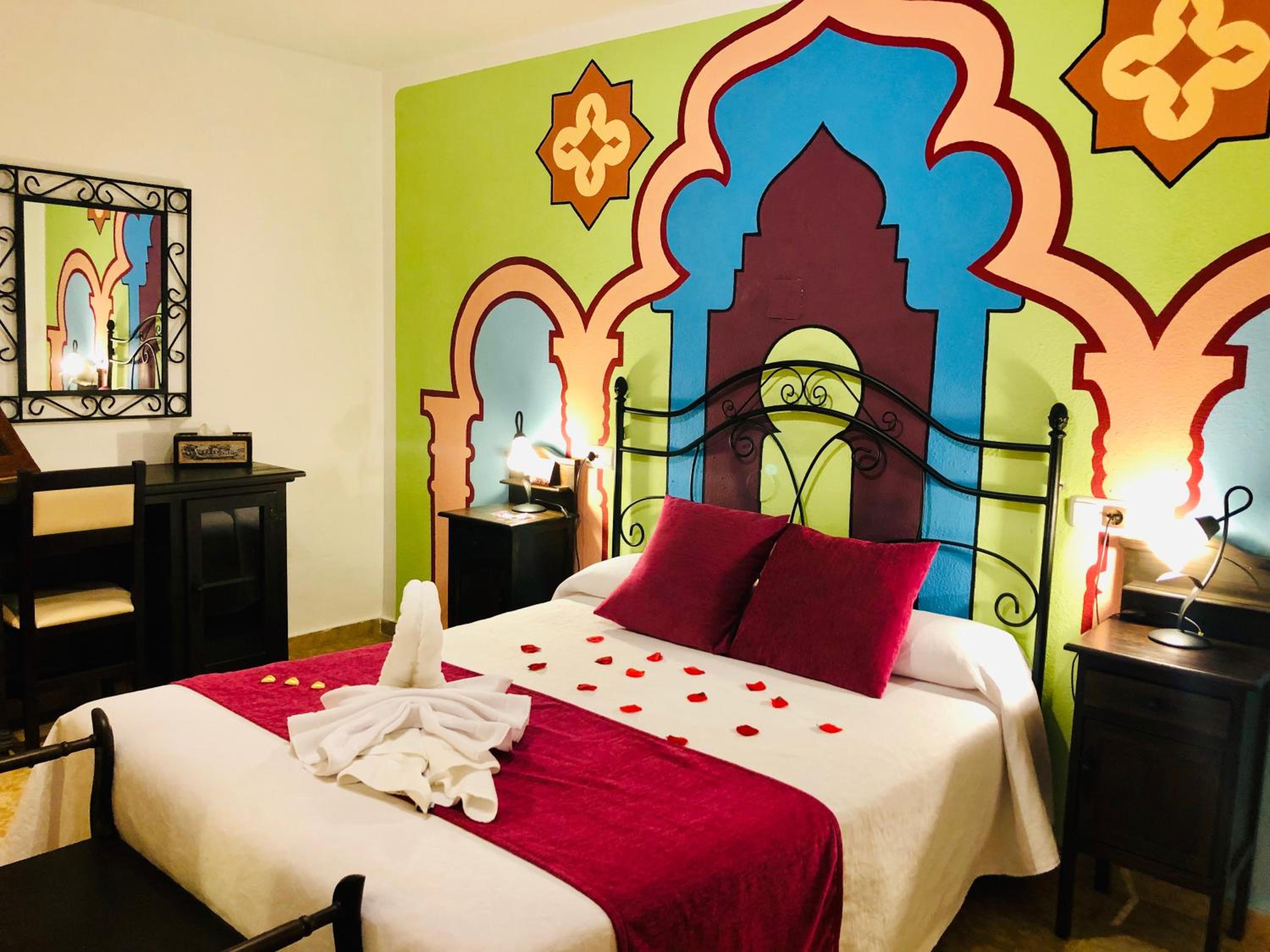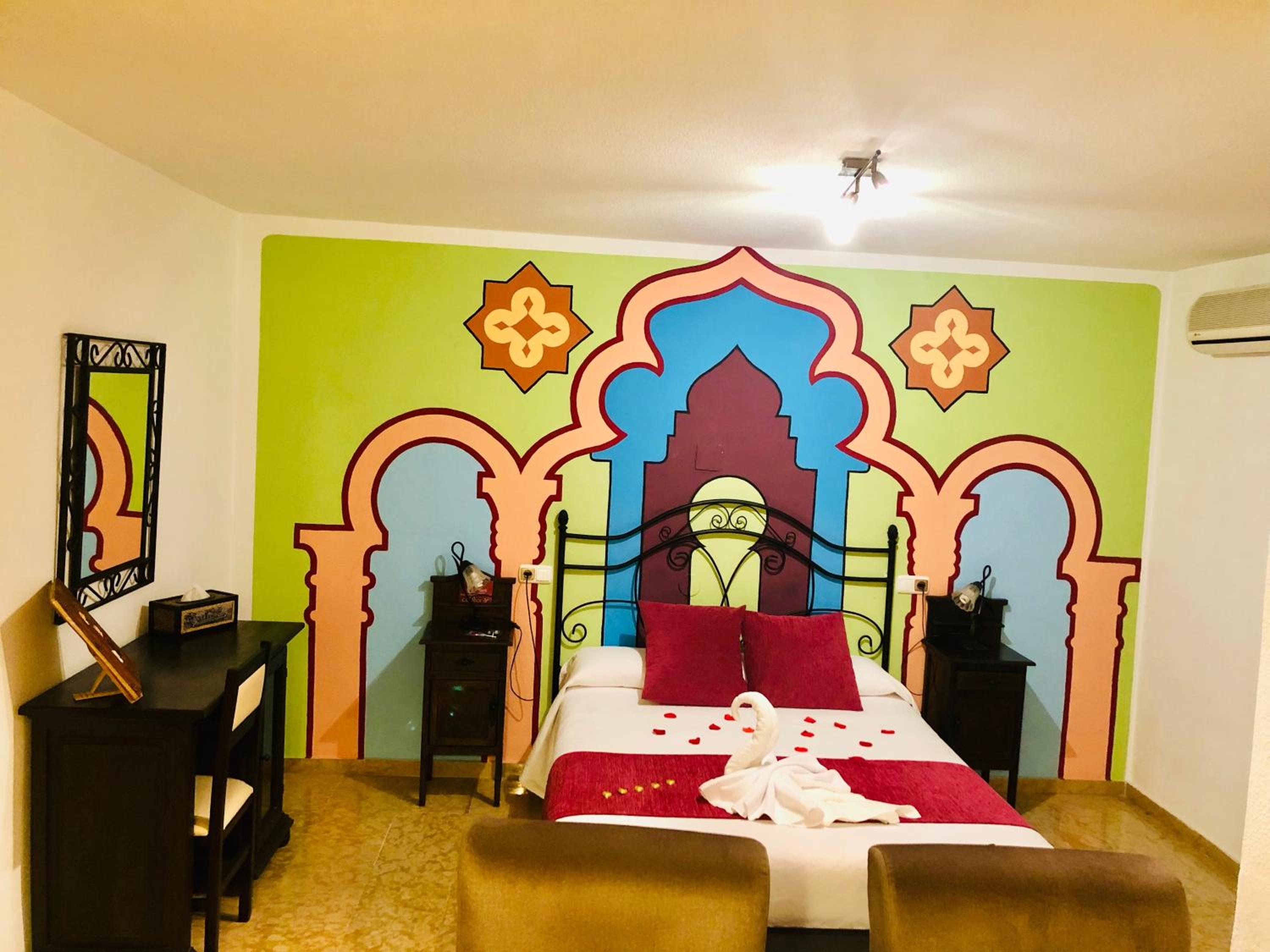 Hotel Puerta Nazarí in Orgiva offers a picturesque setting with breathtaking views of the Sierra Nevada Mountains. Each room is beautifully decorated with an Arabic-style mural and features modern amenities including air conditioning and a balcony.