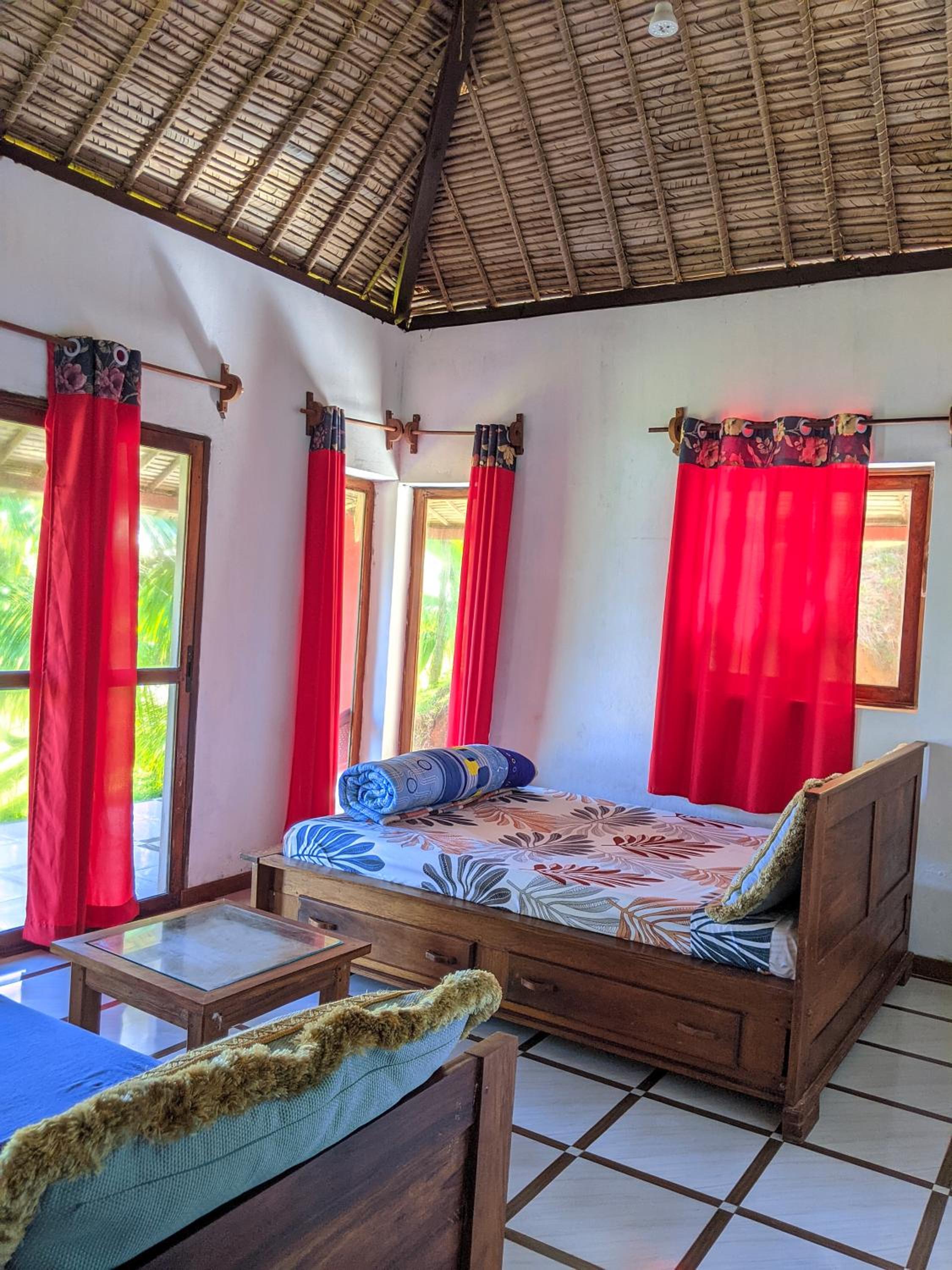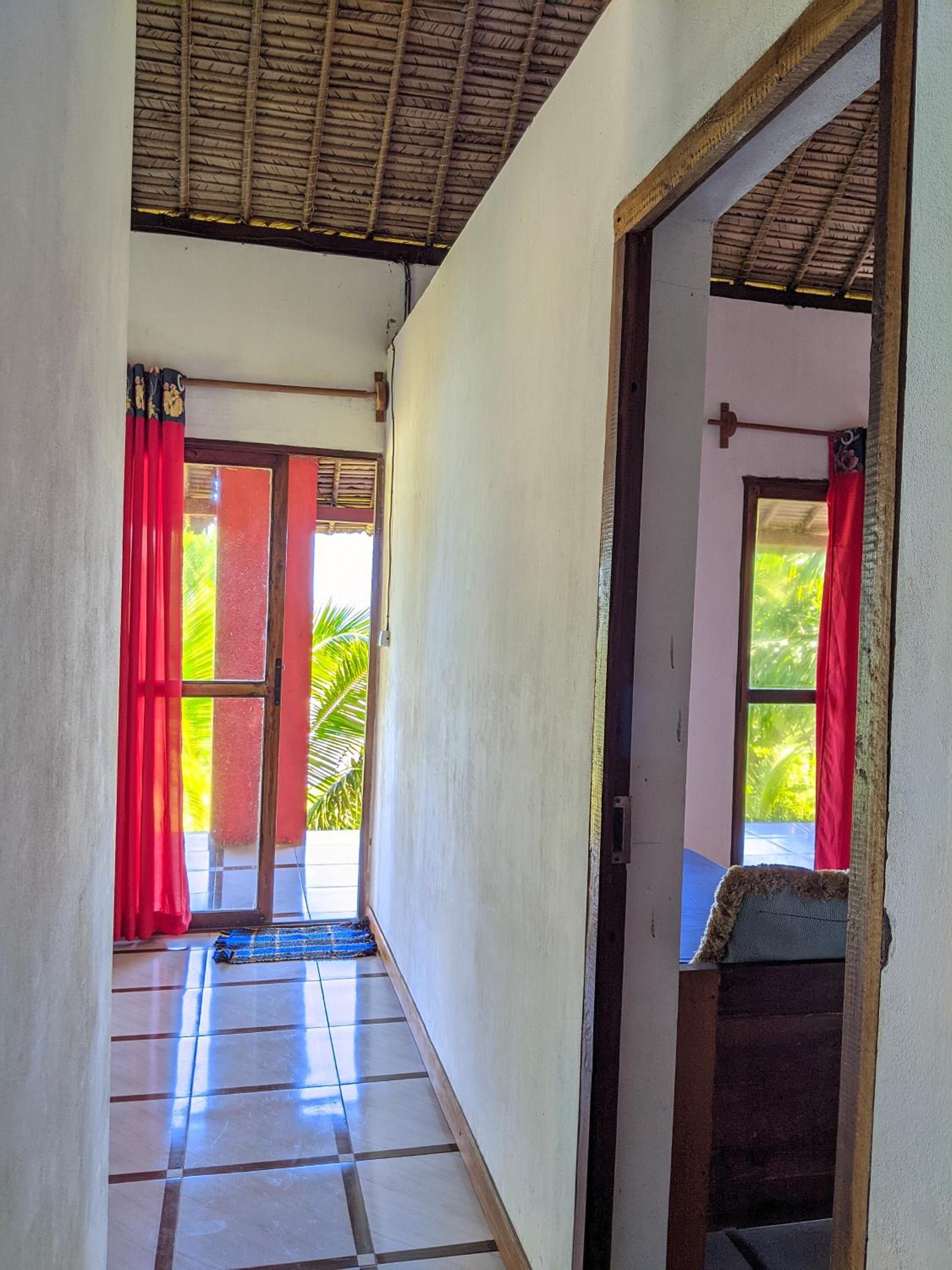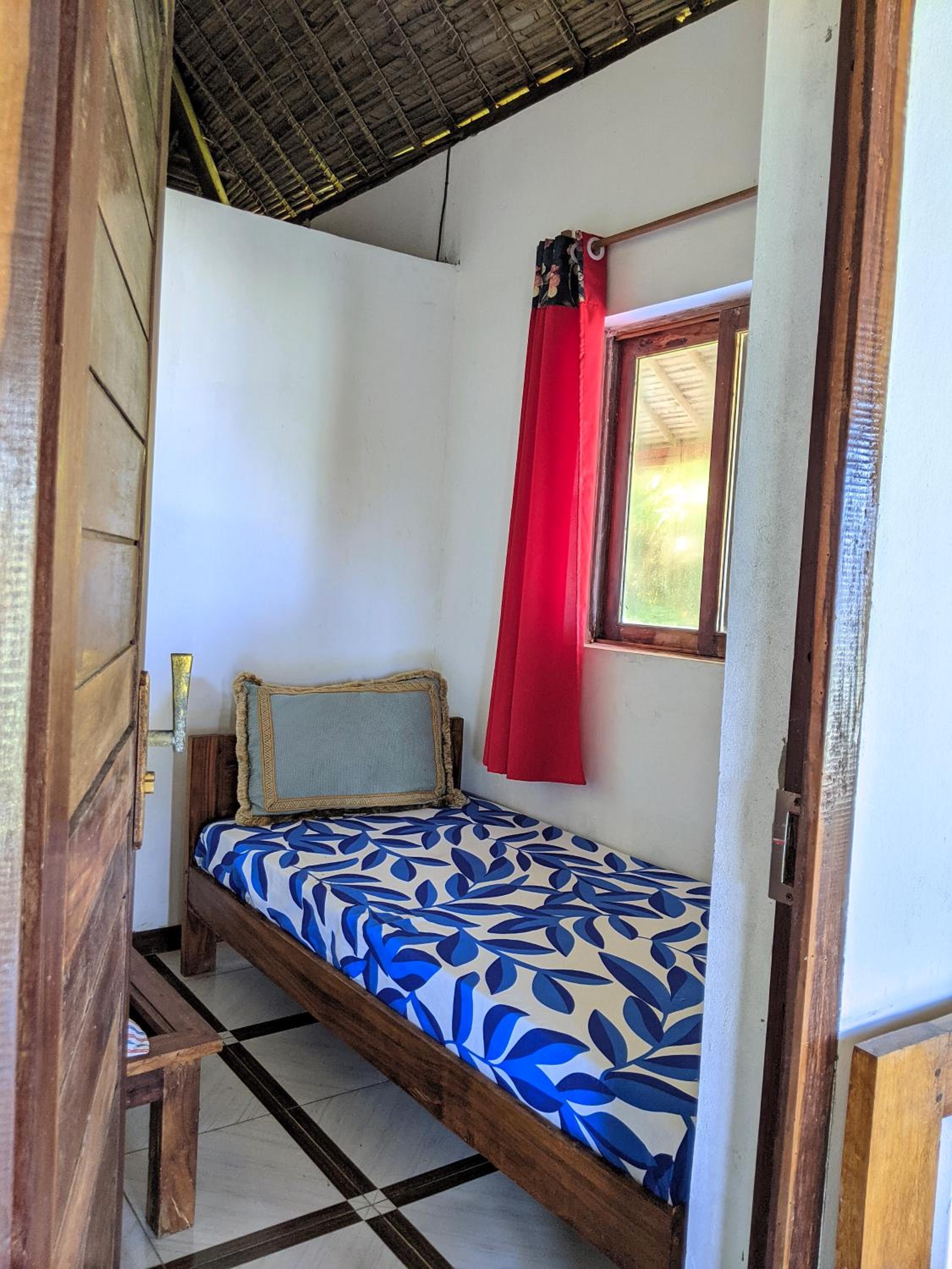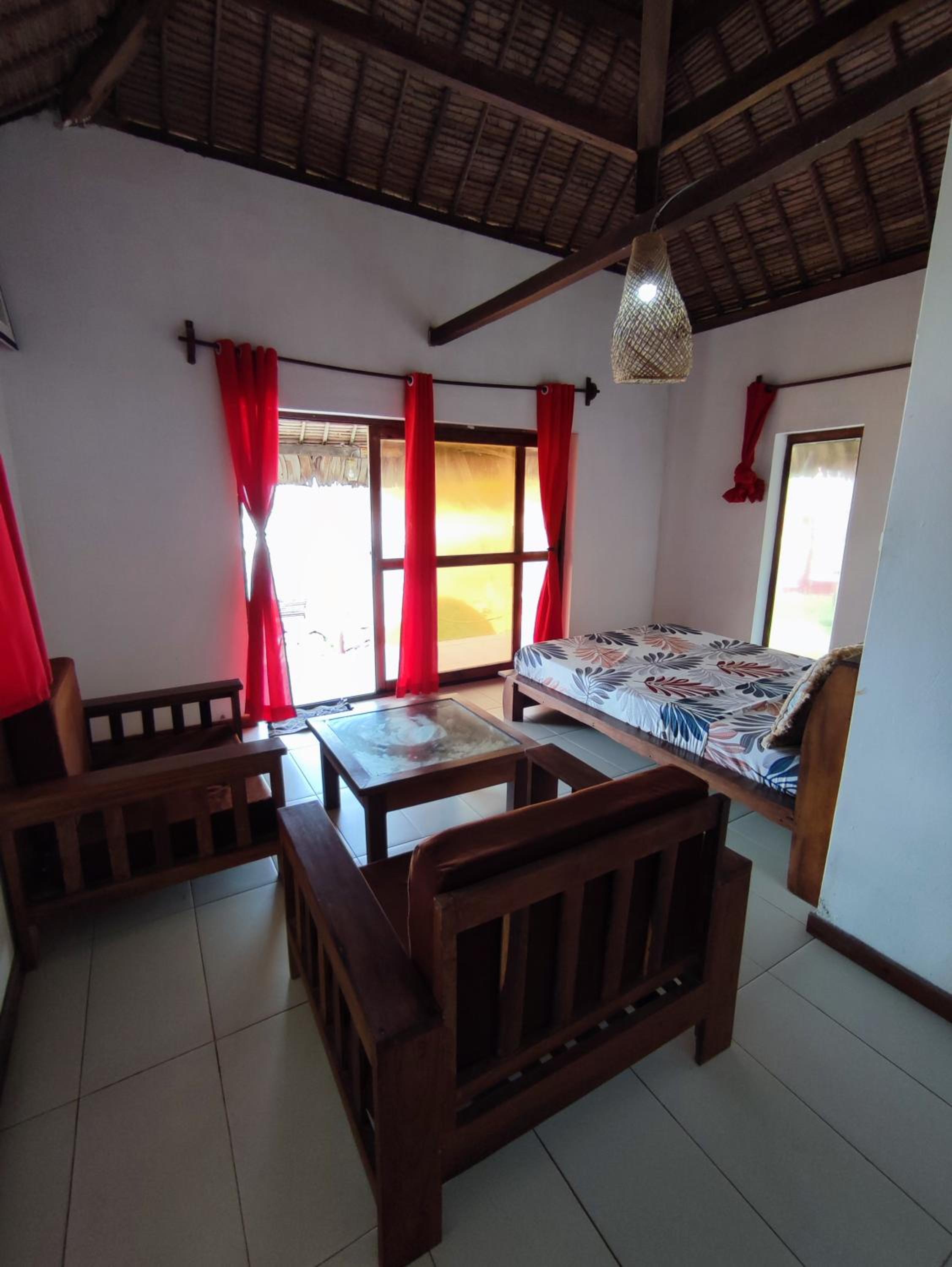La salle de douche est sombre et un peu vétuste. Des pailles tombent depuis le plafond sur le sol et sur le lit. Un rafraichissement ferait du bien au bungalow. Mais pour le prix payé, je ne peux pas me plaindre!