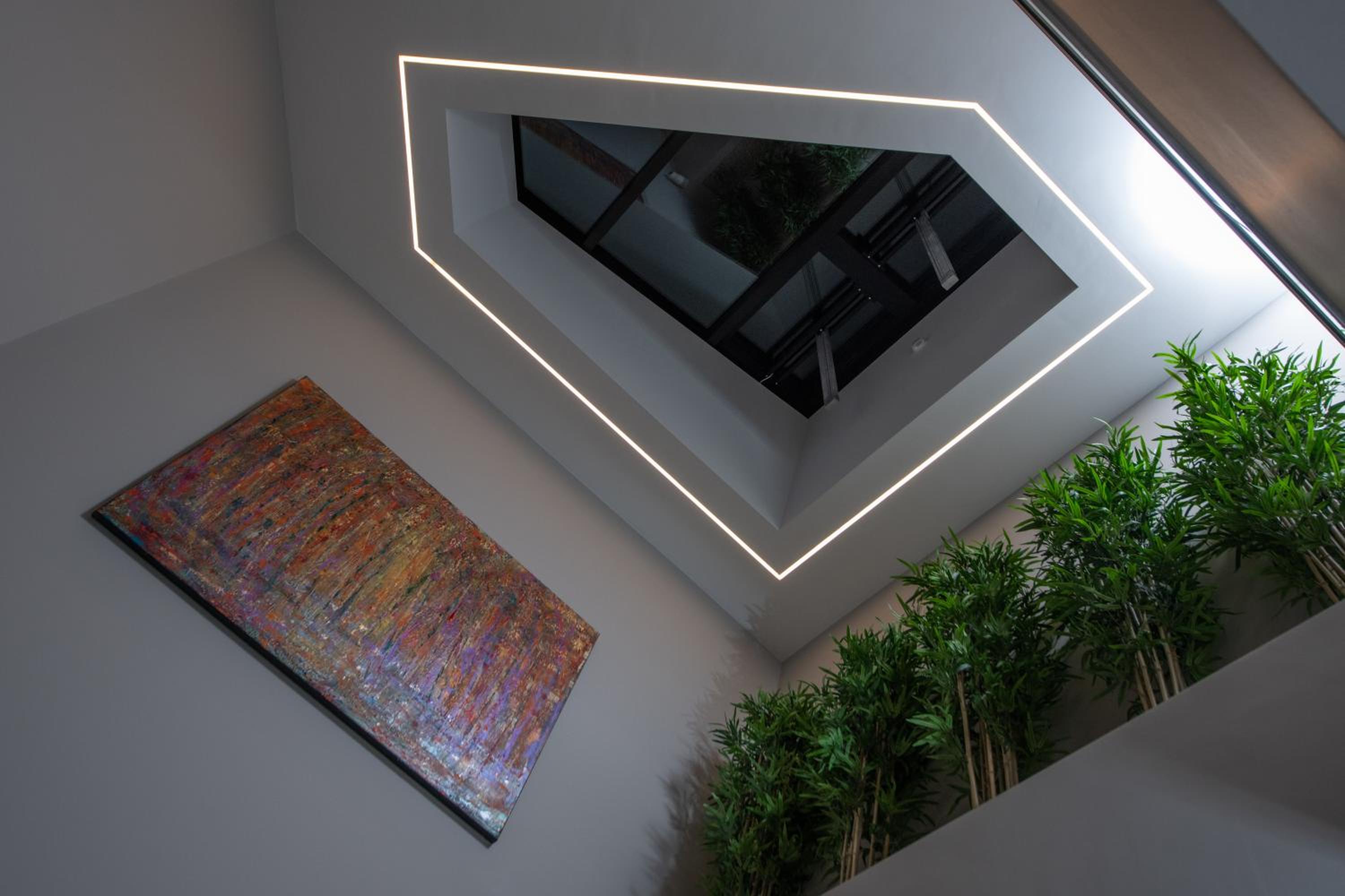 Contemporary feel, location and love the light settings. Area to work in downstairs and coffee