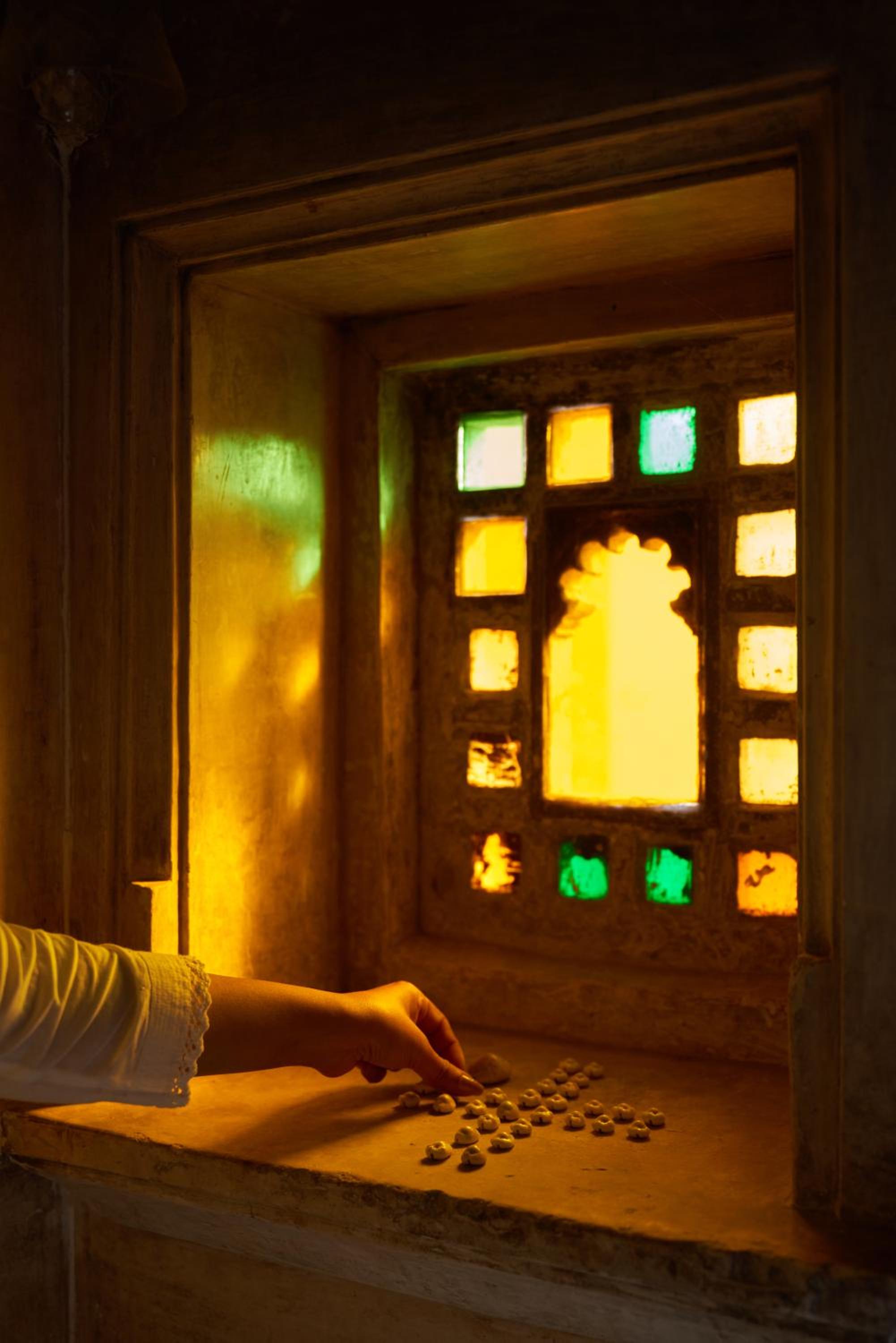 The room had some tiny coloured-glass windows which could not be opened or closed as they were behind a glass panel. As a consequence, the air was dusty and stuffy. One of the windows was right above the bed's headboard and there were no curtains, so the light would shine on us in the early morning and wake us up.