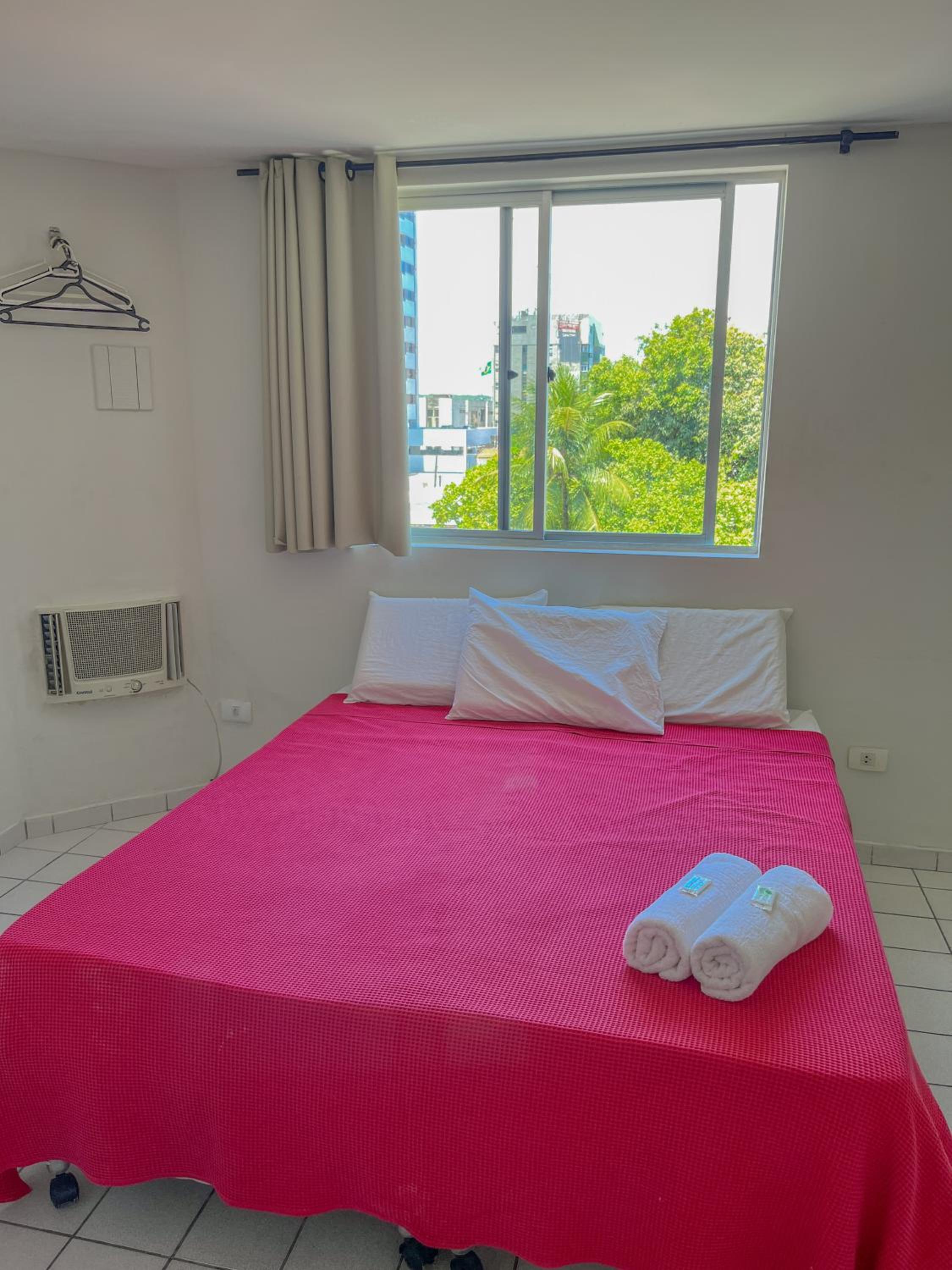 Each guest room at Hotel América Praia features a flat-screen TV, air conditioning, and a private bathroom, ensuring a comfortable stay for all guests.