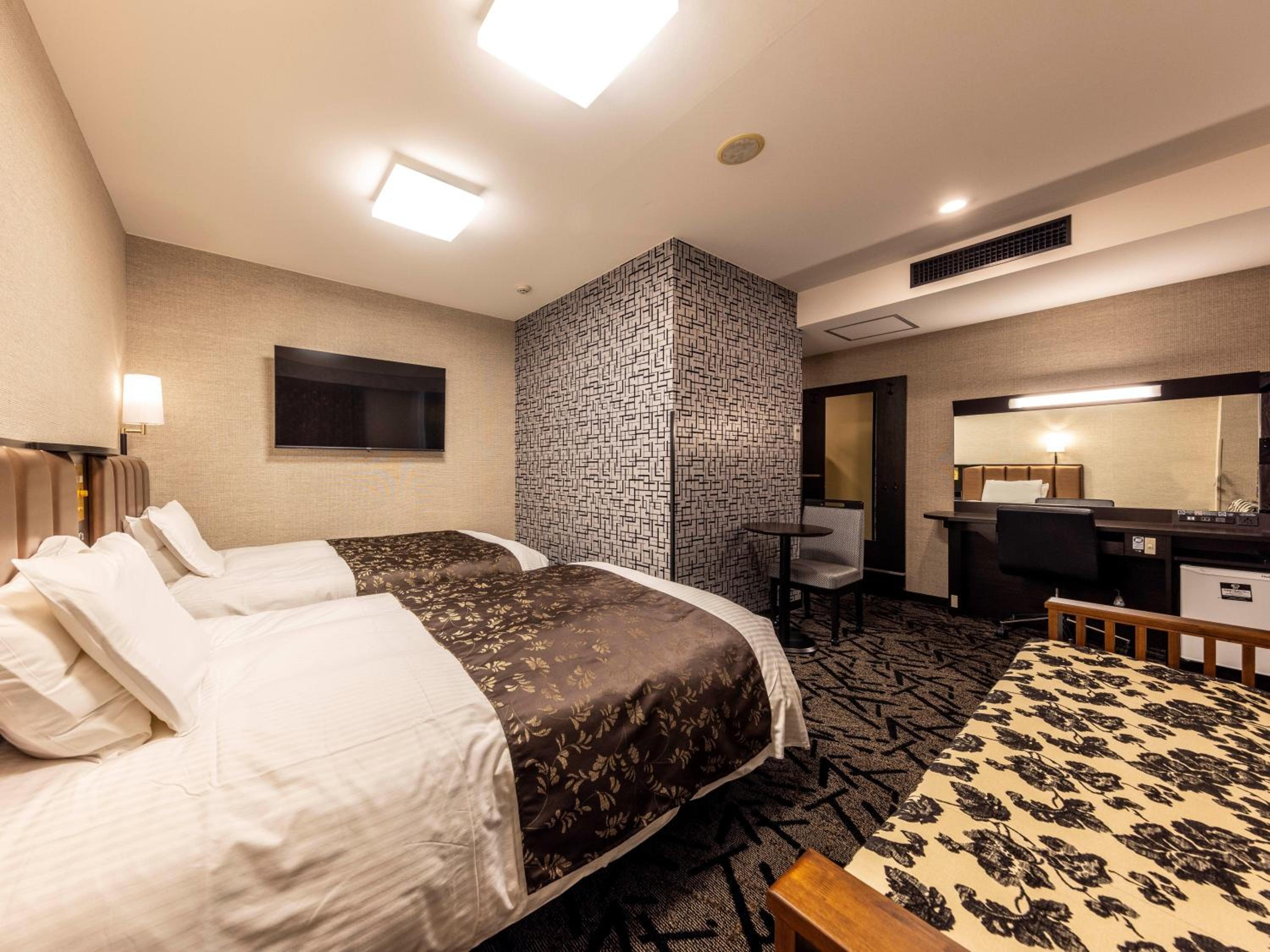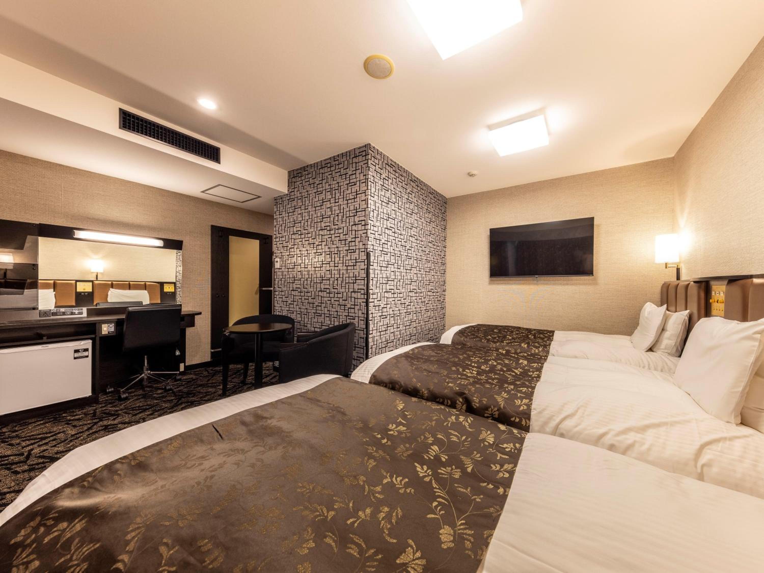 The air-conditioned rooms at the hotel boast a modern décor and comfortable beds for a restful stay. Each room is equipped with a 40-inch flat-screen TV, free Wi-Fi/wired internet access, a refrigerator, and an electric kettle. The en suite bathroom comes with essential amenities, a hairdryer, and a Japanese robe for added comfort.