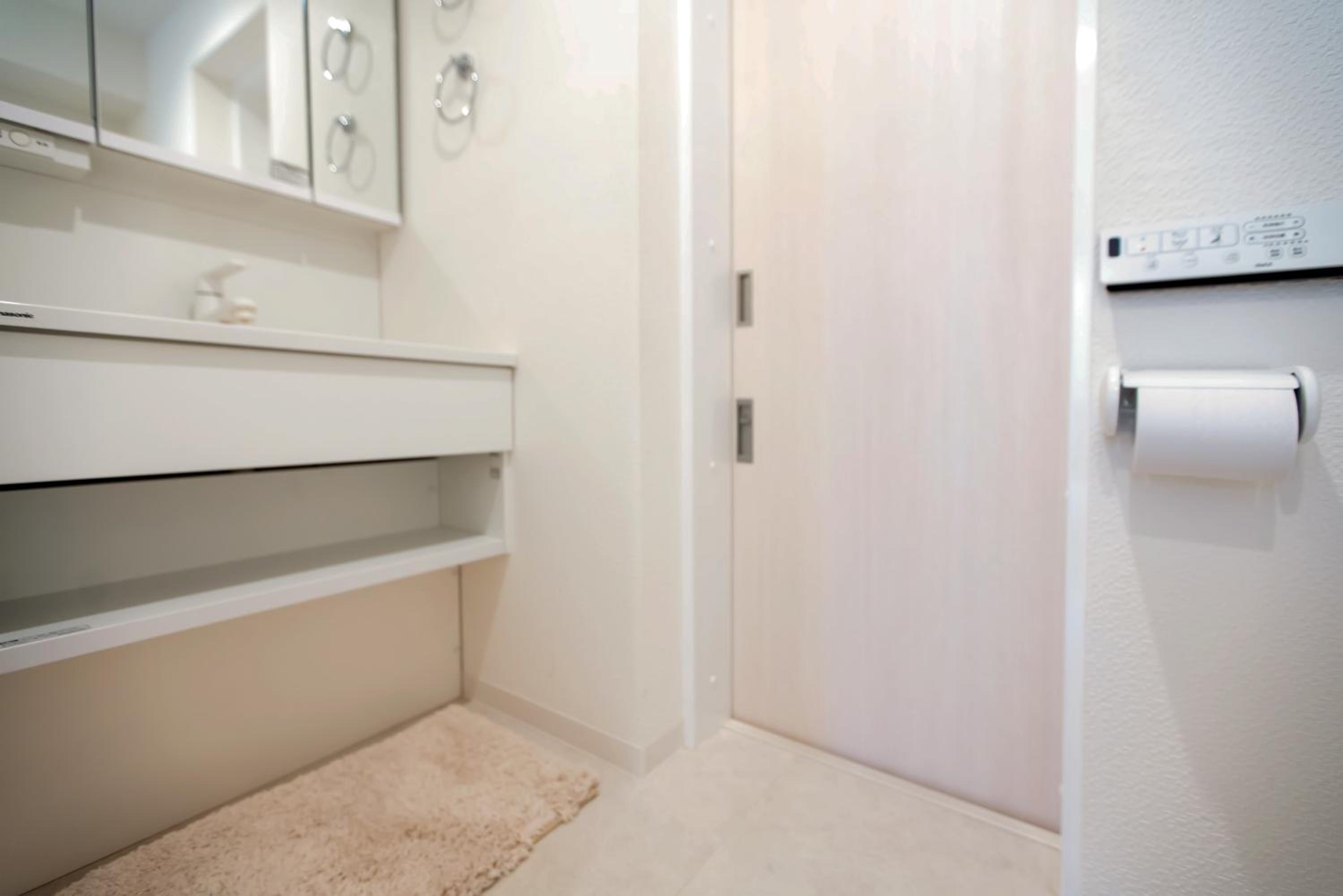③タオルの置いてある棚を開けようとしたら脚が外れて前に倒れてきました、壊れています、危険です