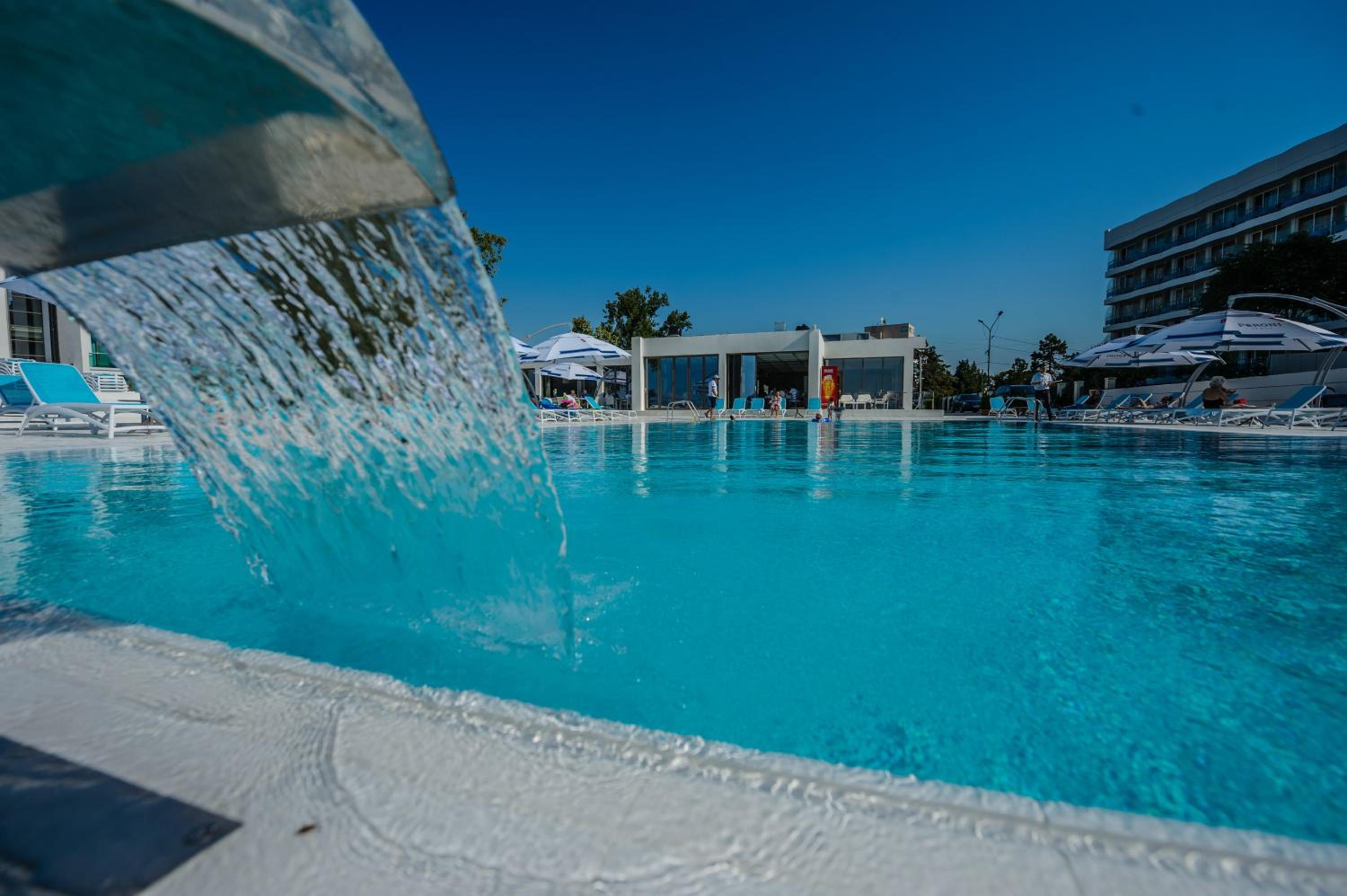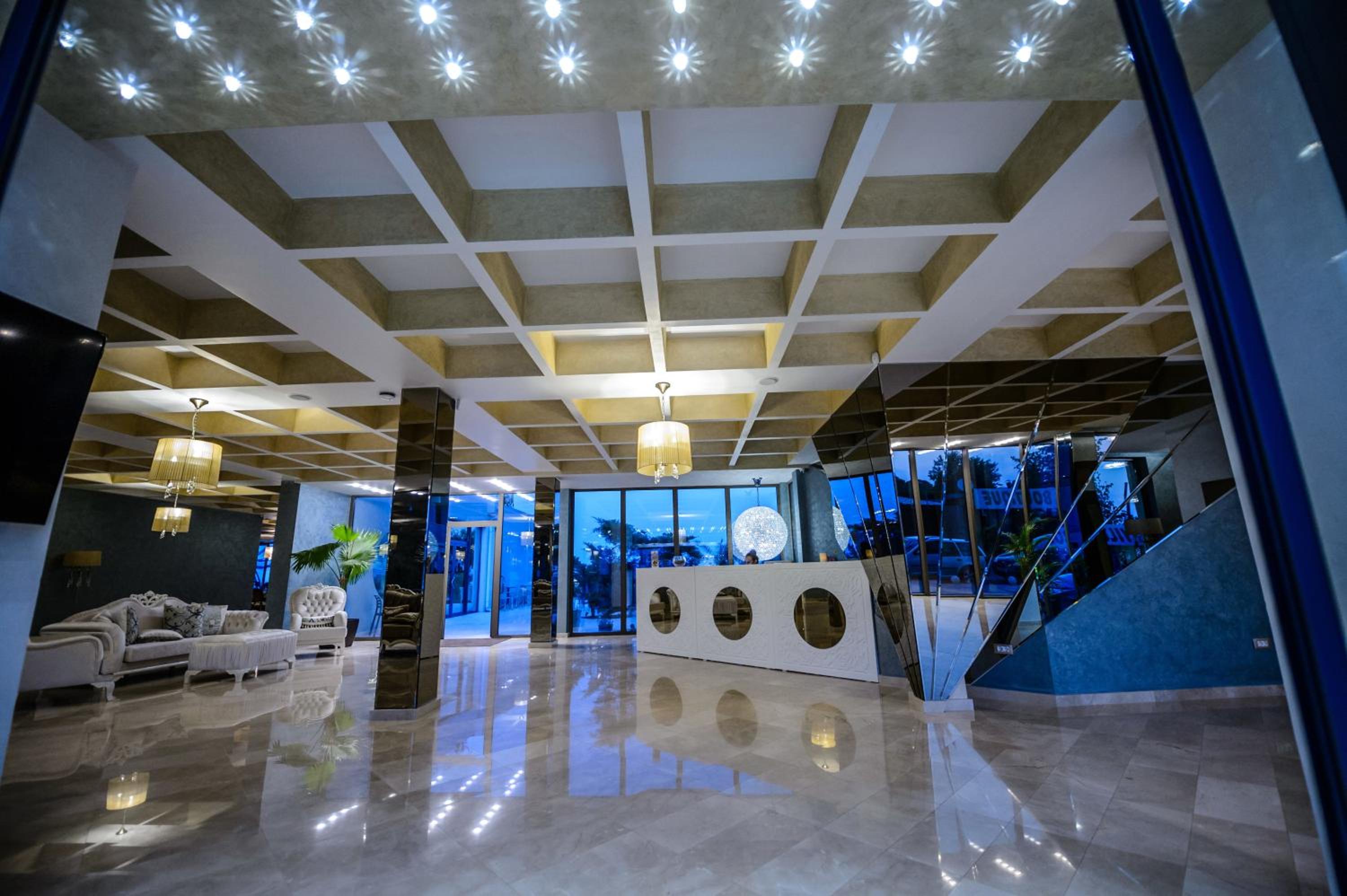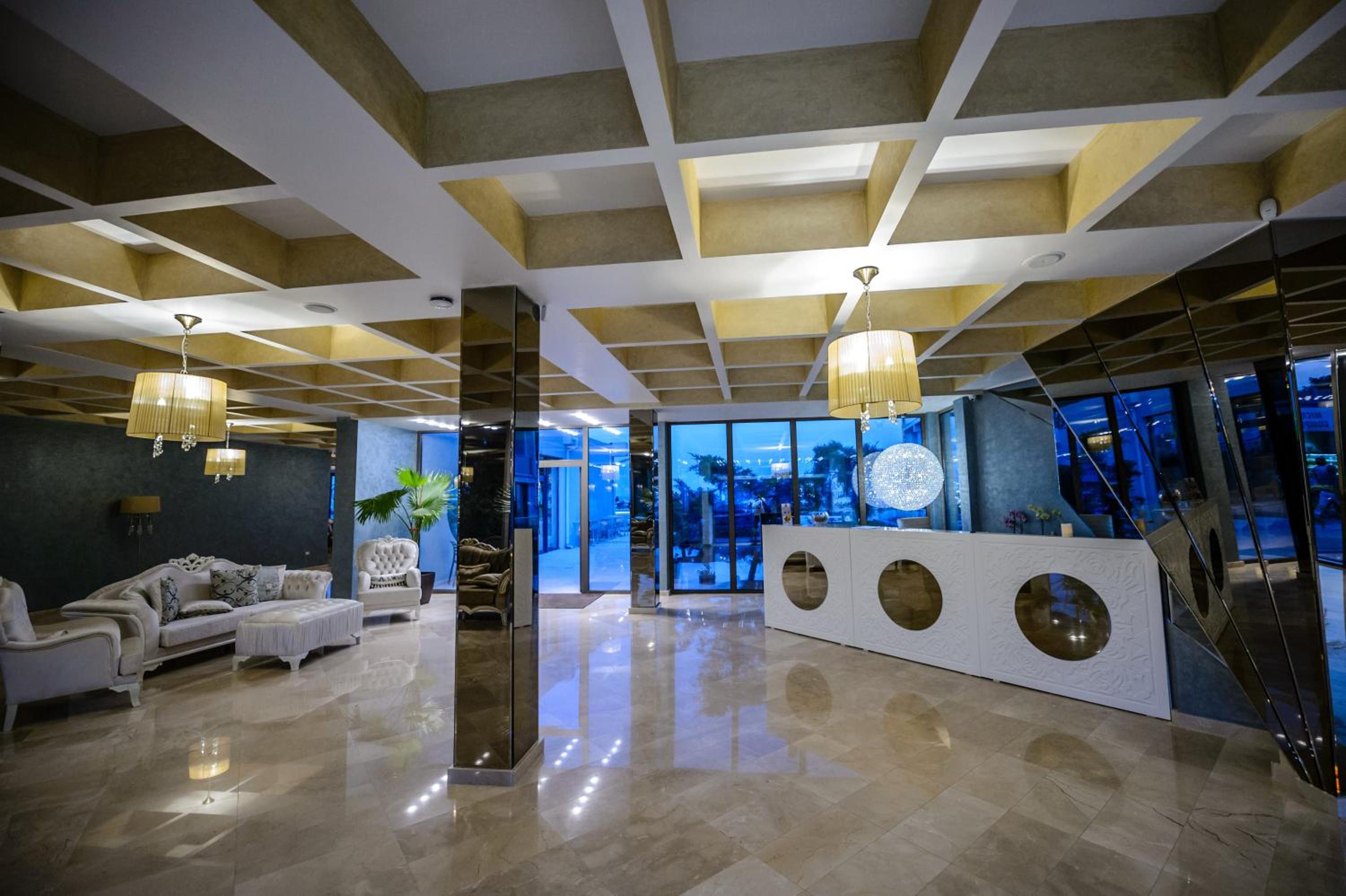 View ul hotelului noaptea, amplasarea langa mare,mâncarea diversificata și proaspătă in fiecare zi,piscina pt copii cu apa caldă; divertisment pt copii, pt adulți.