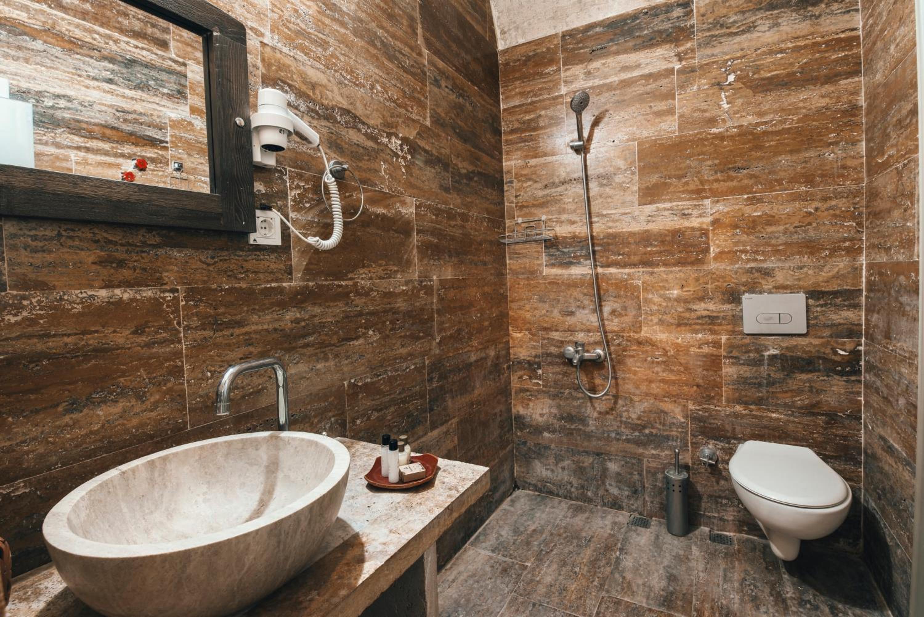 The room itself was dark, and the “cave-style” design felt more fake than charming. The humidity in the room was unbearable — the walls were wet, and some lime residue even got onto my clothes in my bag. There was no wardrobe or any safe, proper place to store luggage or hang clothing, which made things even more inconvenient.