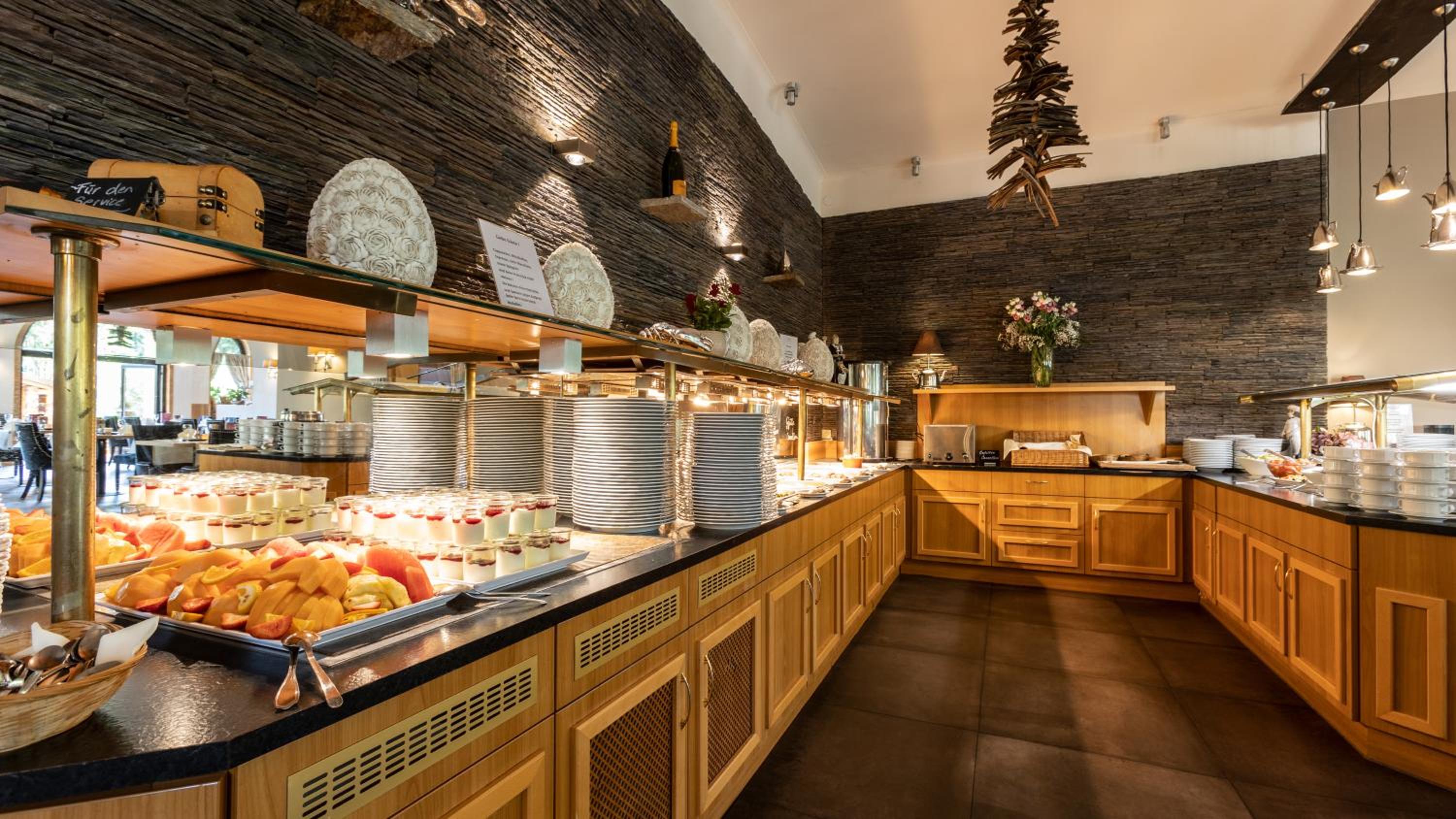 Wir waren oft auswärts essen. Haben aber einen Abend im Restaurant gegessen. Es gab ein Buffet zum selbst bedienen. Unverhältnismäßig teuer. Das Essen war auf Kantinen-Niveau. Etwas enttäuschend.
