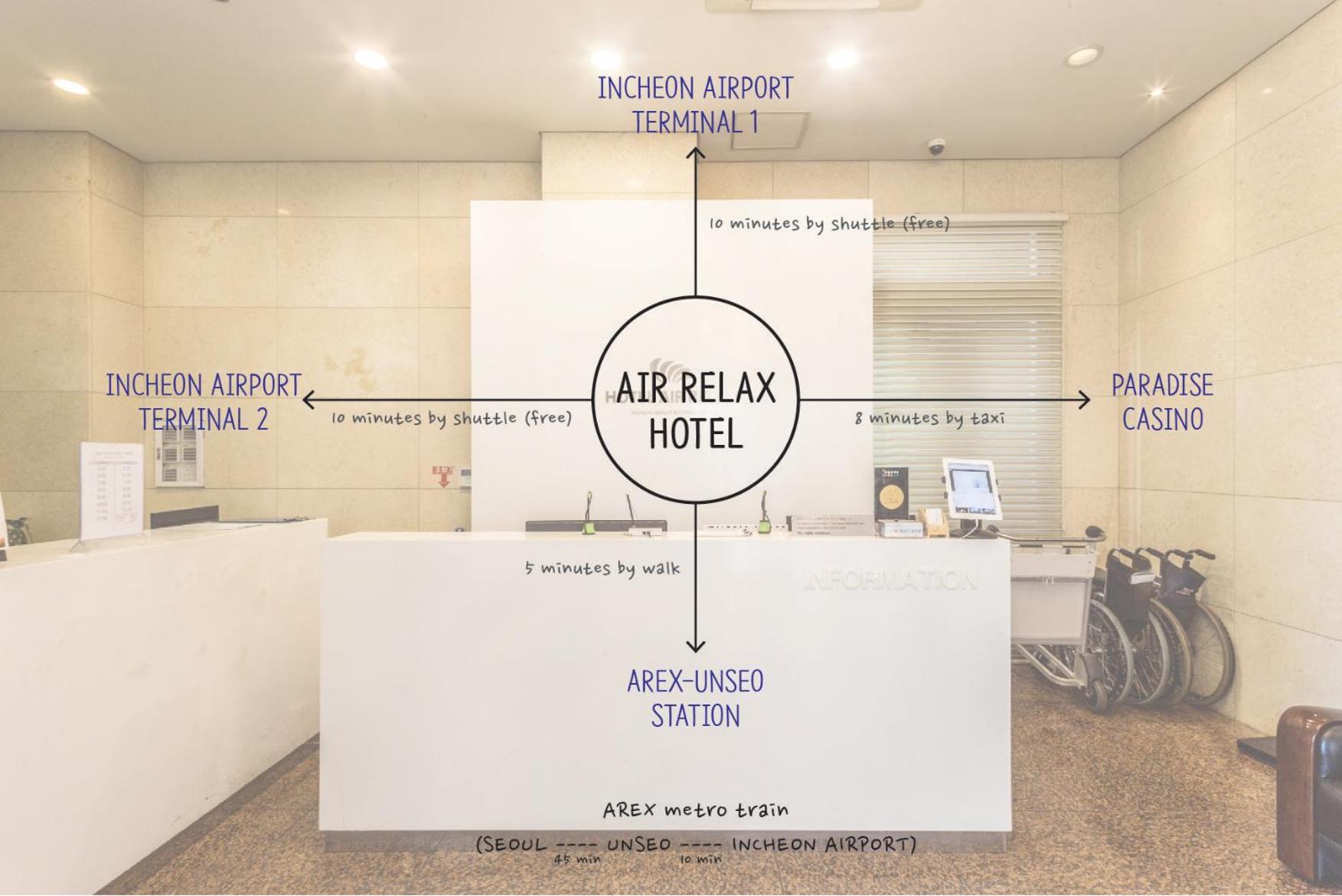 Hotel Air Relax, situated near Unseo Subway Station, offers a blend of comfort and accessibility. Just a short drive away from Incheon International Airport and Sky 72 Golf Club, our location makes traveling a breeze.