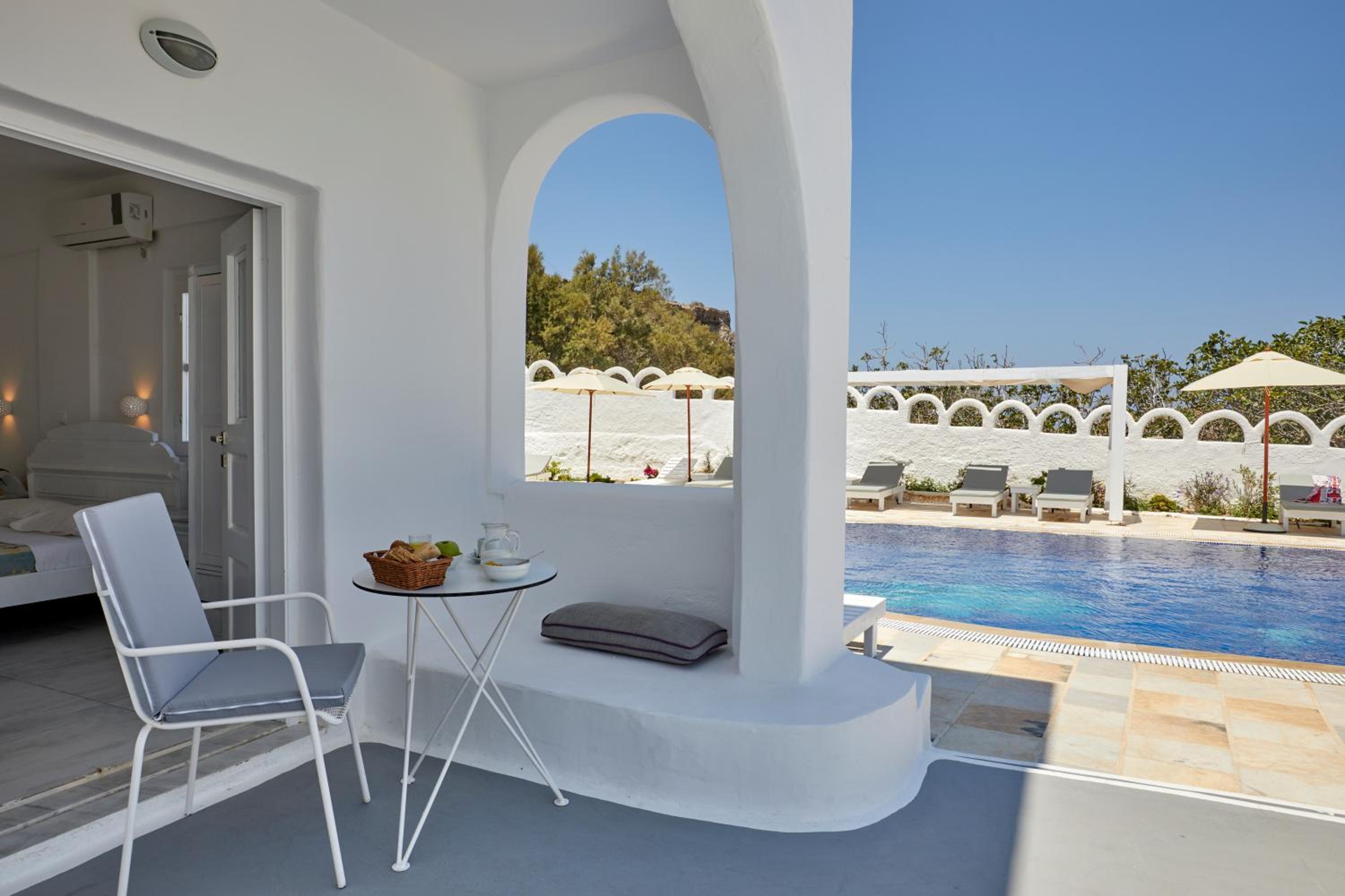 Unwind by the seasonal outdoor swimming pool or take a leisurely stroll to Caldera Beach just 800 meters away. The hotel's terrace provides a serene spot to enjoy the stunning views of the surrounding area.