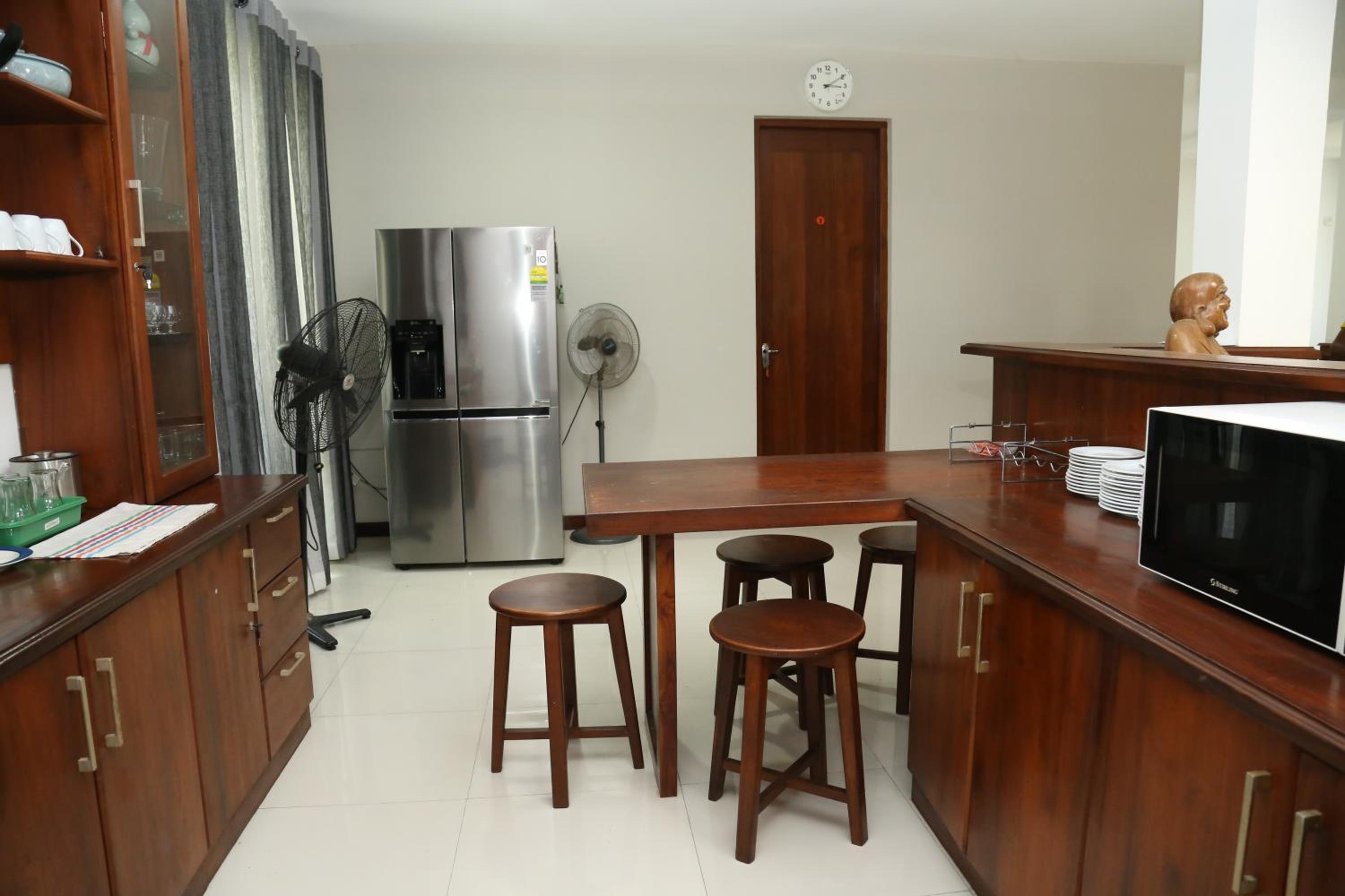 One thing to note is that while the photos show a kitchen, it isn’t really available for guest use. That said, there is access to a refrigerator, microwave, and a small common area with tea, coffee, and creamer provided. Having full tea/coffee amenities would make the stay even better.