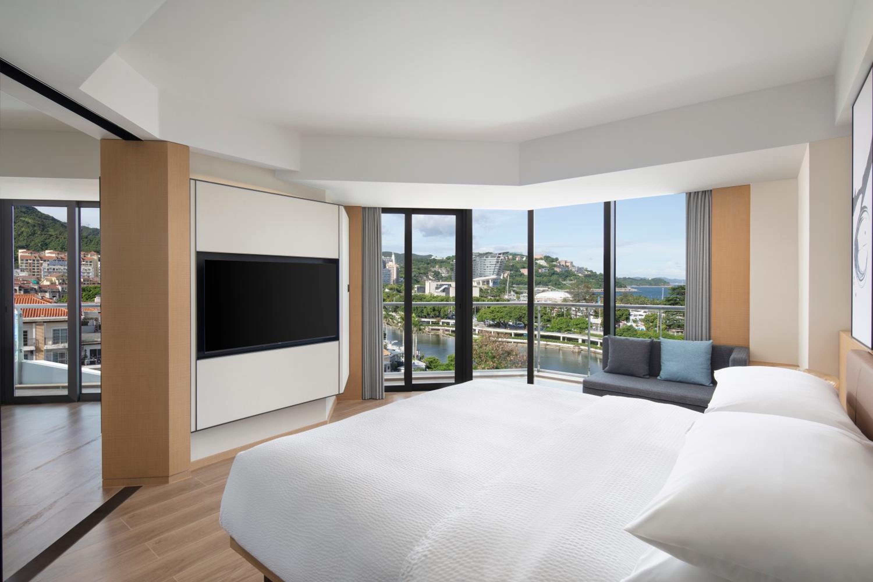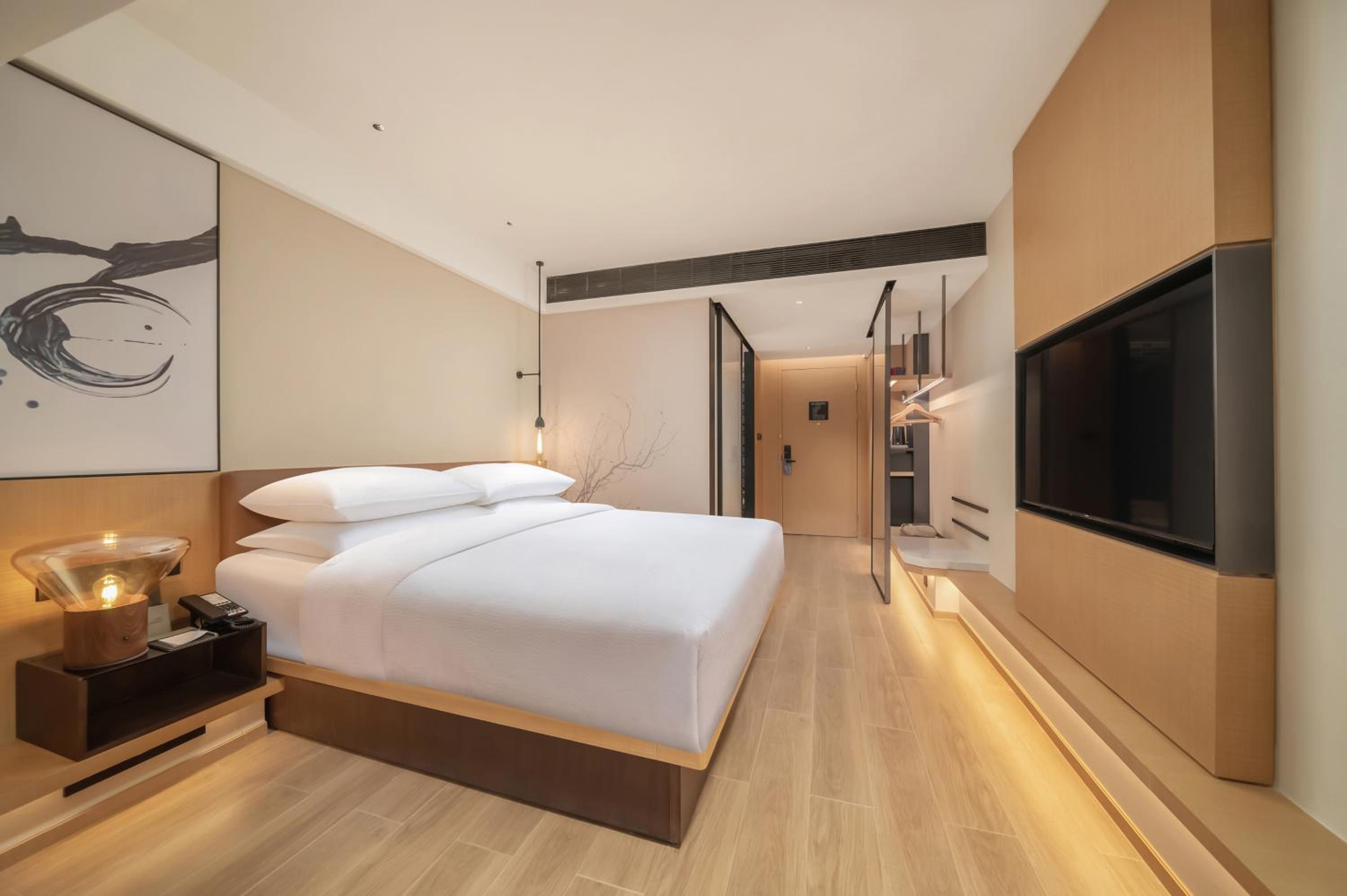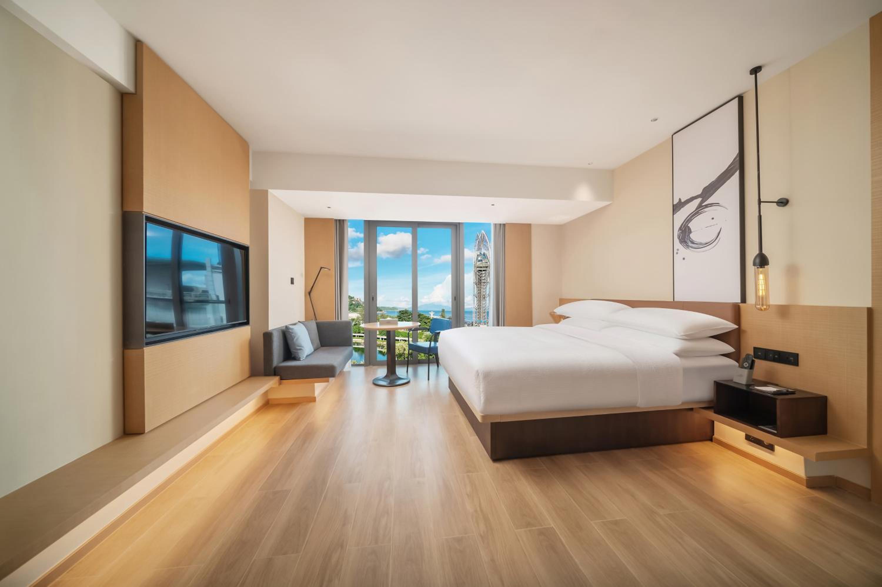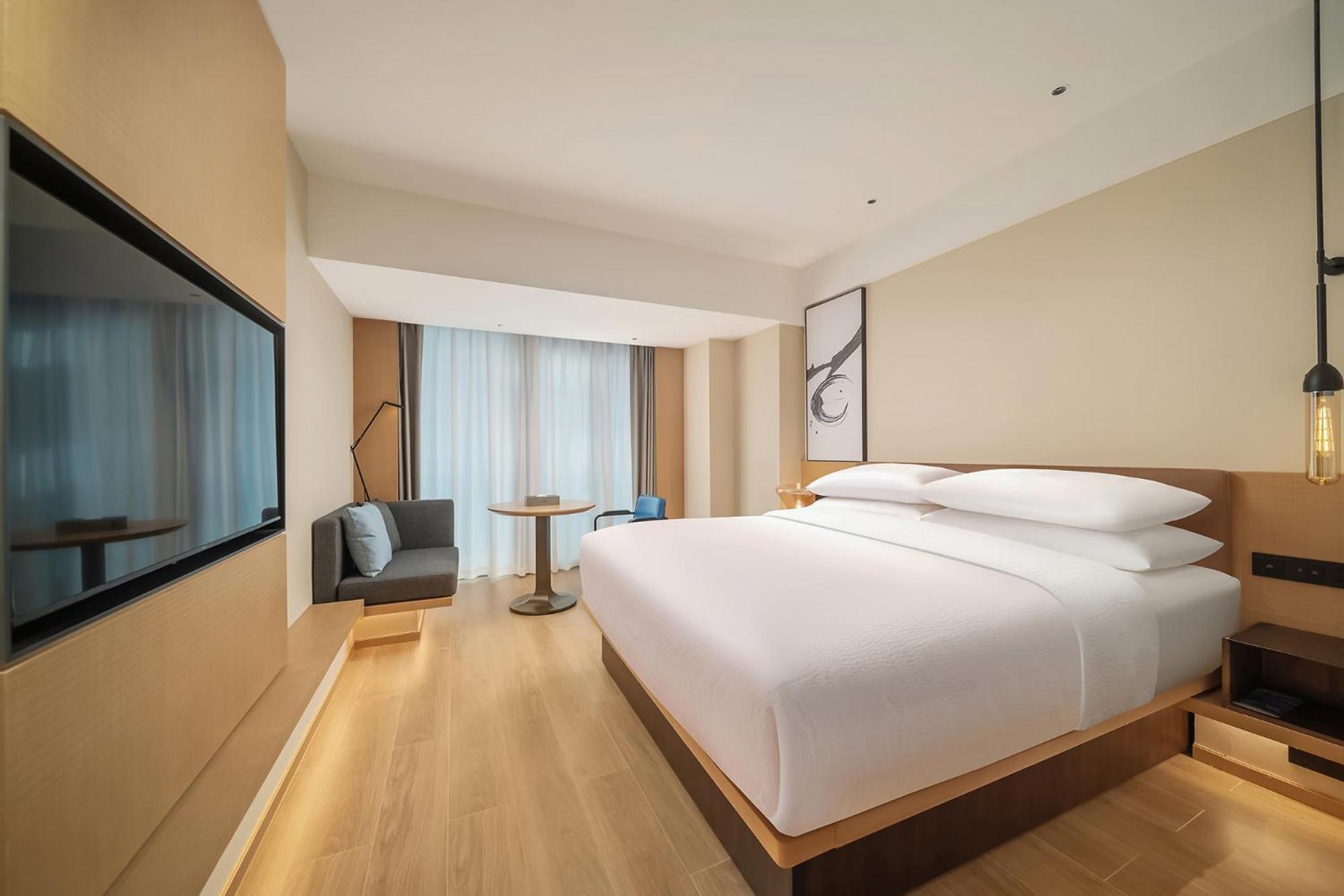Номер был отличный, с балконом. Вид на речку и озеро. Там идёт ремонт мостиков, иногда было шумно, но не каждый день. Очень понравился интерьер отеля и номера, красиво, уютно, чисто, современно. В номере каждый день бесплатно две водички, две газировки в холодильнике, чай в пакетиках. Если любите шоколад и сладкое - берите с собой из дома, китайцы это не едят и почти нигде не продается. Чаевые в Китае не оставляют, их не берут. Также если есть проблемы с палочками для еды, берите вилку, вилок нигде нет, кроме отеля.