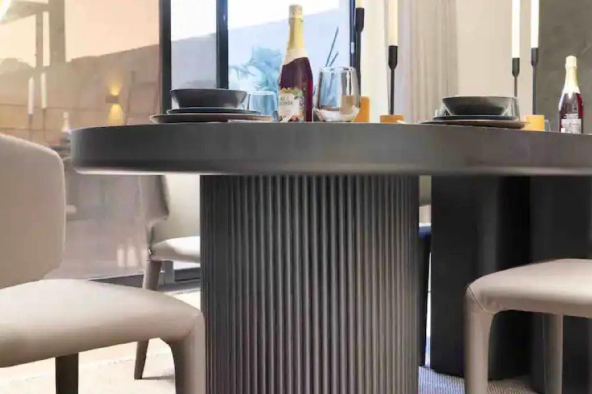 Enjoy the convenience of a fully equipped kitchen with a fridge, kitchenware, and dining area in each air-conditioned unit.