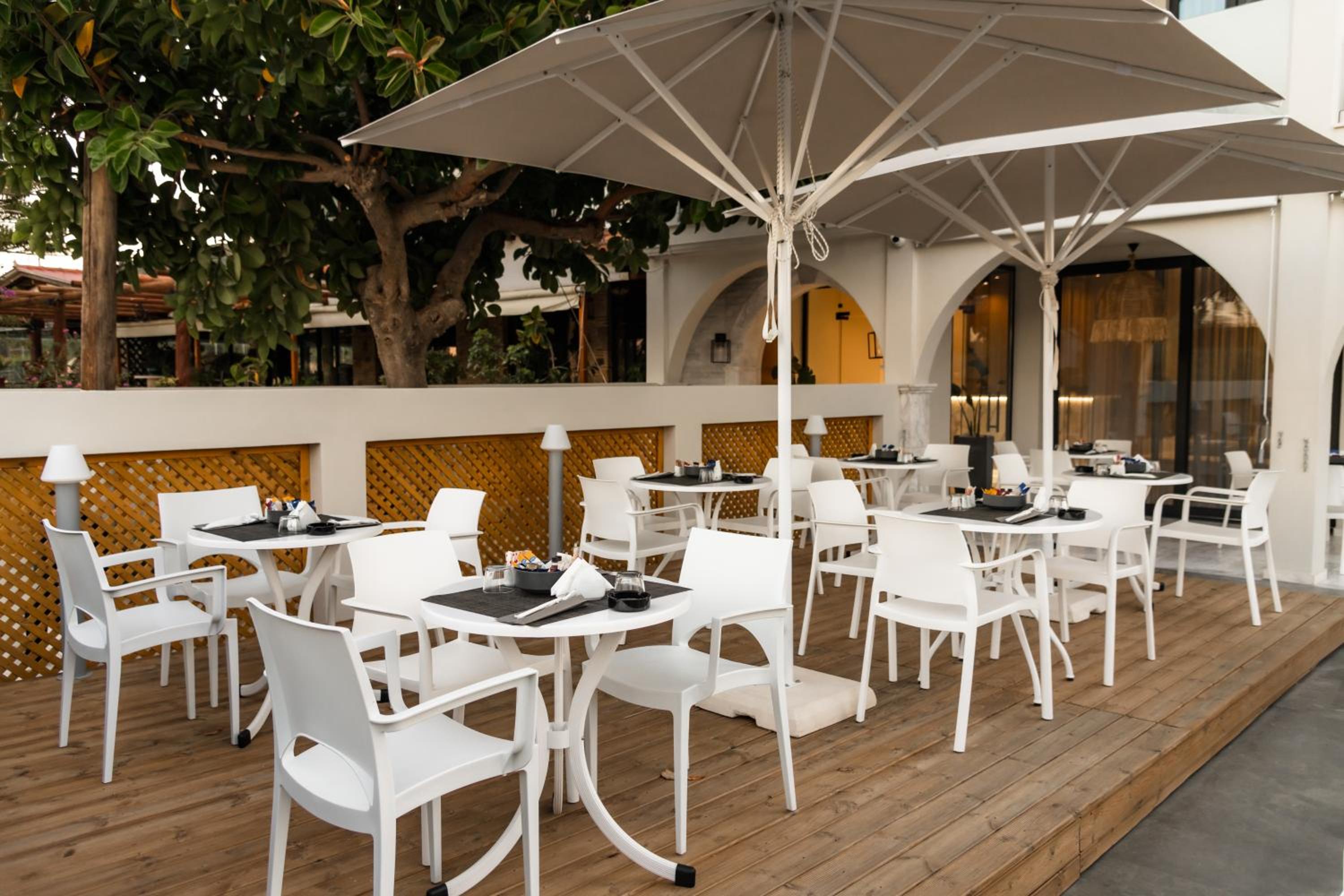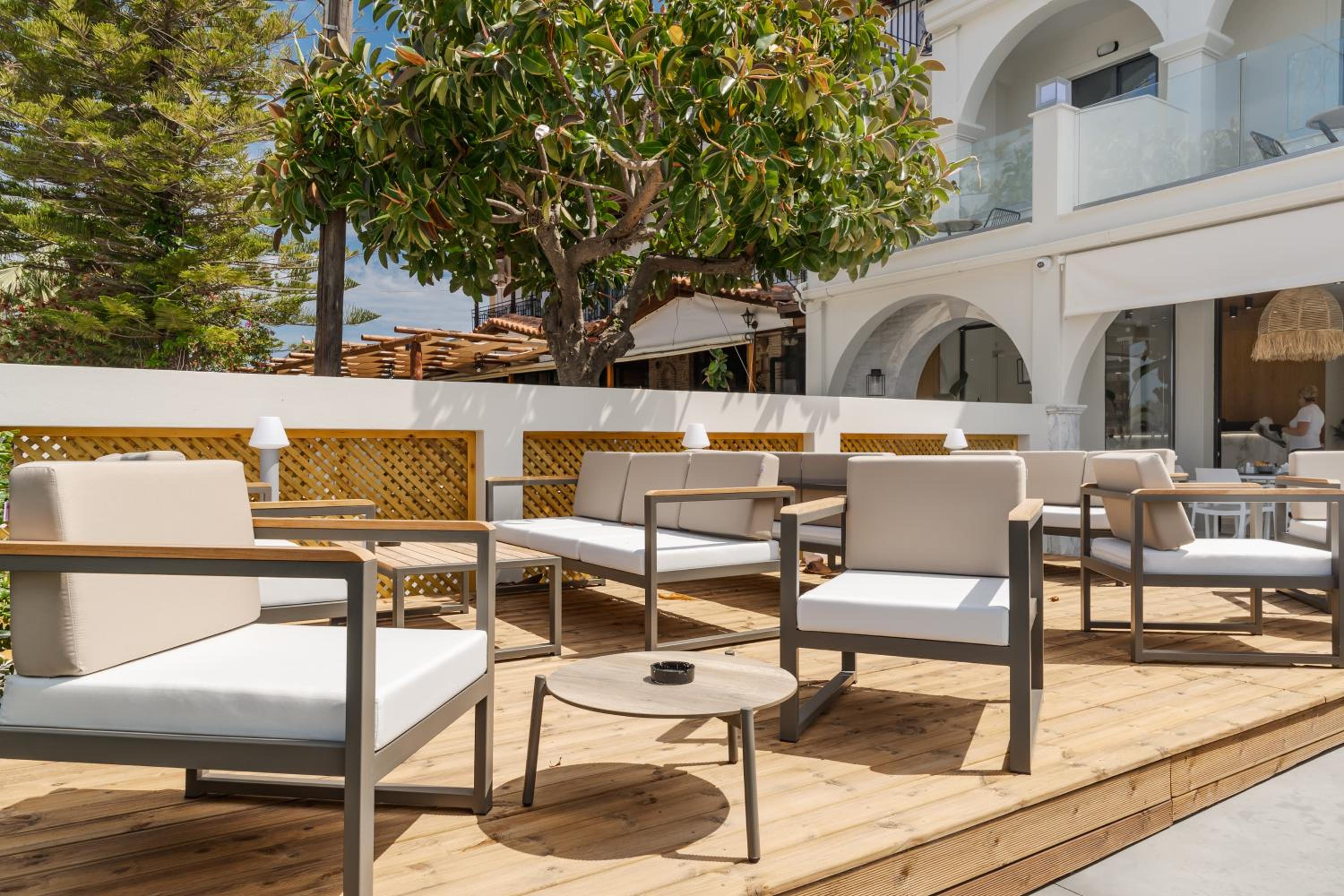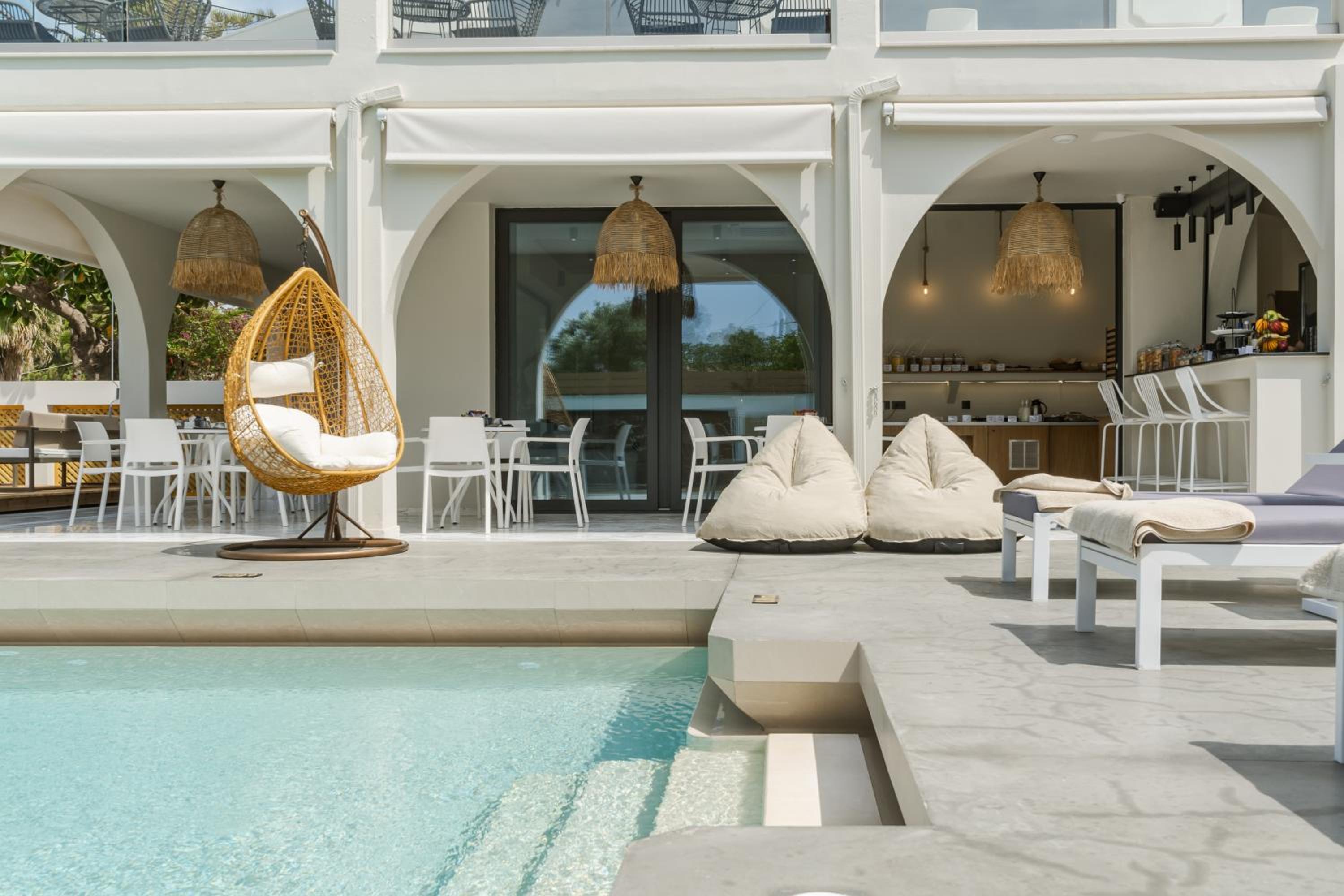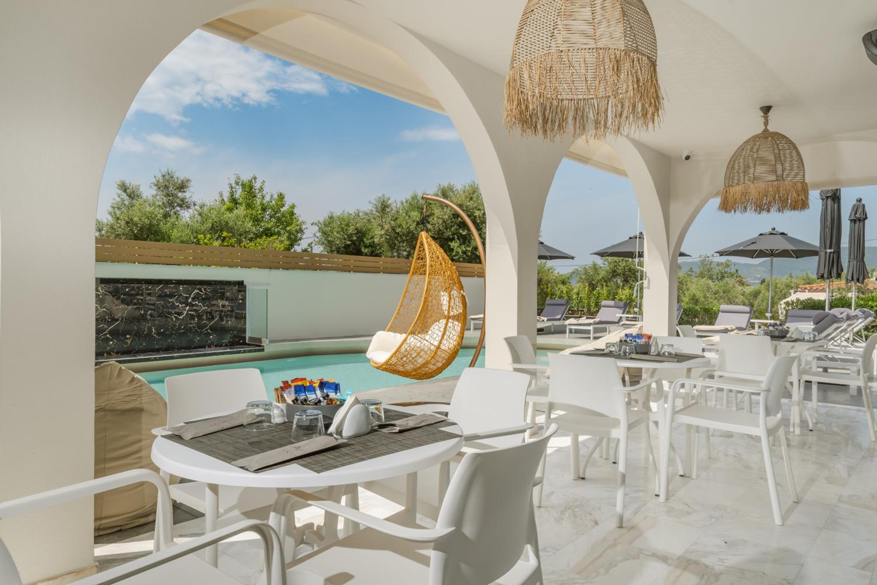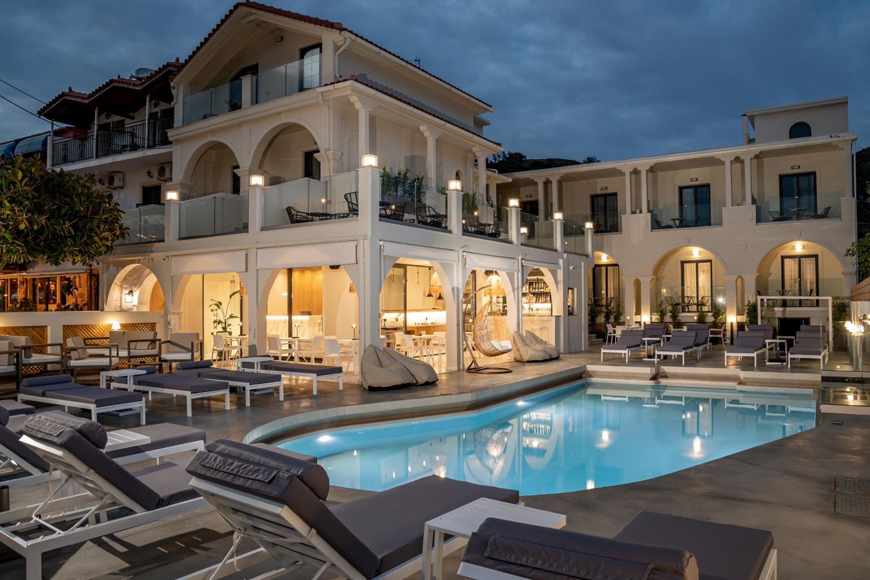 Guests can unwind in the hotel's seasonal outdoor swimming pool or hot tub, surrounded by a beautiful garden. The option of bike and car hire allows visitors to explore the picturesque surroundings or head to nearby beaches like Crystal Beach and Kalamaki Beach.